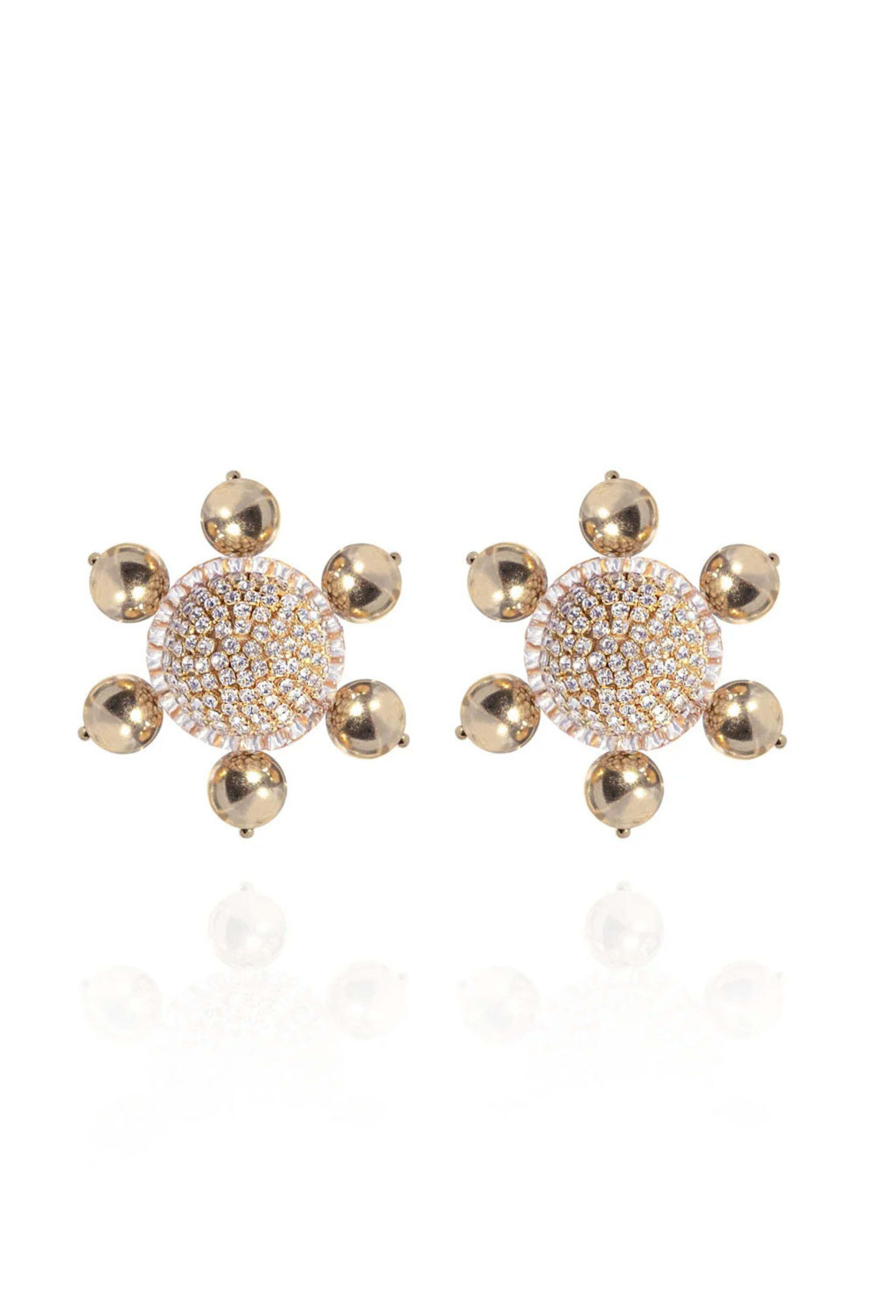 Jolie Clip-On Earrings in Gold. Gold-plated stainless-steel beads. Crystal rhinestones. Wood base. Gold stainless steel clip on backing. Made in USA.