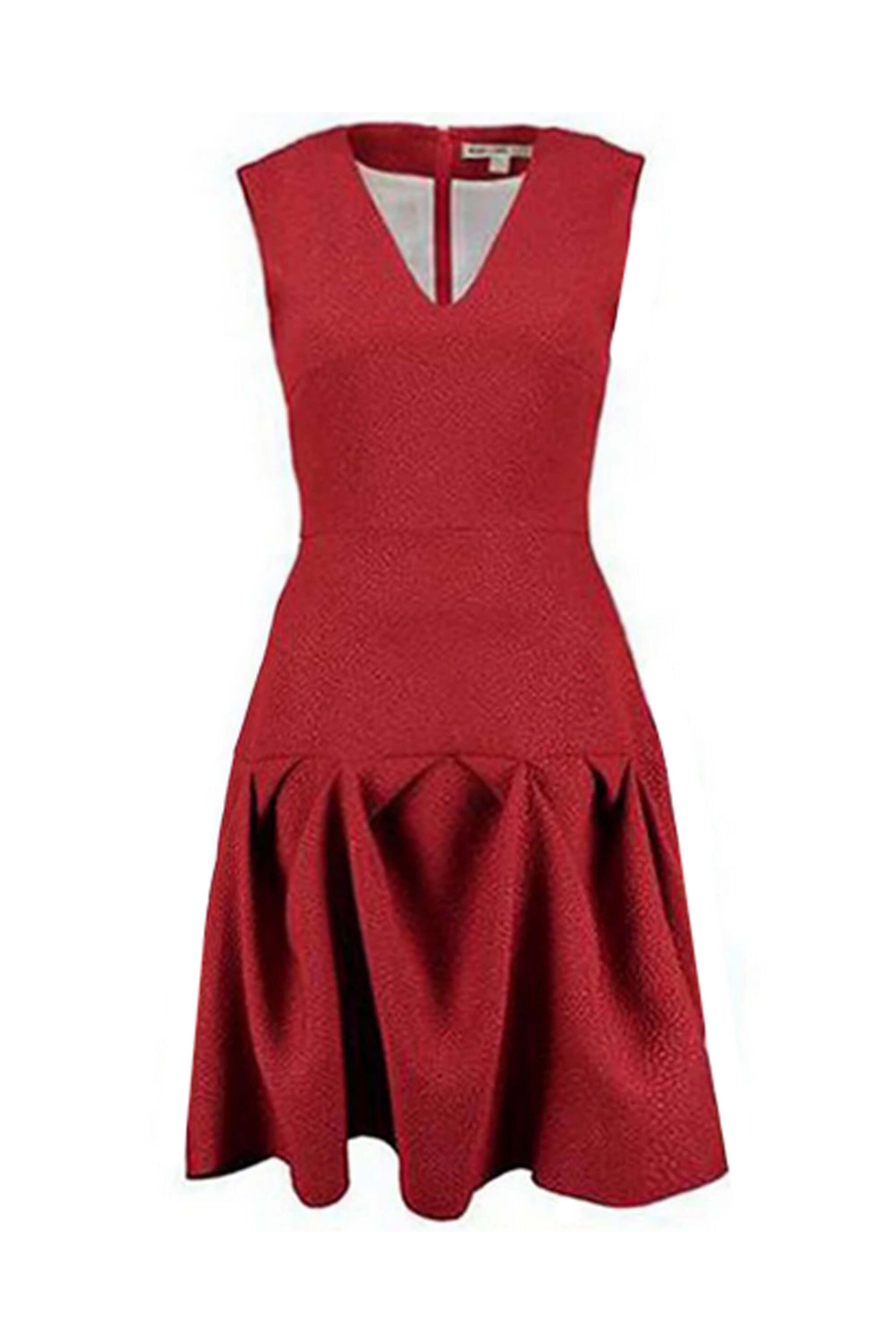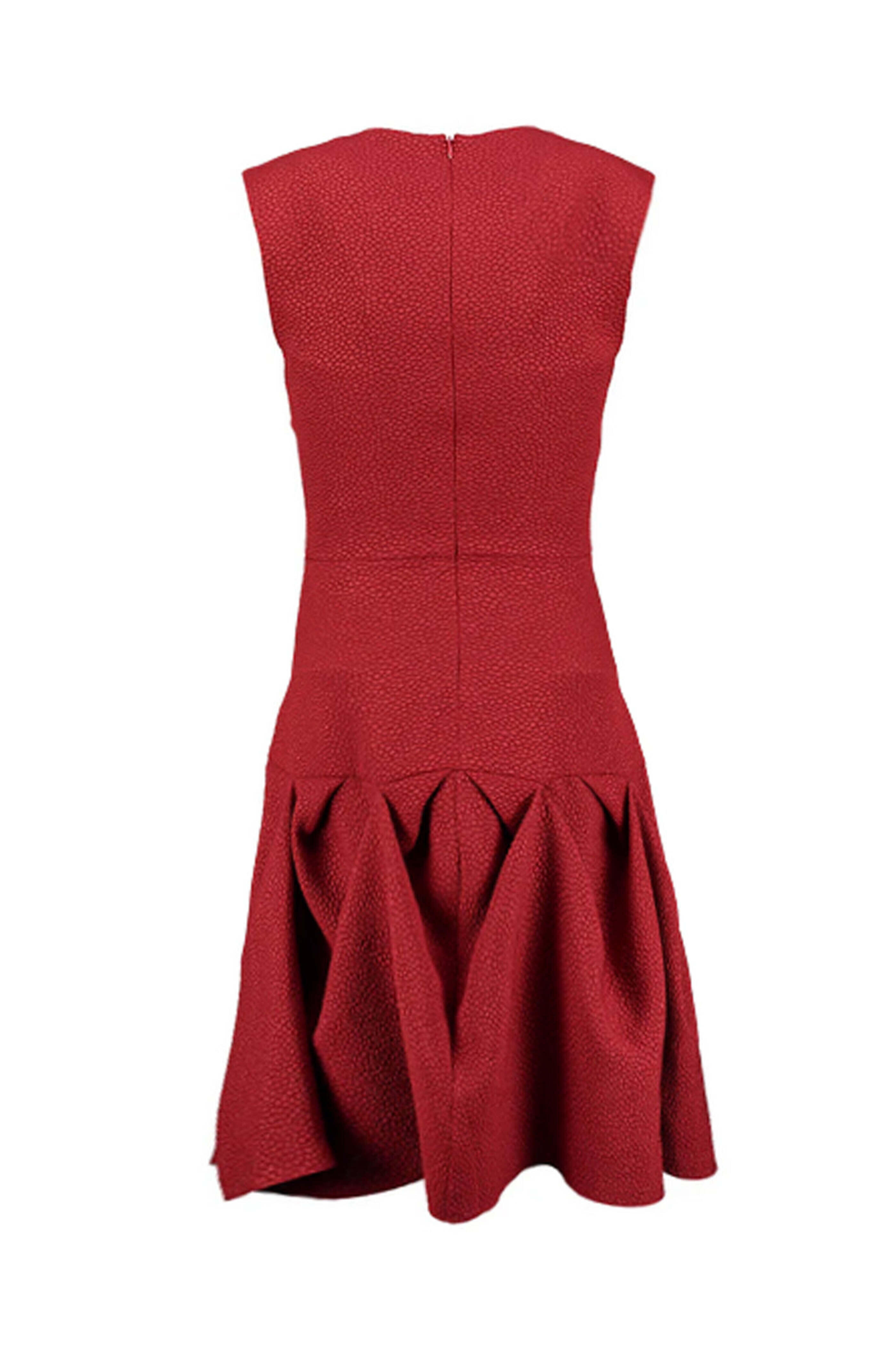 Edeline Lee Red Bubble Jacquard Prado Bubble Dress. V neck. Sleeveless. Concealed back zip closure. Slim silhouette. Drop waist; bubble hem. Mini to knee length. Bubble jacquard fabrication. Lined. Made in England. 96% polyester, 4% elastane outer, 100% viscose lining.