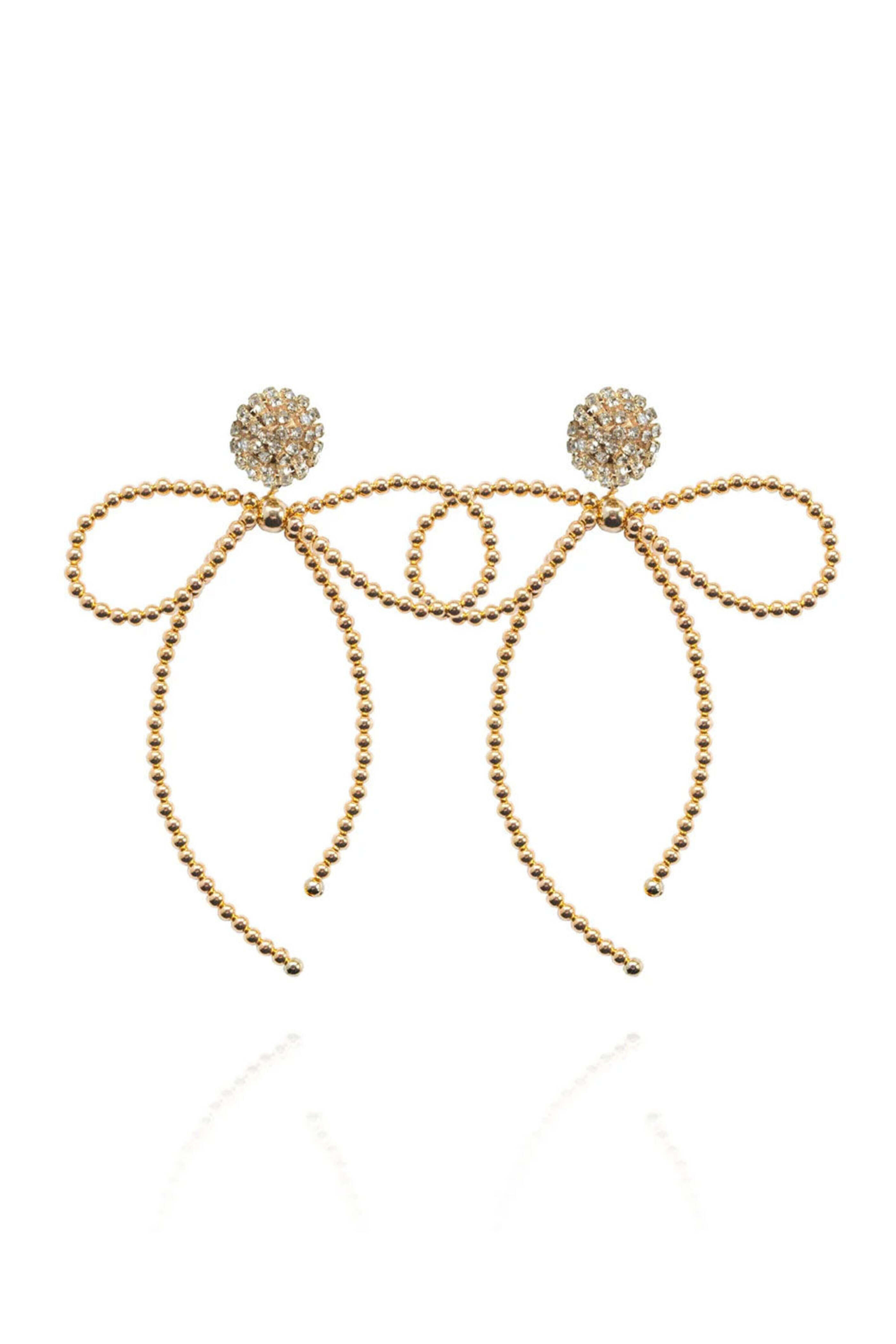 Lucia Earrings in Gold. 24K gold plated stainless steel beads. Crystal Rhinestones. Wood base. Stainless steel hardware. Bow design. Push backs . Made in USA.