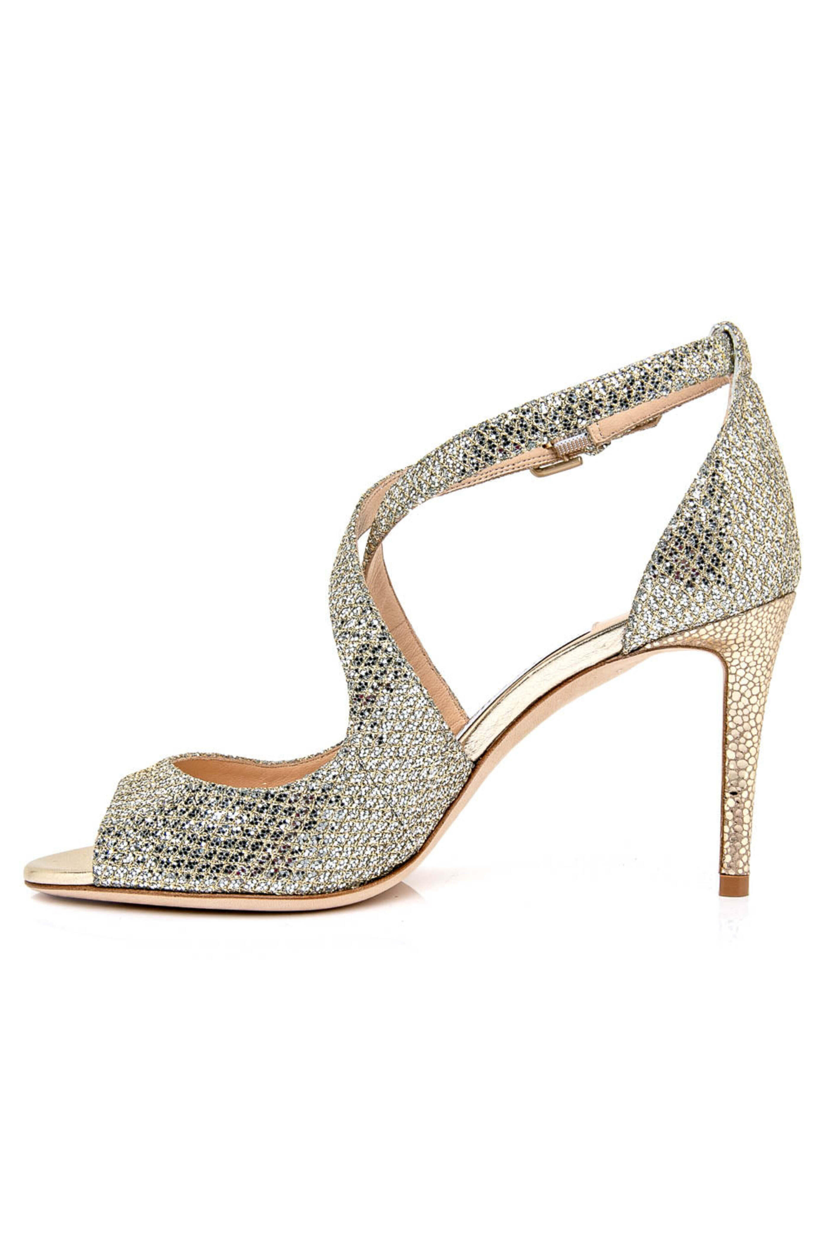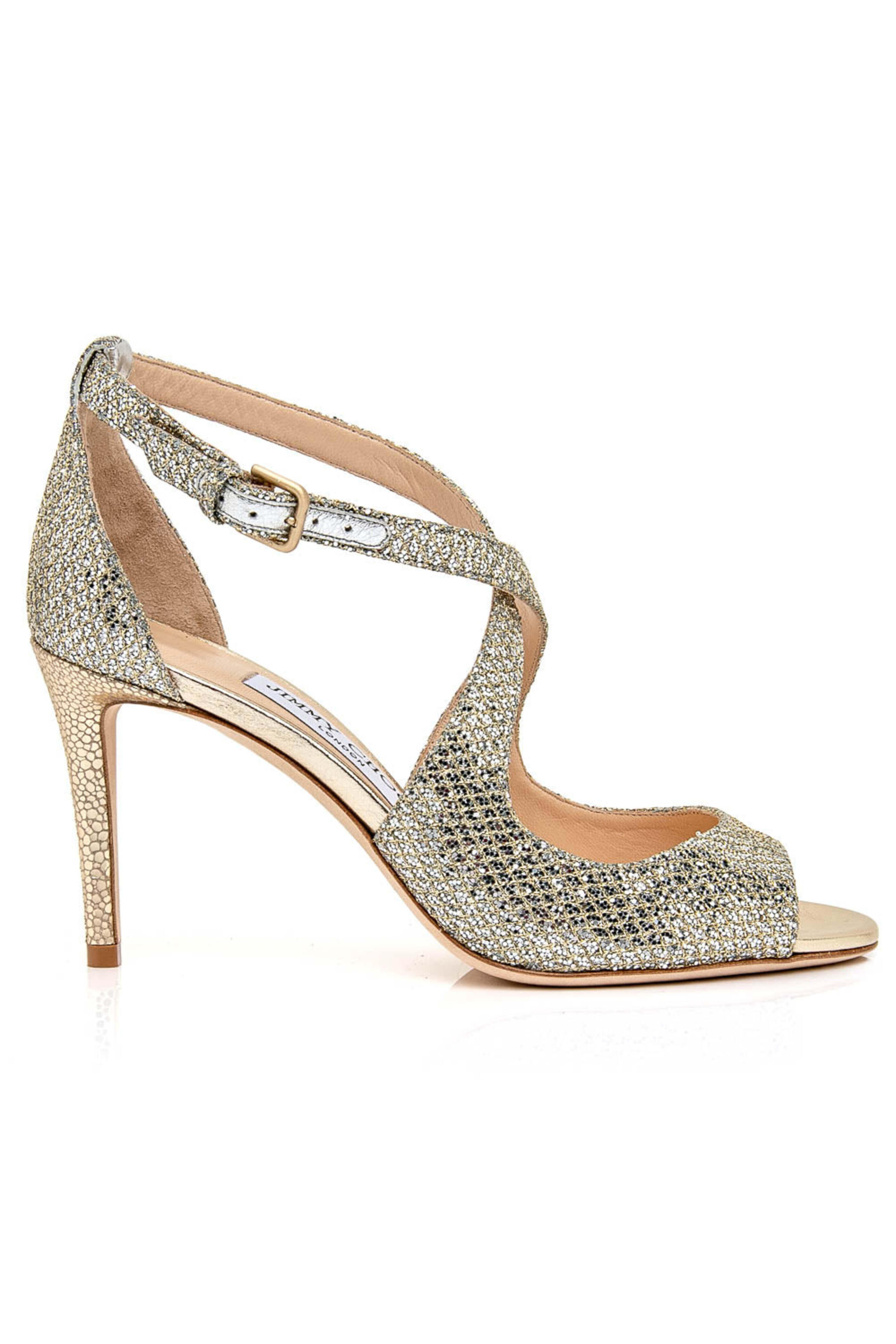 Jimmy Choo Emily Heel in Champagne. Glitter fabric upper. Peep toe. Adjustable ankle straps with buckle fastening. Crisscross straps. Leather lining, sole, and insole. Padded footbed. Tonal stitching. 85mm heel. Made in Italy.