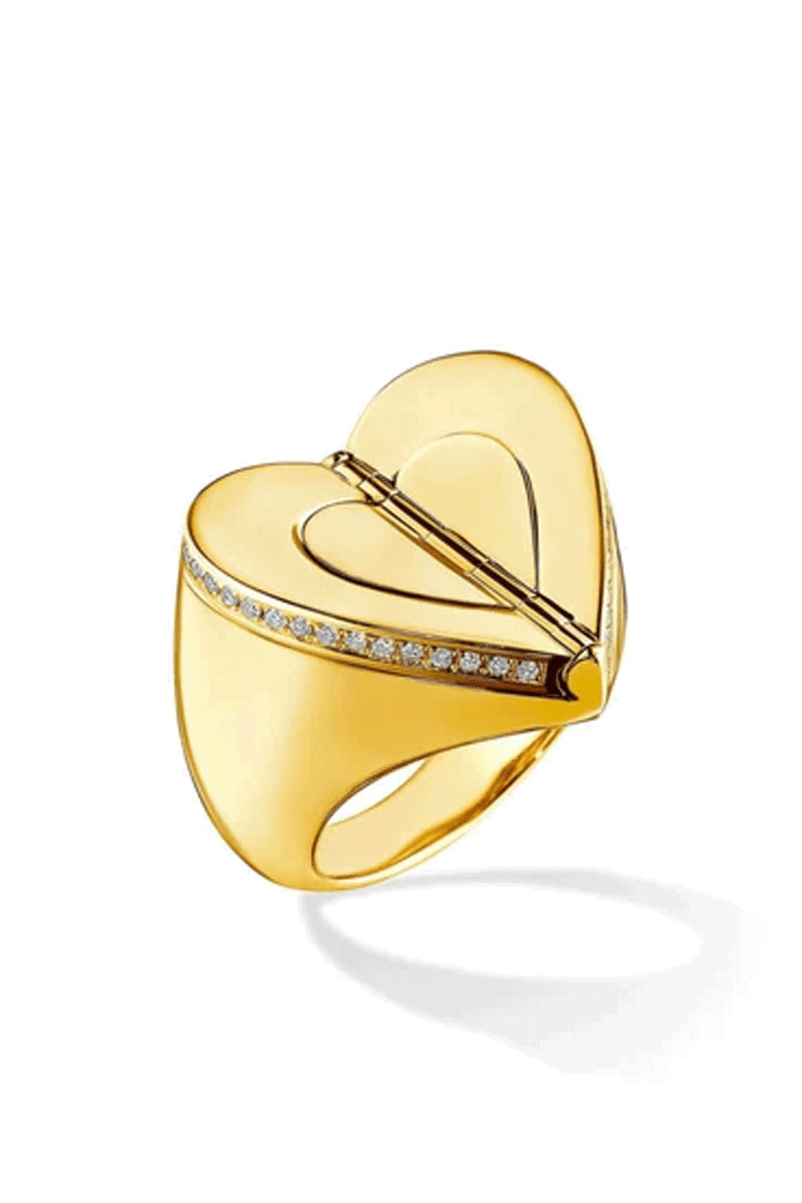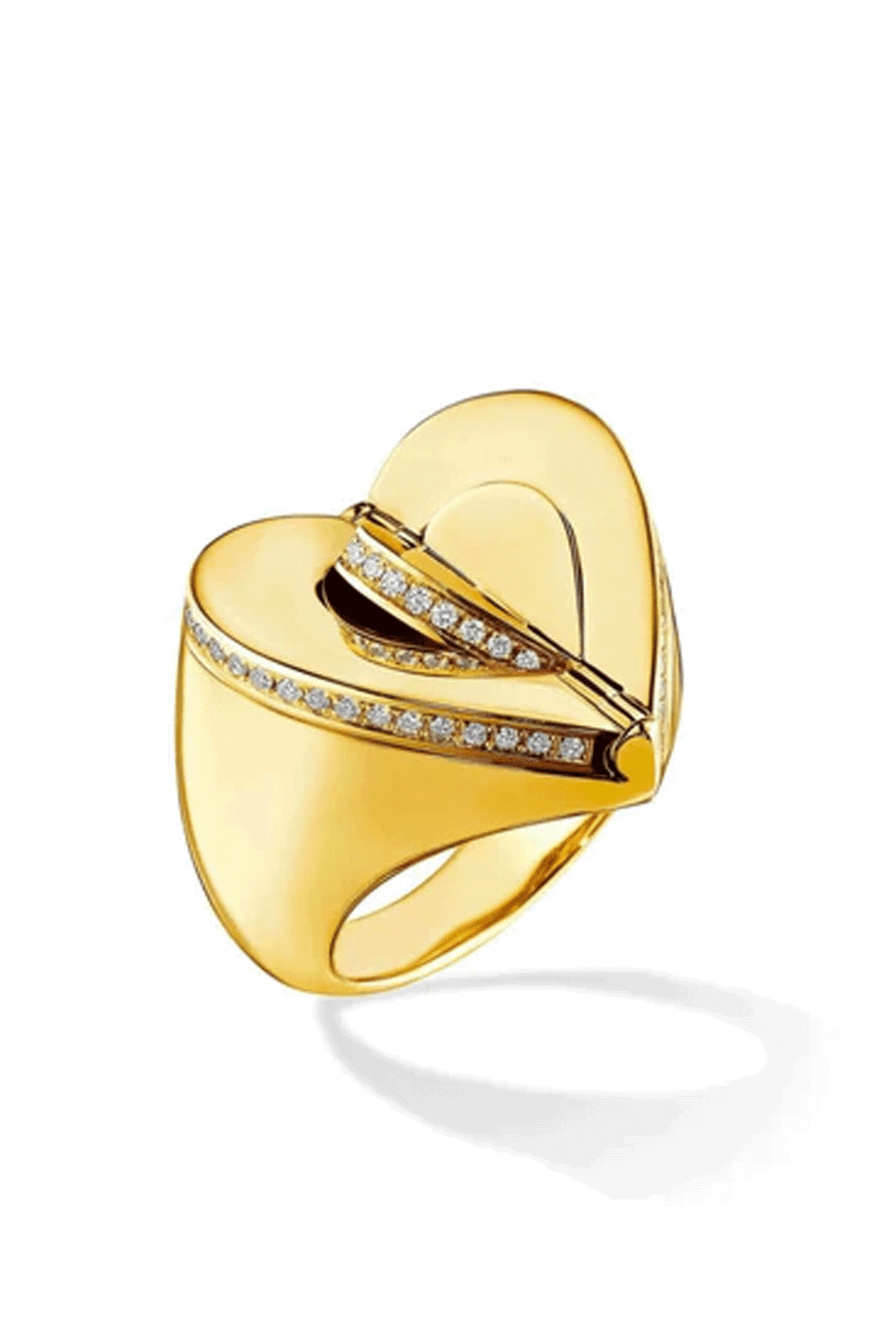 18k yellow gold. Diamond 0.24 total carat weight. Pavé white diamond. Heart design. Inspired by the sensation of lovestruck butterflies. Made in Italy. 0.7 W x 0.7 L. Ring size: 4.75.