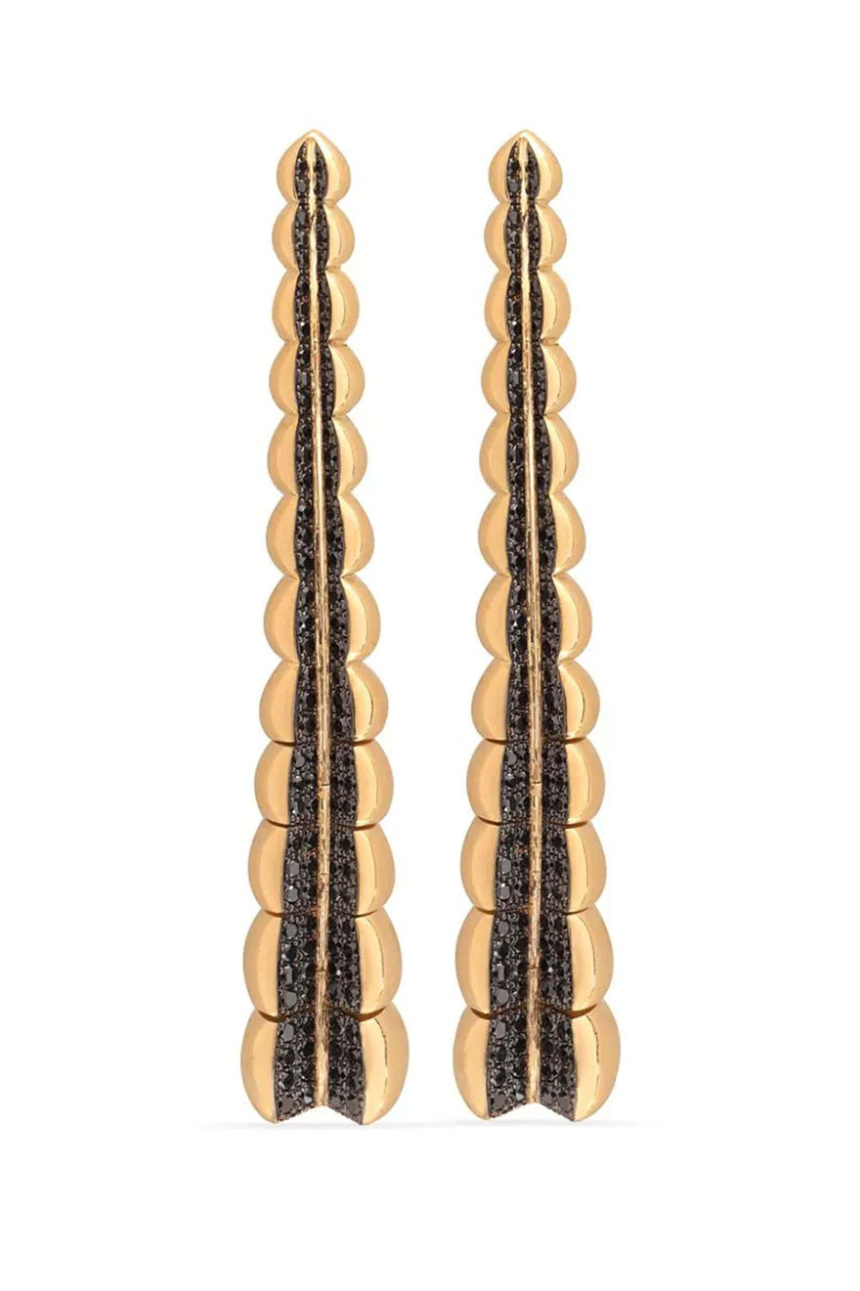 Gaelle Khouri Divergence Diamond Earrings. 18k yellow gold. Black diamond 1.5 total carat weight. Graduated drop design. Sculptural three-dimensional design. Opens at the center like a geode. Center lined with black diamonds. Post back.