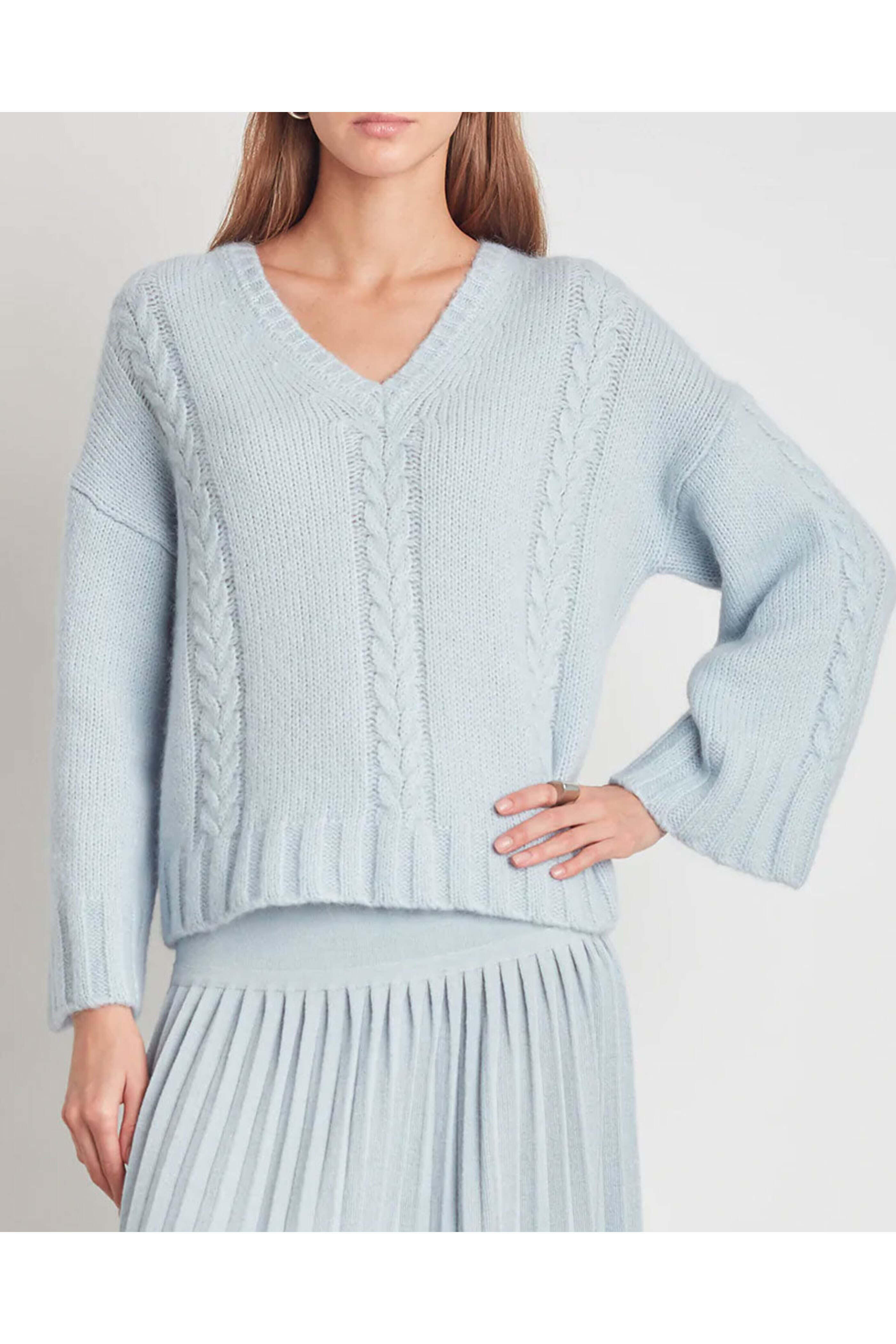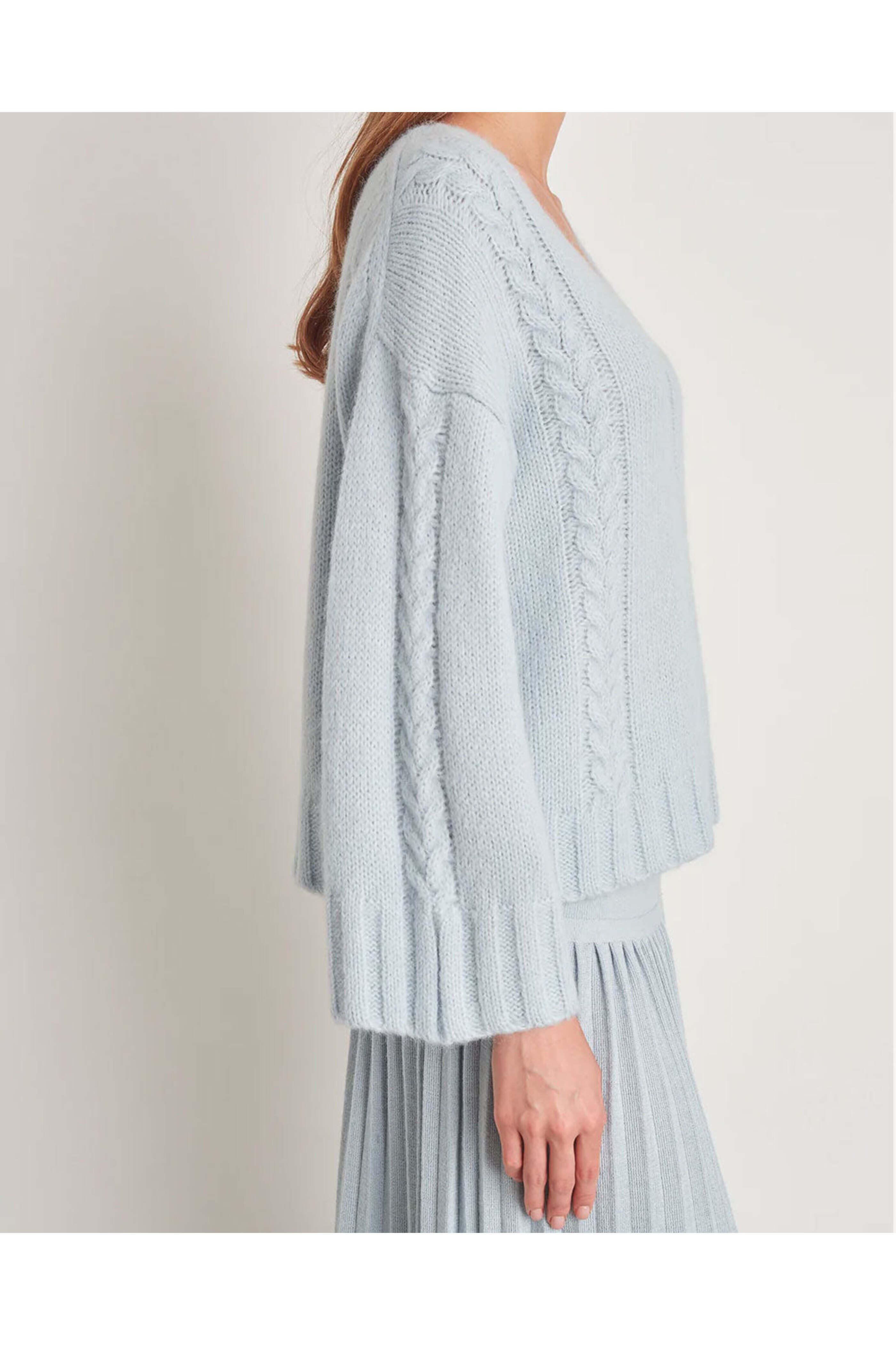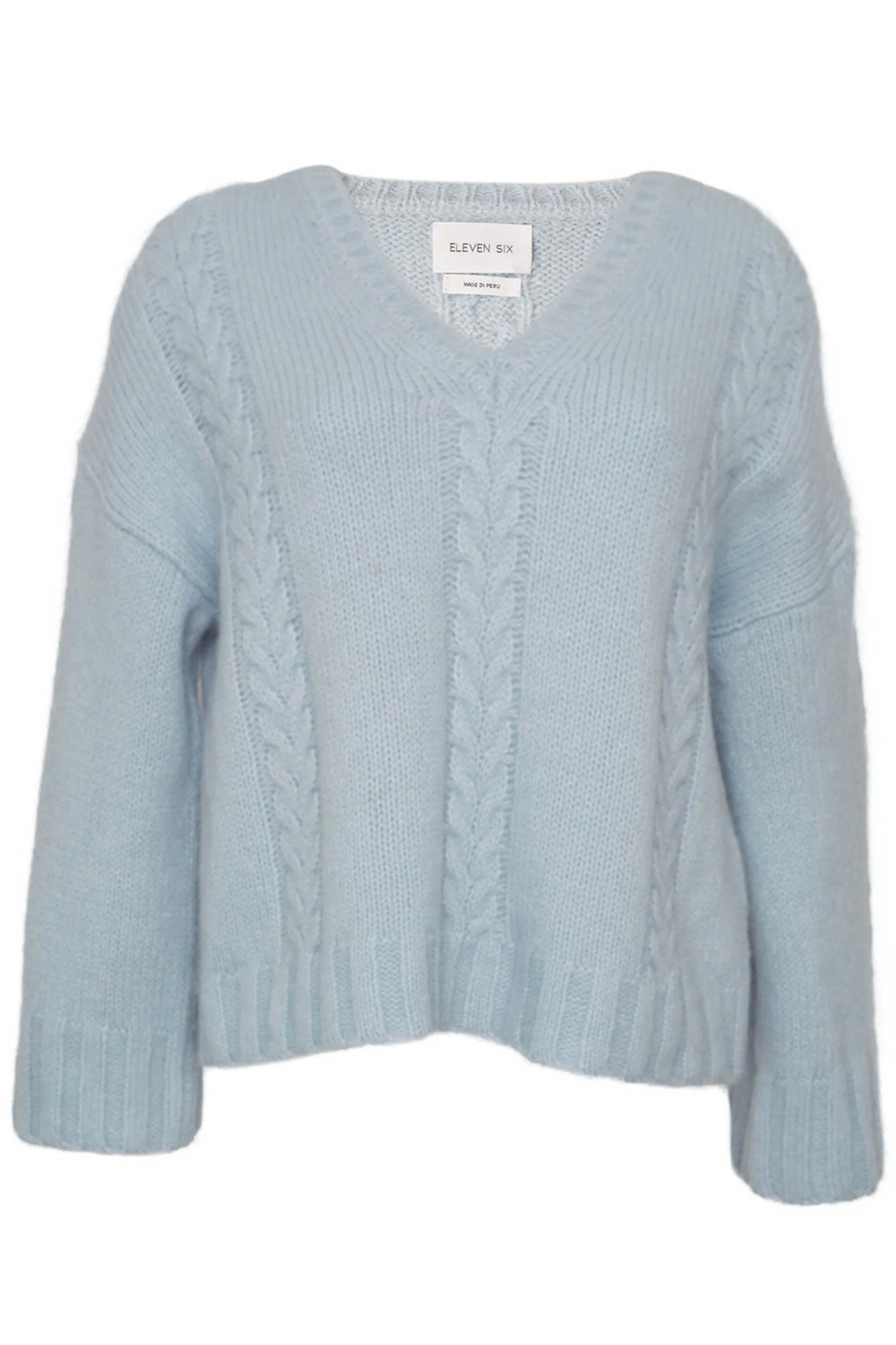 Eleven Six Powder Blue Avery Sweater. V Neck. Dropped Shoulders. Straight Sleeves. Cable detailing throughout. Boxy silhouette. Relaxed fit. 89% Baby Alpaca, 11% Polyamide.