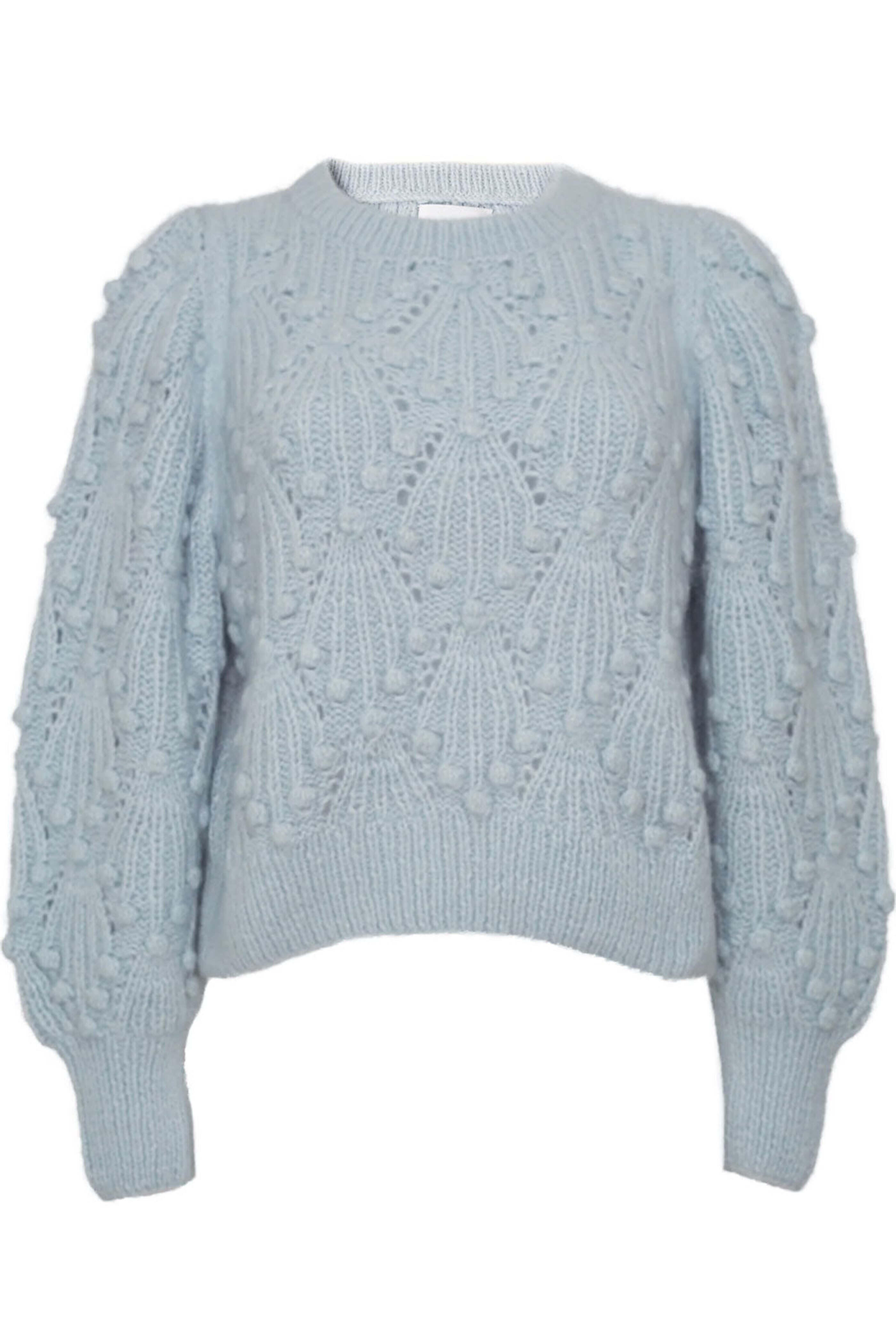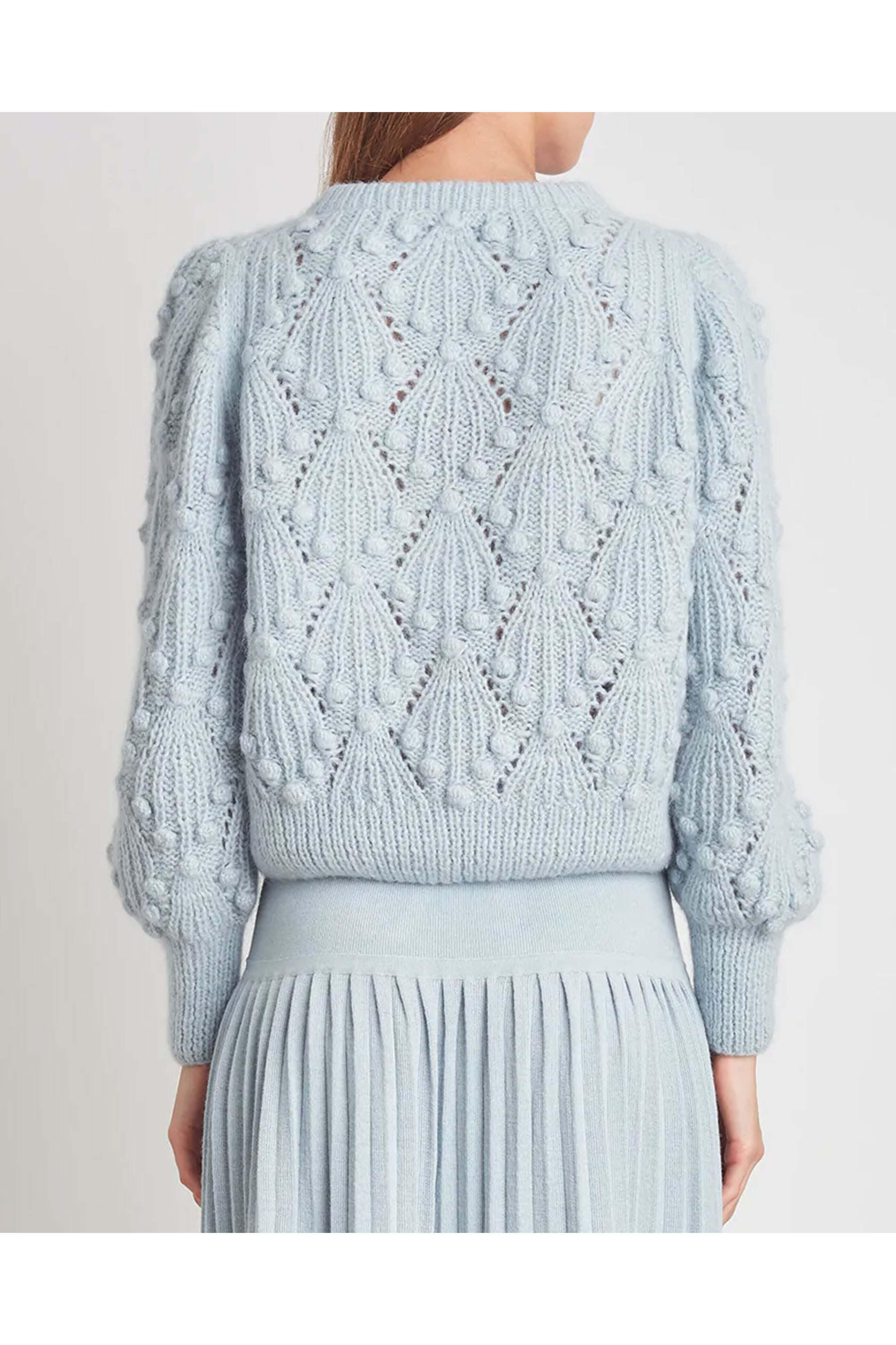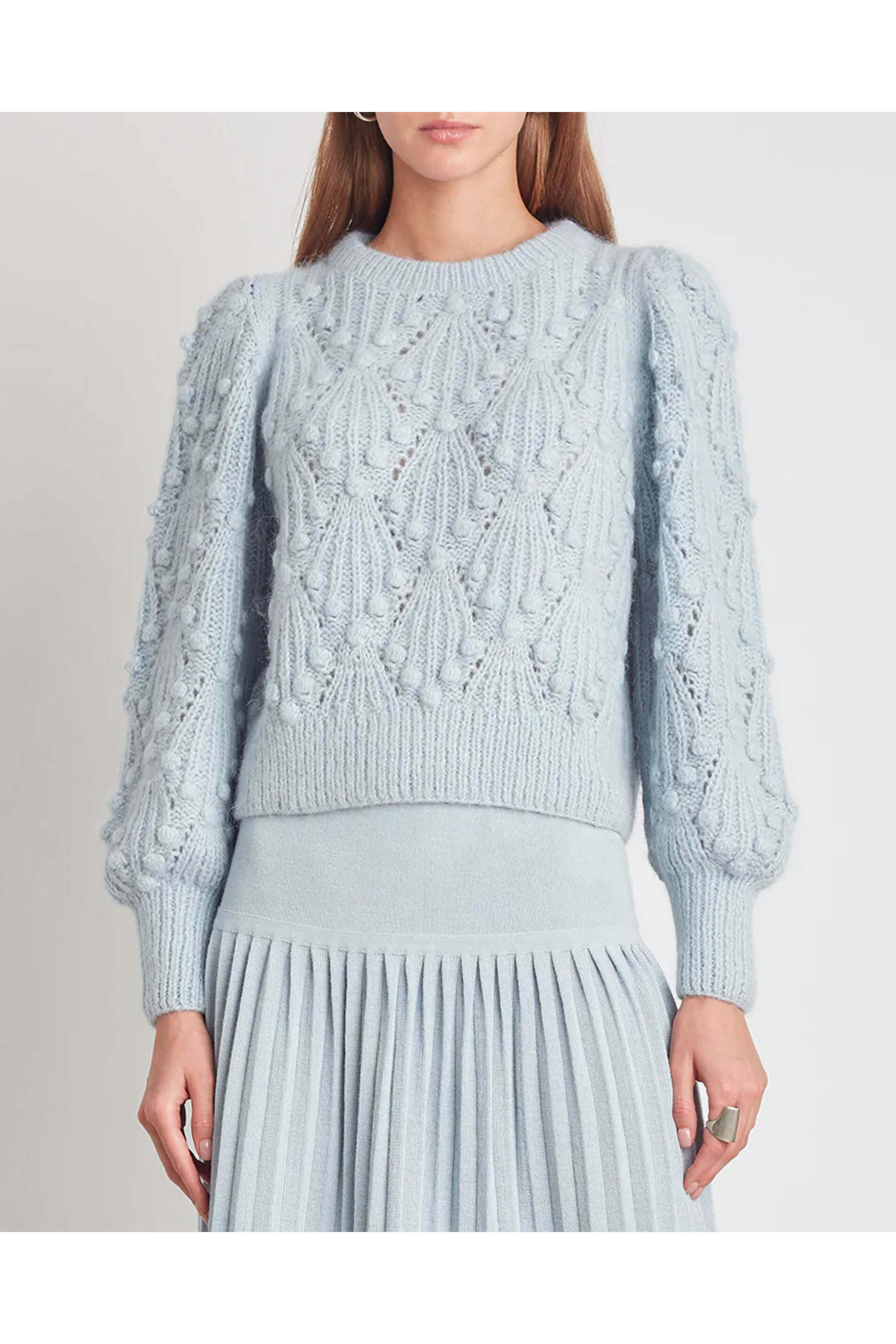 Eleven Six Powder Blue Marisa Sweater. Crewneck. Long blouson sleeves. Ribbed trim detailing at neck, cuffs, and hem. Popcorn and cable stitch detailing throughout. Relaxed fit. Made in Peru by artisan women. 60% Alpaca, 35% Polyamide, 5% Merino wool.