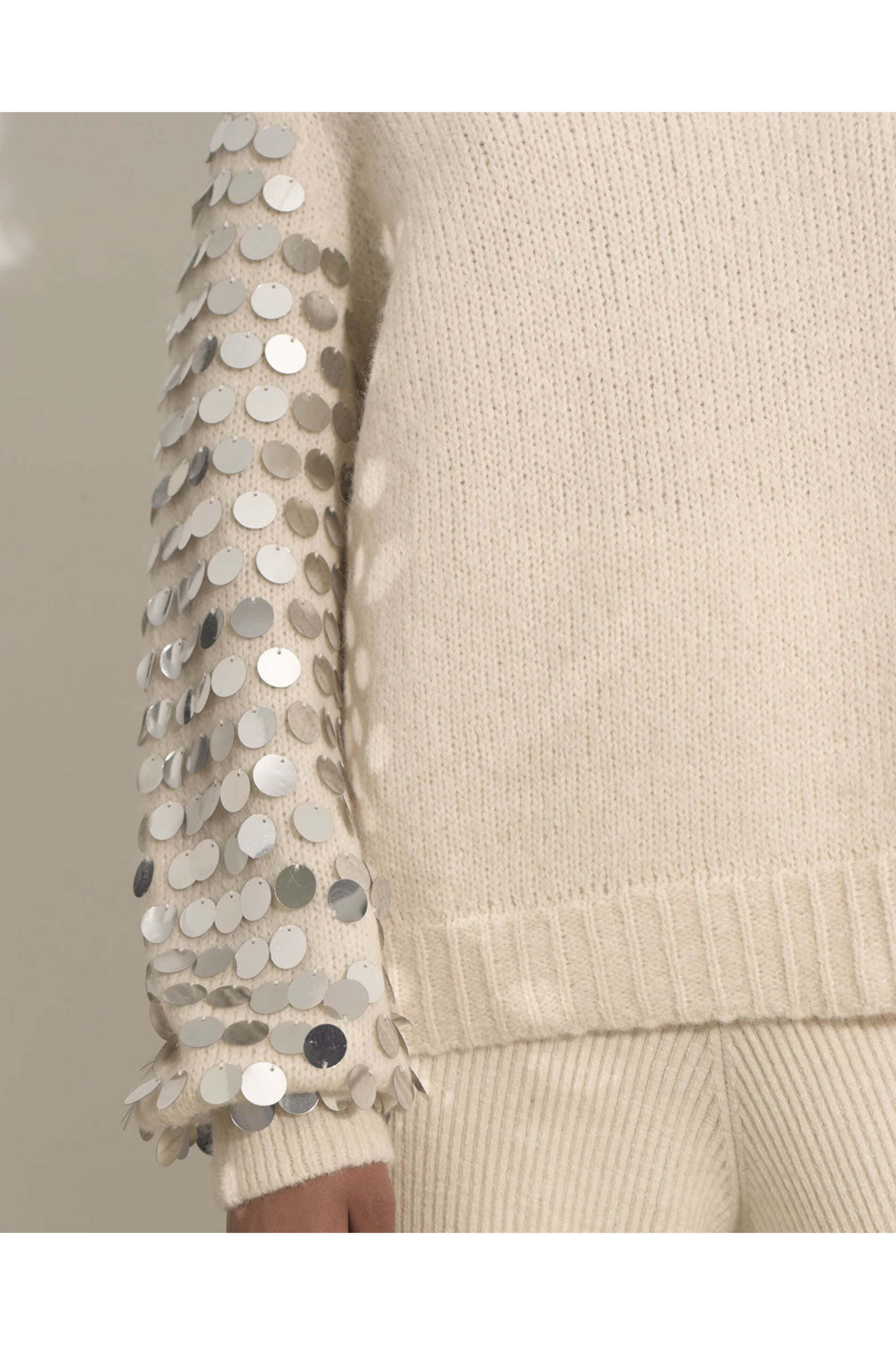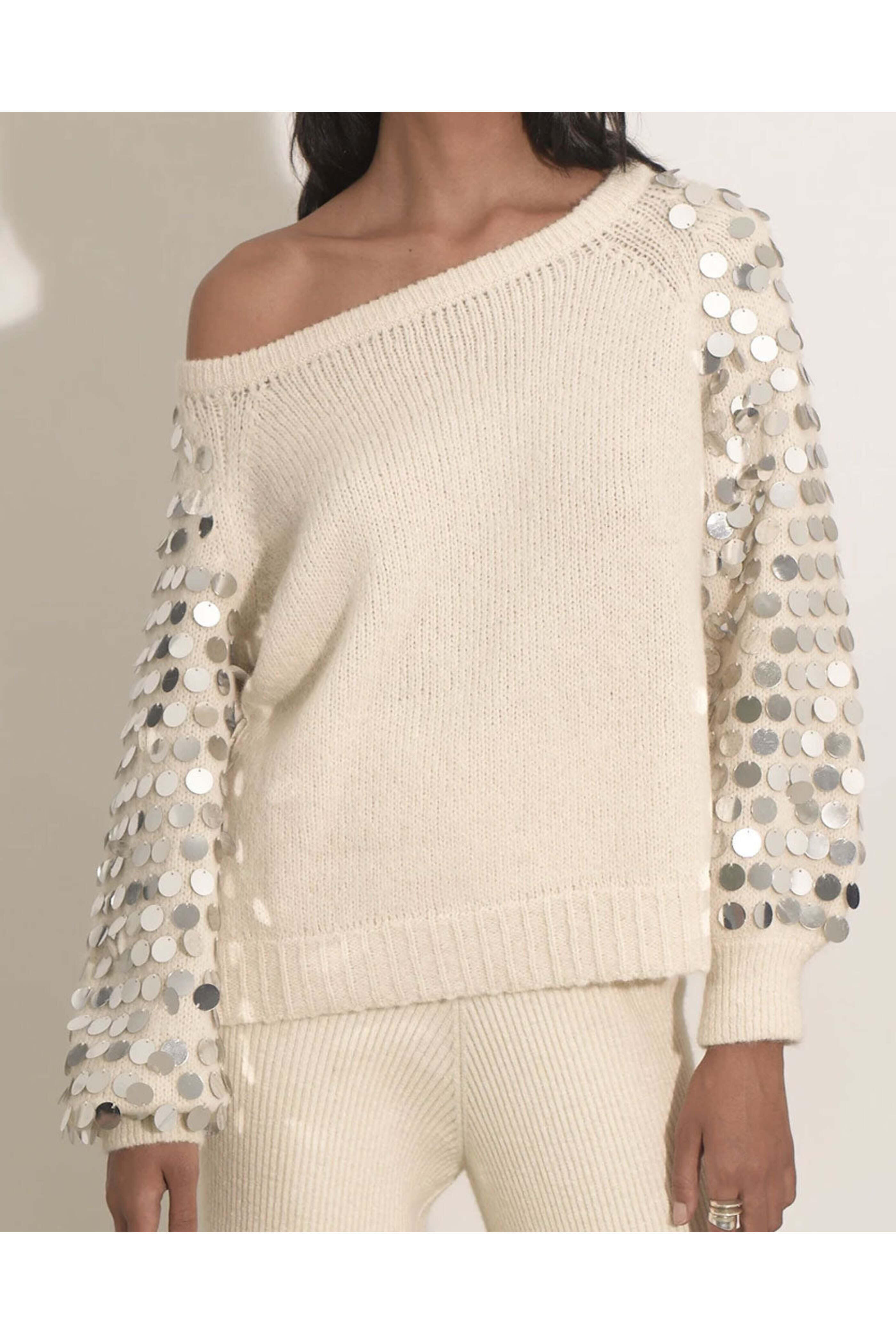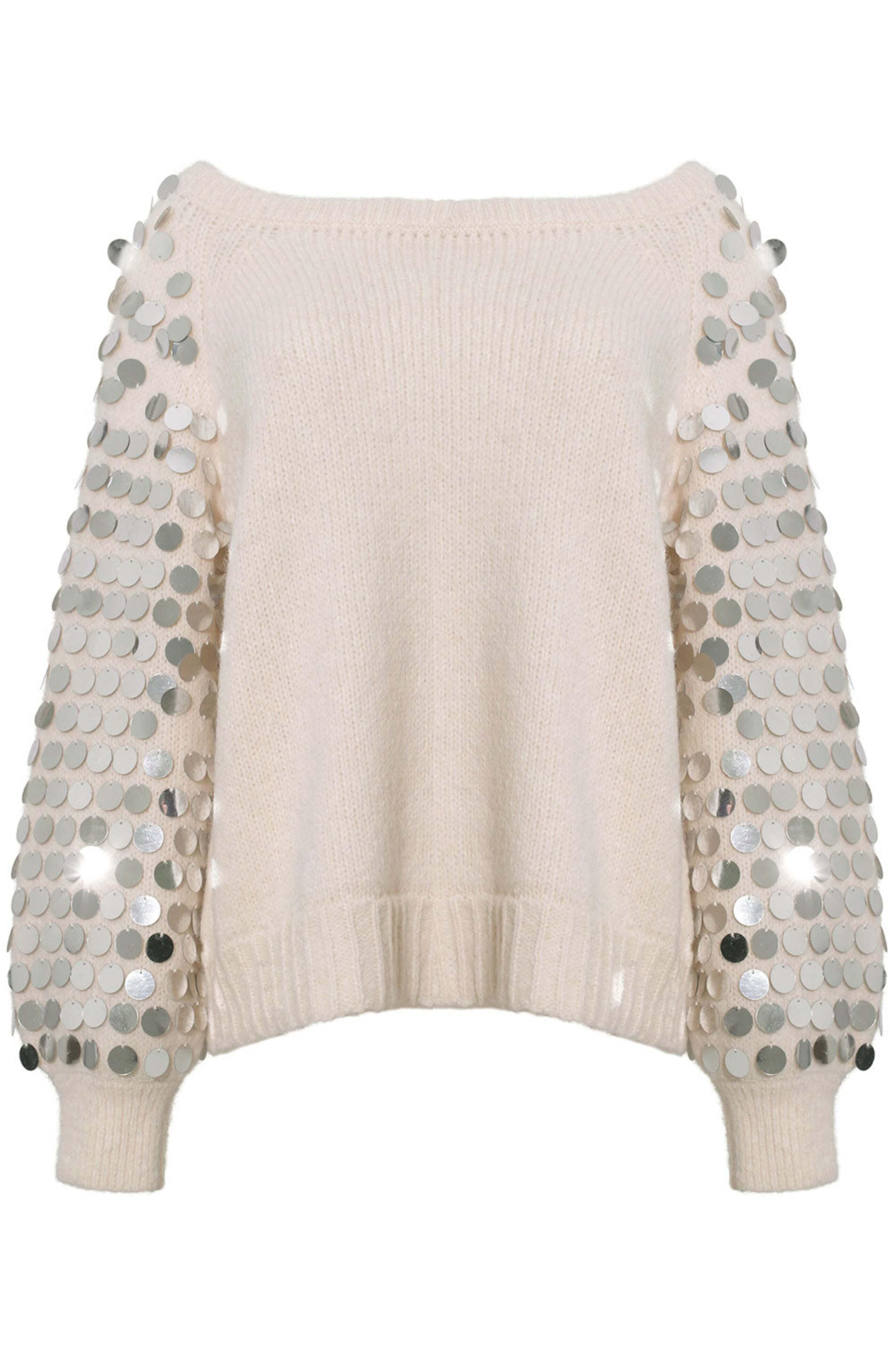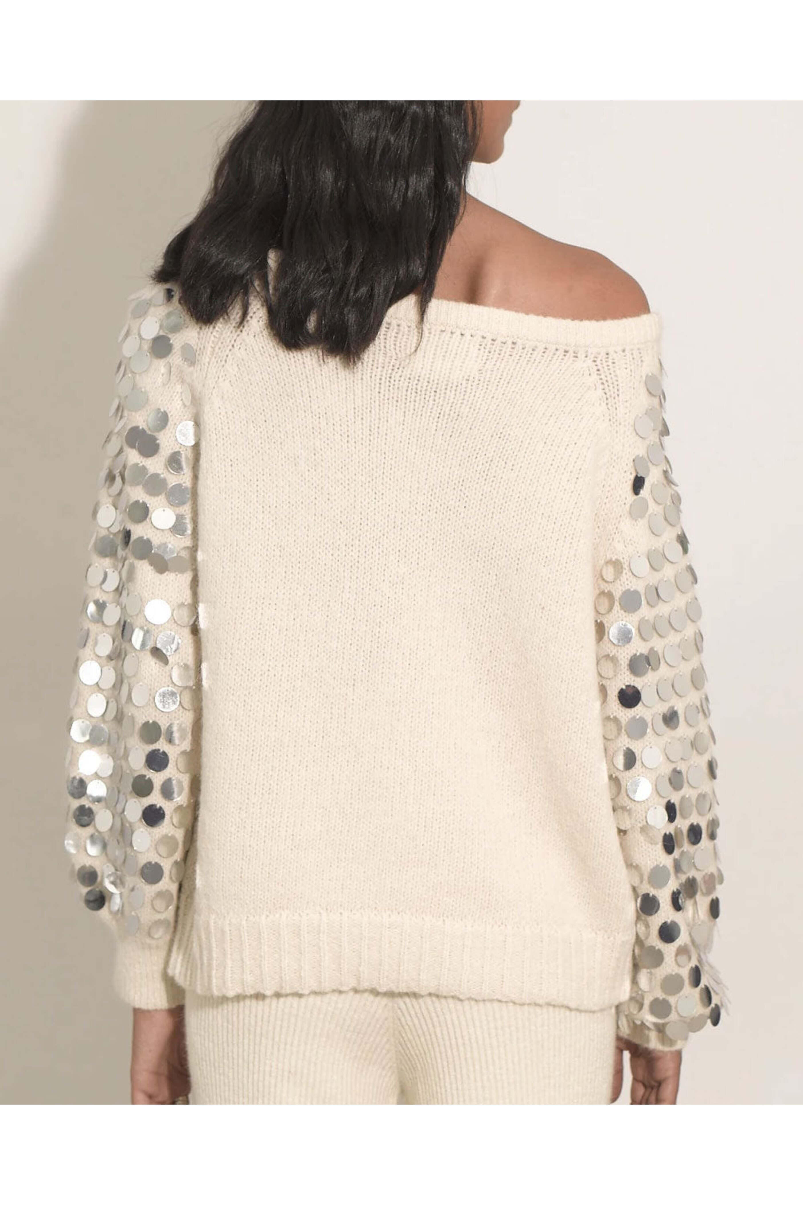ElevenSix Ivory Sequined Sadie Sweater. Bateau neck. Long raglan sleeves; large sequin detail. Ribbed throughout. Relaxed fit. 89% alpaca, 11% polyamide.