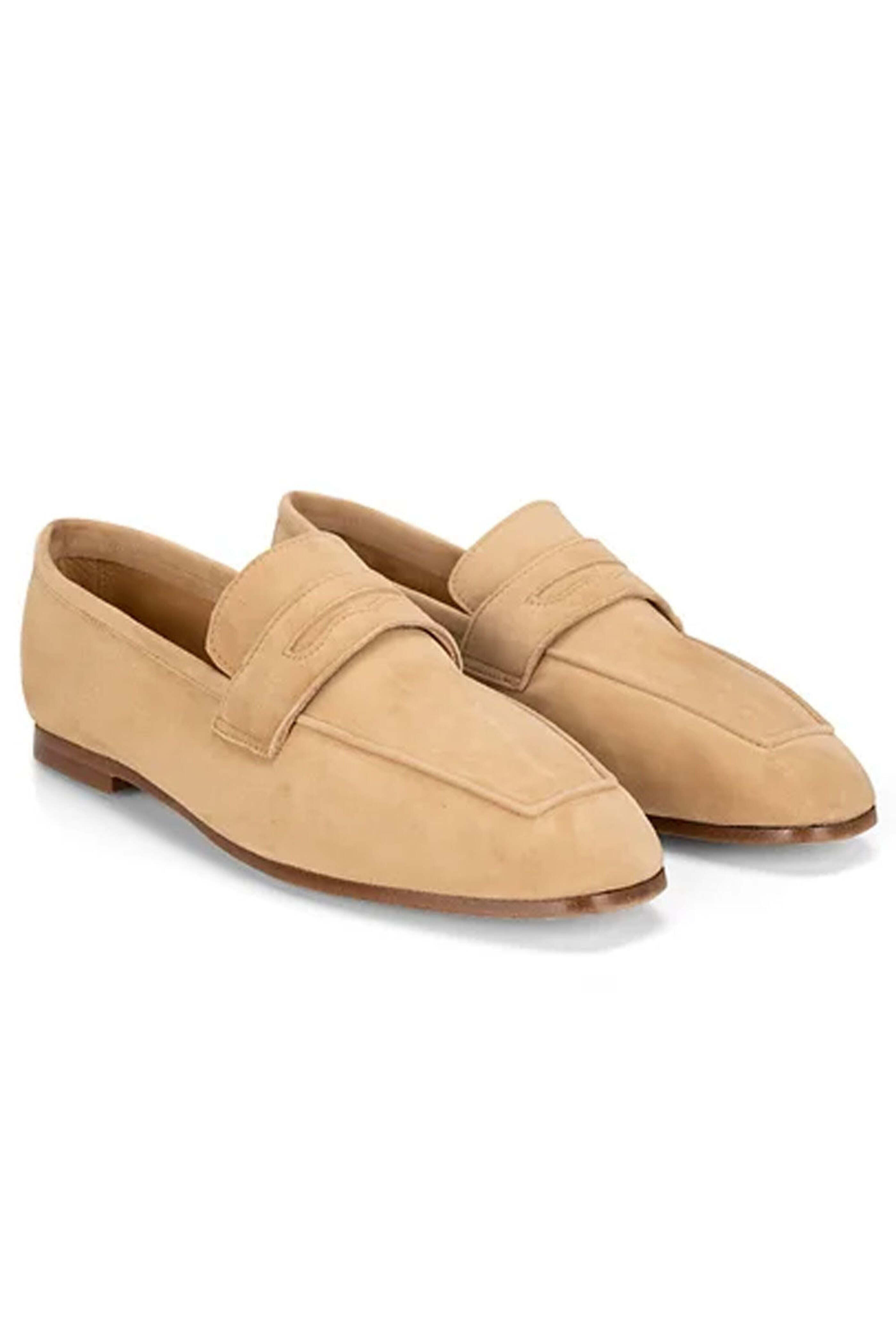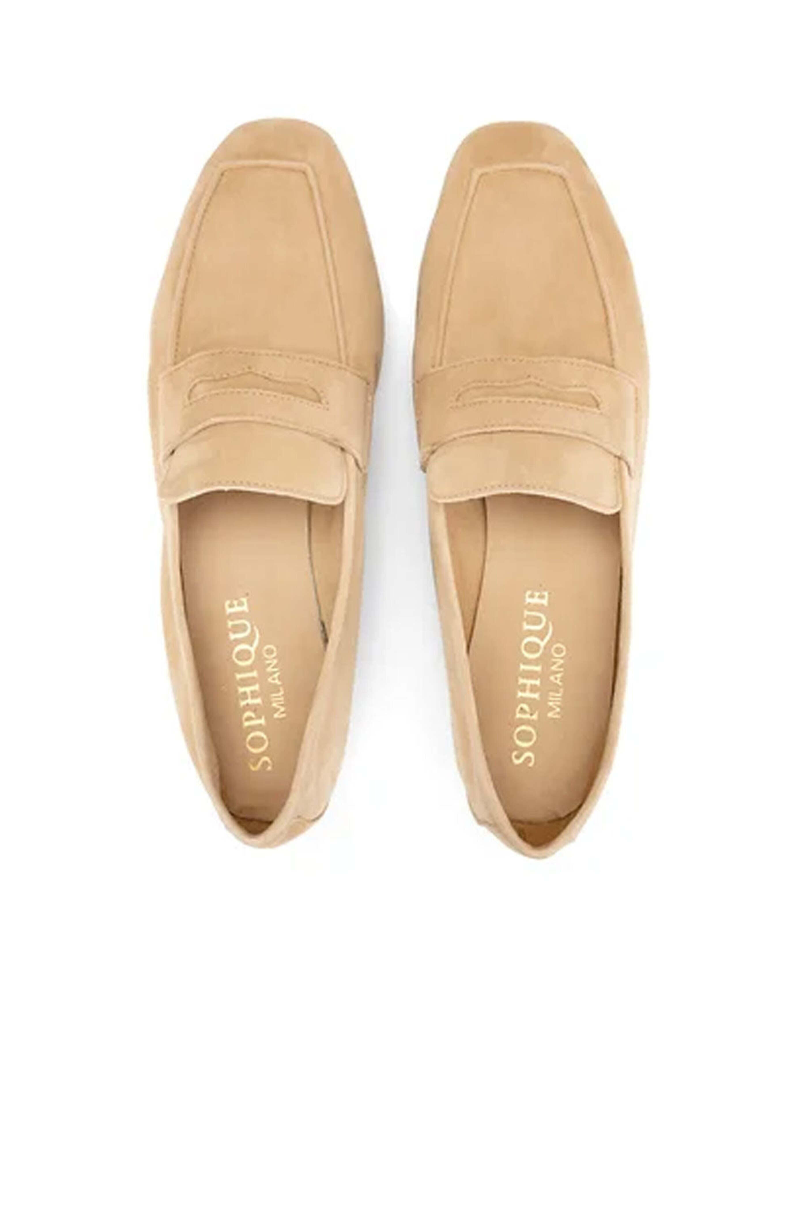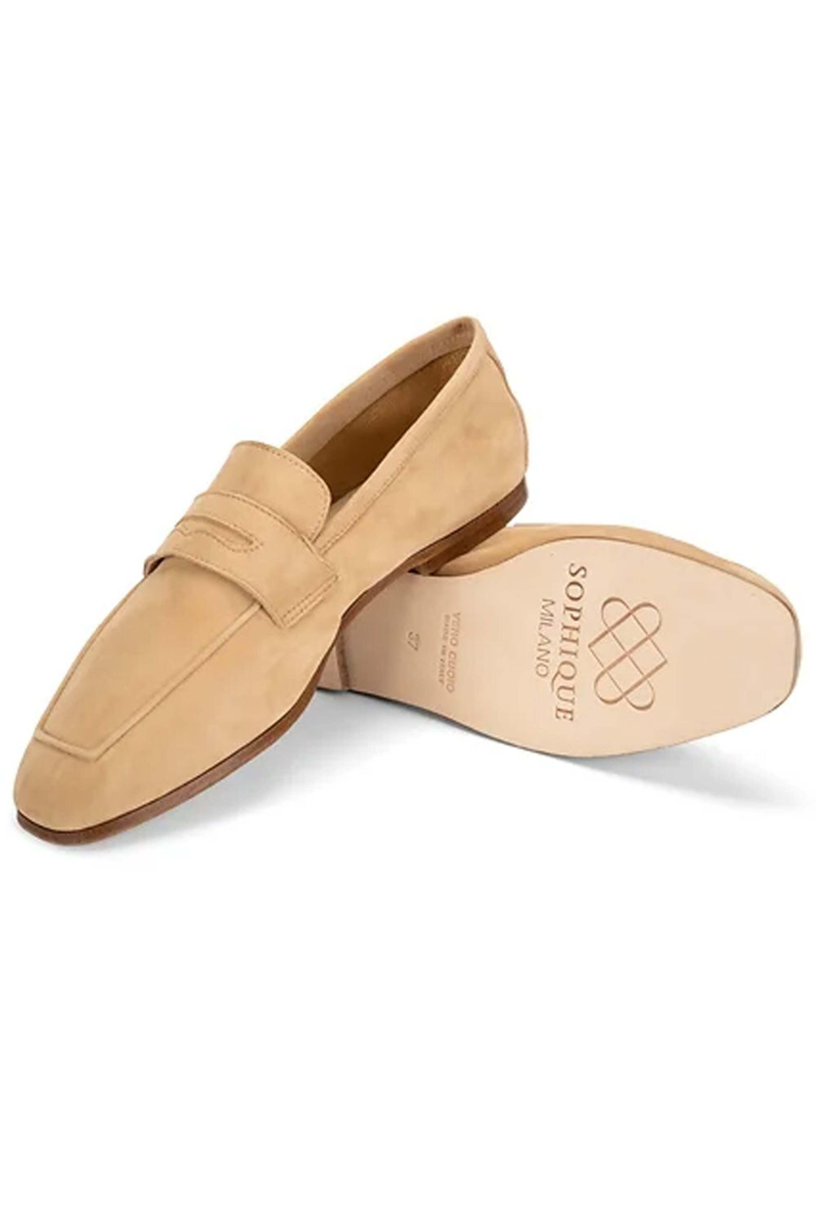 Sophique Milano Essenziale Loafer in Sand. Reinforced apron toe. Notched vamp. Strap with penny holder. Slip on. Tonal stitching. Suede upper and lining. Leather sole. Made in Italy.