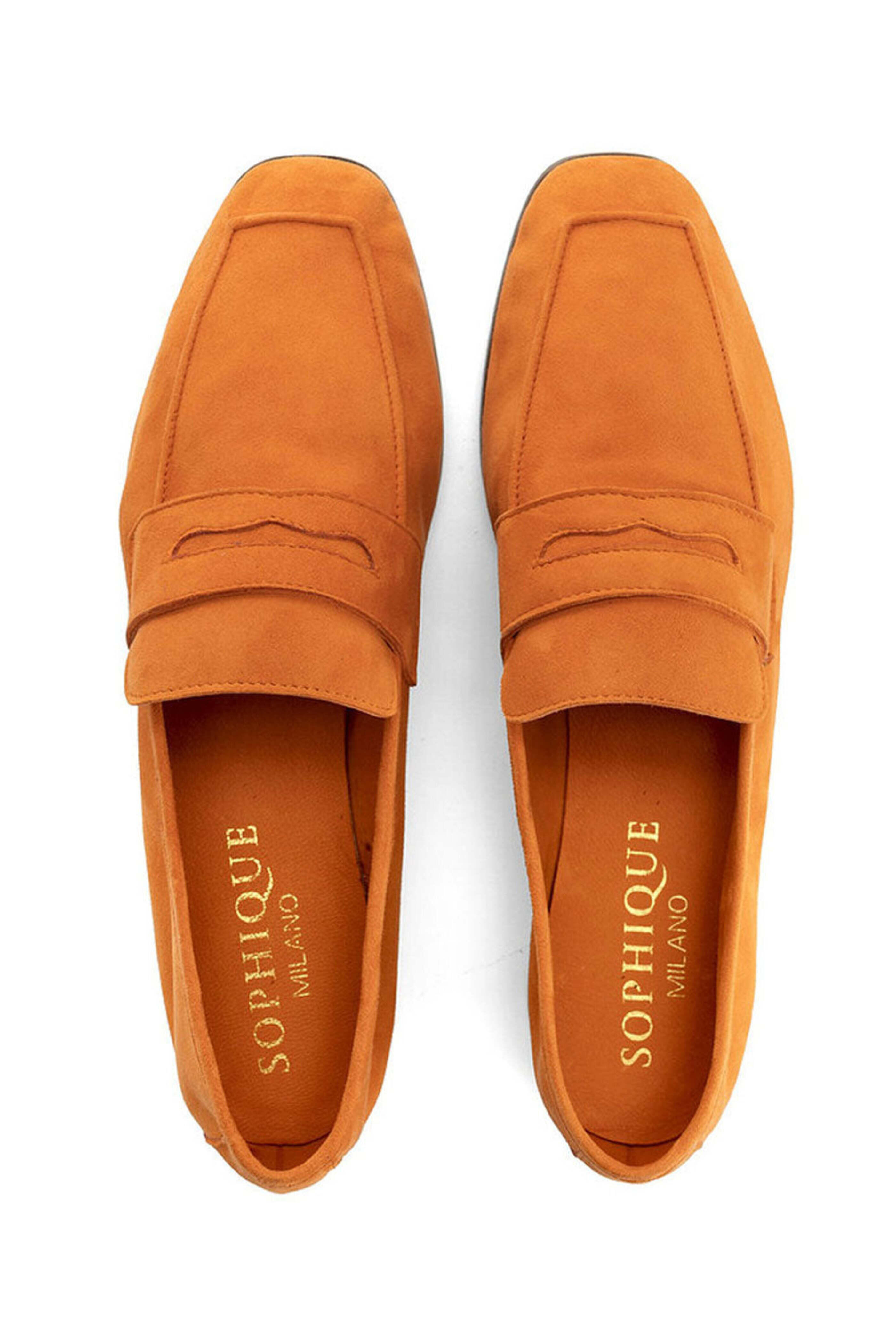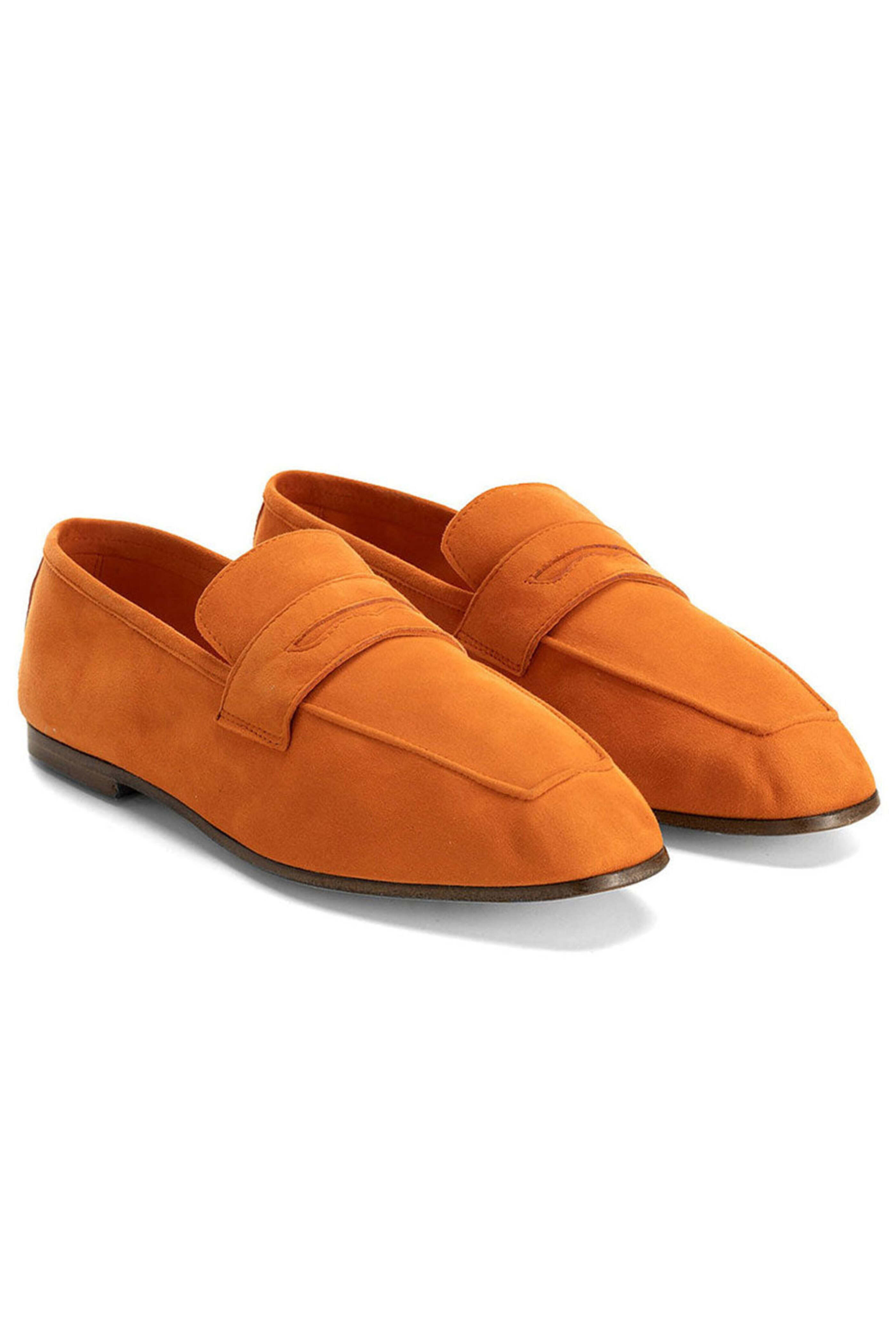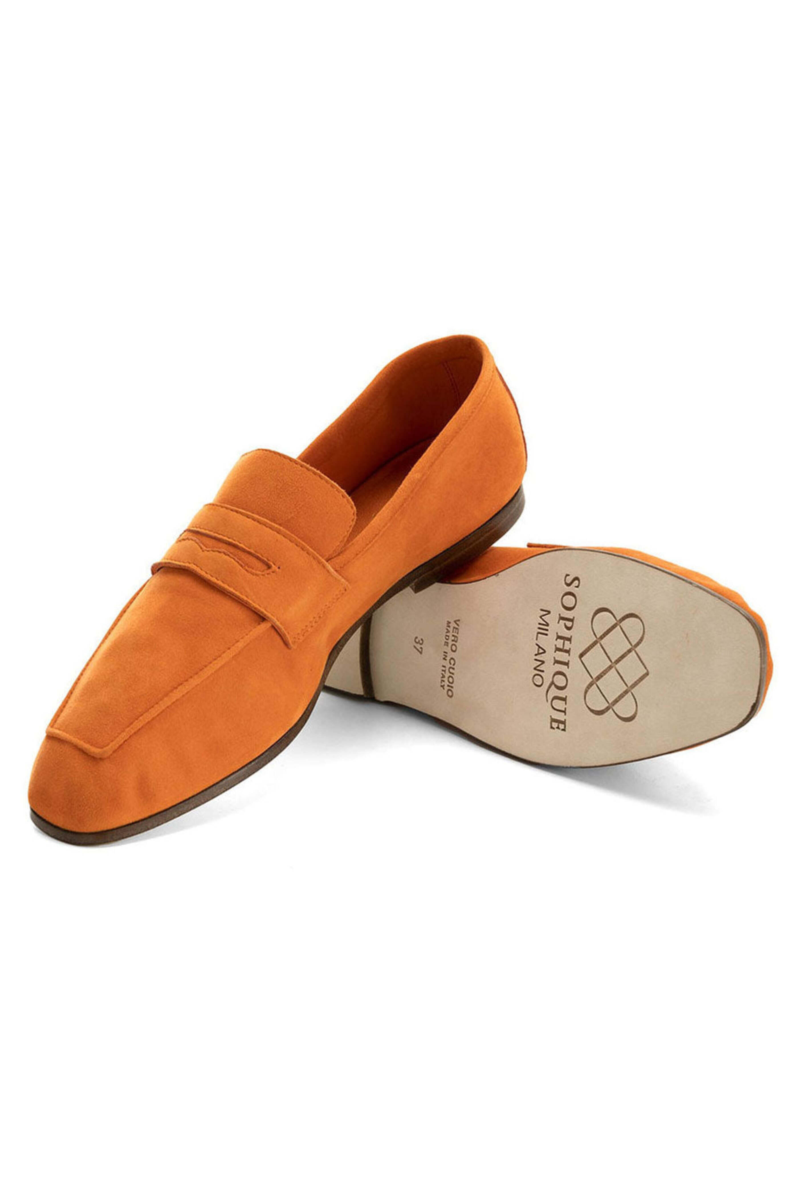 Sophique Milano Essenziale Loafer in Orange. Reinforced apron toe. Notched vamp. Strap with penny holder. Slip on. Tonal stitching. Suede upper and lining. Leather sole. Made in Italy.