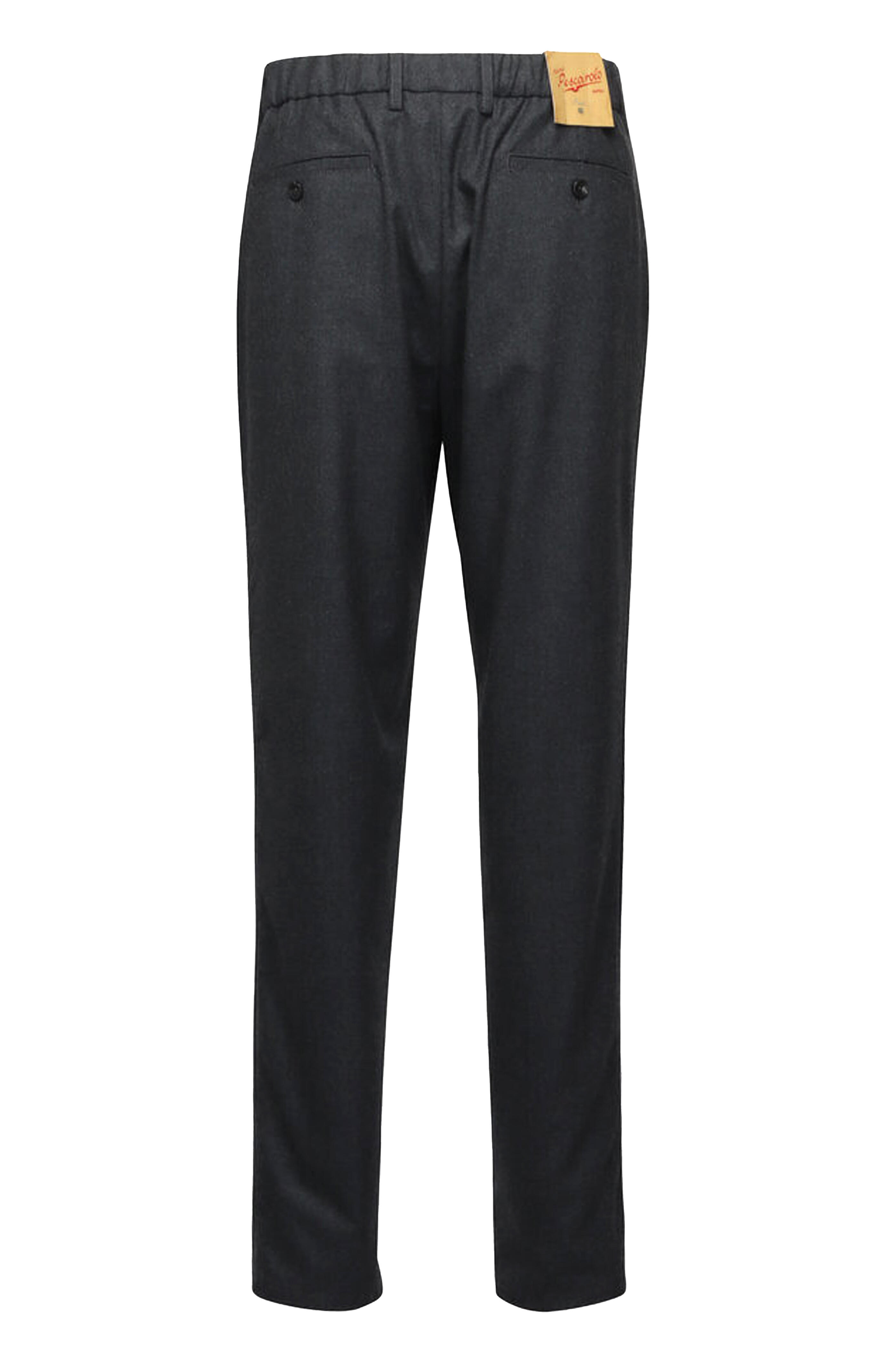 Zip fly; extended button tab. Elasticized waist; belt loops. Side slip pockets; back button besom pockets. Made in Italy. Inseam 35". 96% virgin wool, 4% elastane. Dry clean.