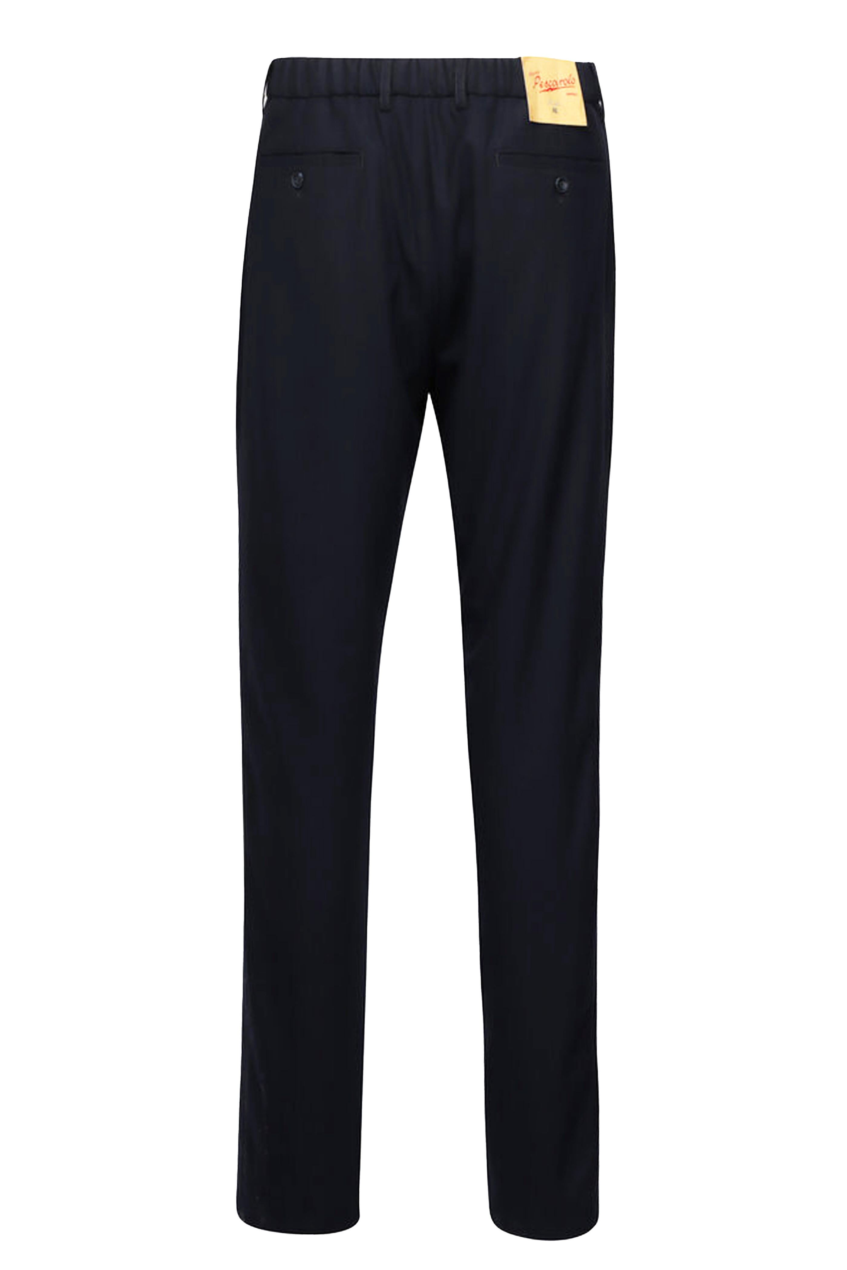 Zip fly; extended button tab. Elasticized waist; belt loops. Side slip pockets; back button besom pockets. Made in Italy. Inseam 35". 96% virgin wool, 4% elastane. Dry clean.