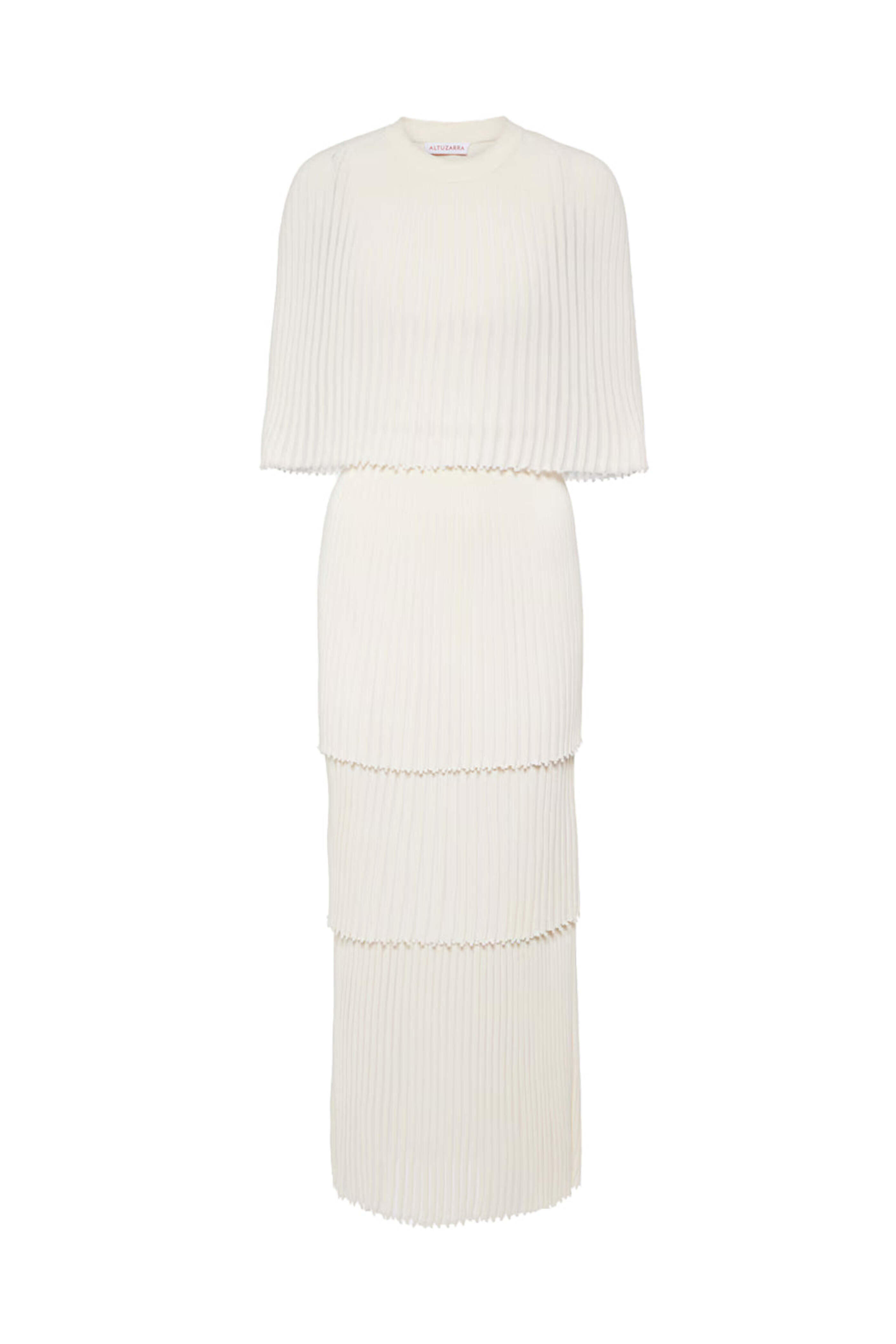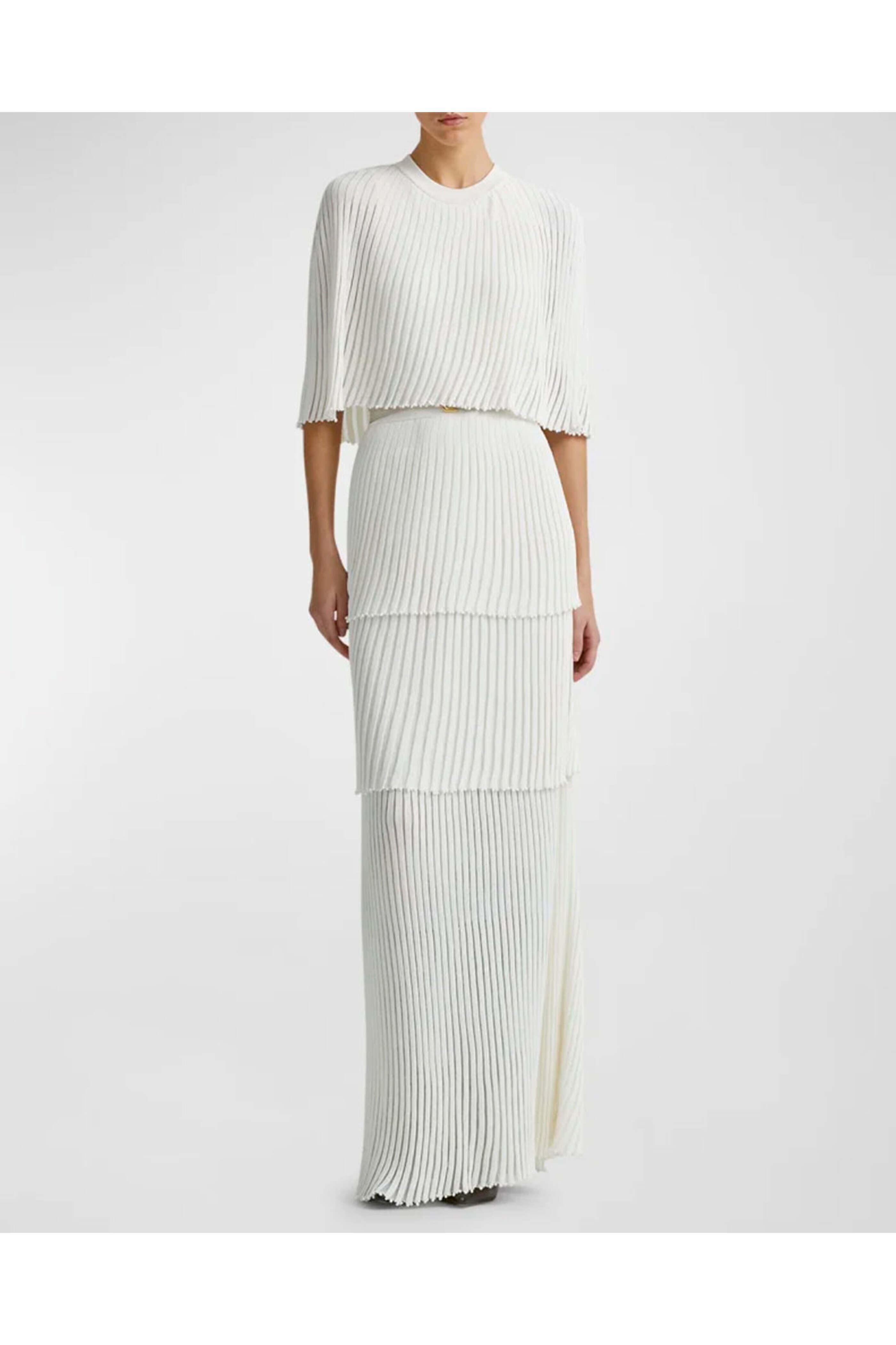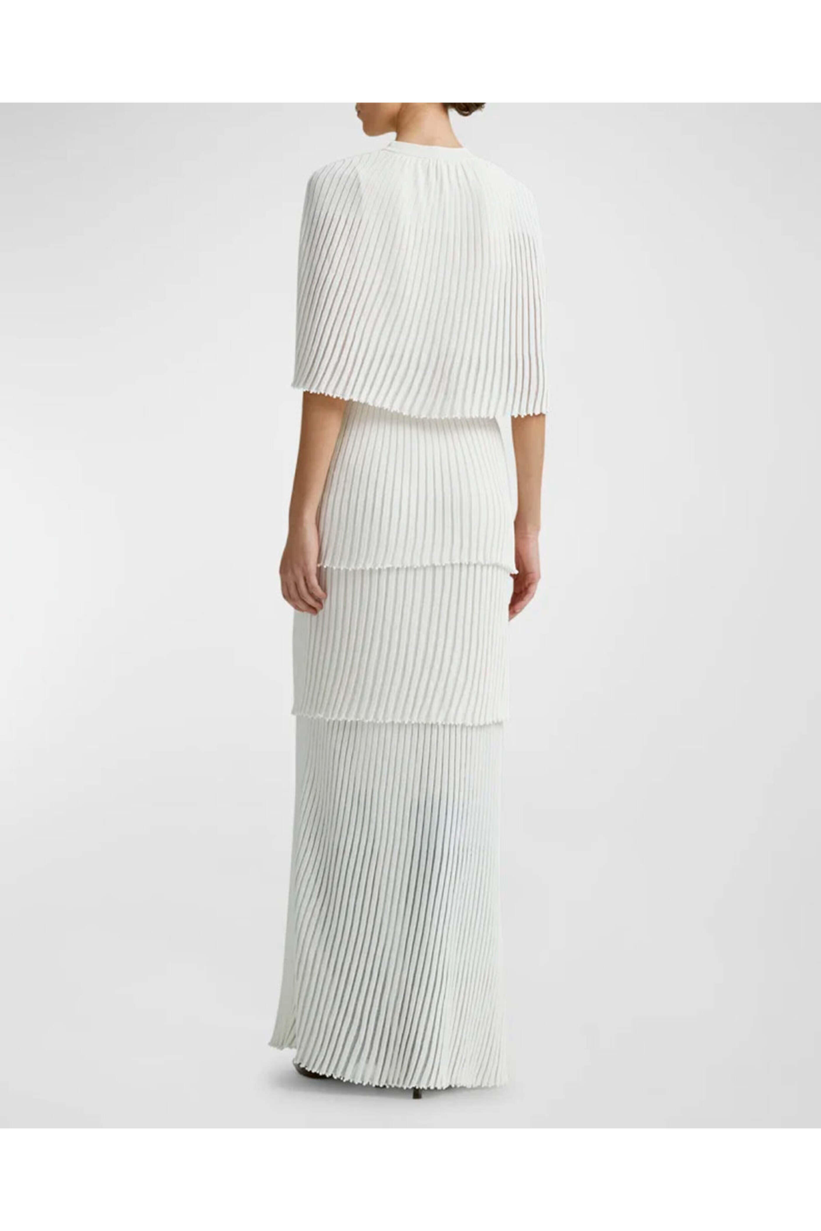 Altuzarra Ivory Aerial Dress. Round neck. Elbow length cape sleeves. Concealed closure. Tiered aline silhouette. Maxi length. Pleated throughout. Viscose, cotton, polyester. Made in Italy.