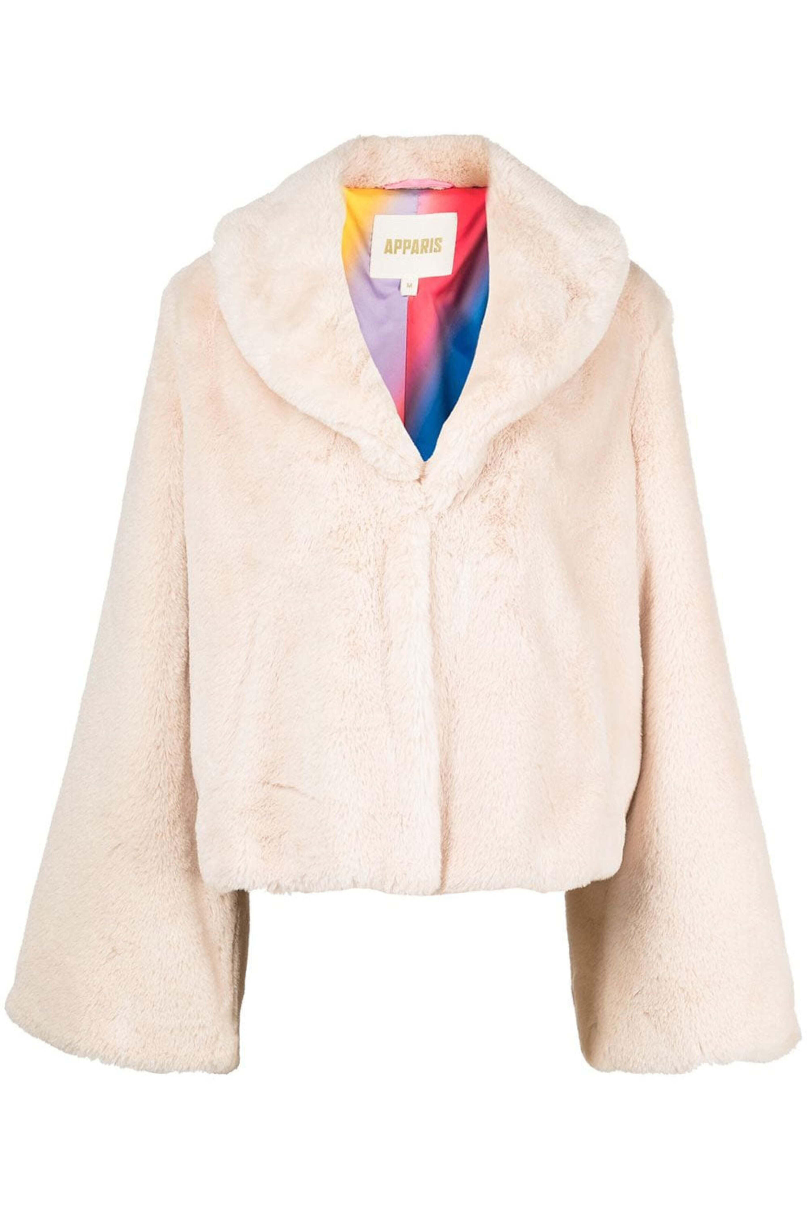 Apparis Oat Vegan Fur Fiona Jacket. Shawl lapels. Long wide sleeves. Concealed front closure. Side slip pockets. Straight hem. Relaxed fit. Faux fur fabrication. Lined. 67% polyester, 33% sorona.