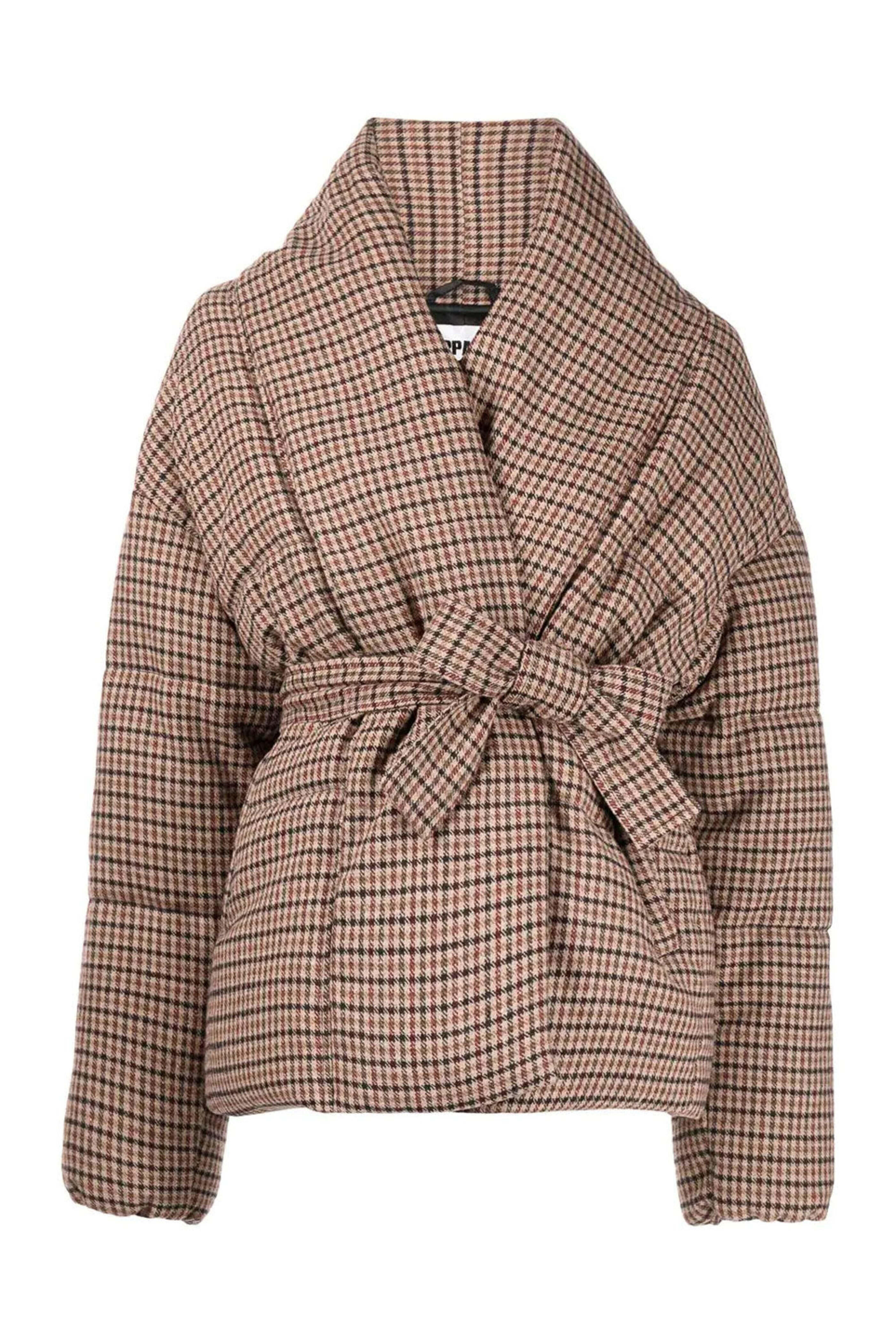 Apparis Brown Plaid Belted Maggie Jacket. Shawl lapel. Long sleeves. Removable self-tie belted closure. Straight hem. Relaxed fit. Puffer silhouette. Lined. 100% polyester.