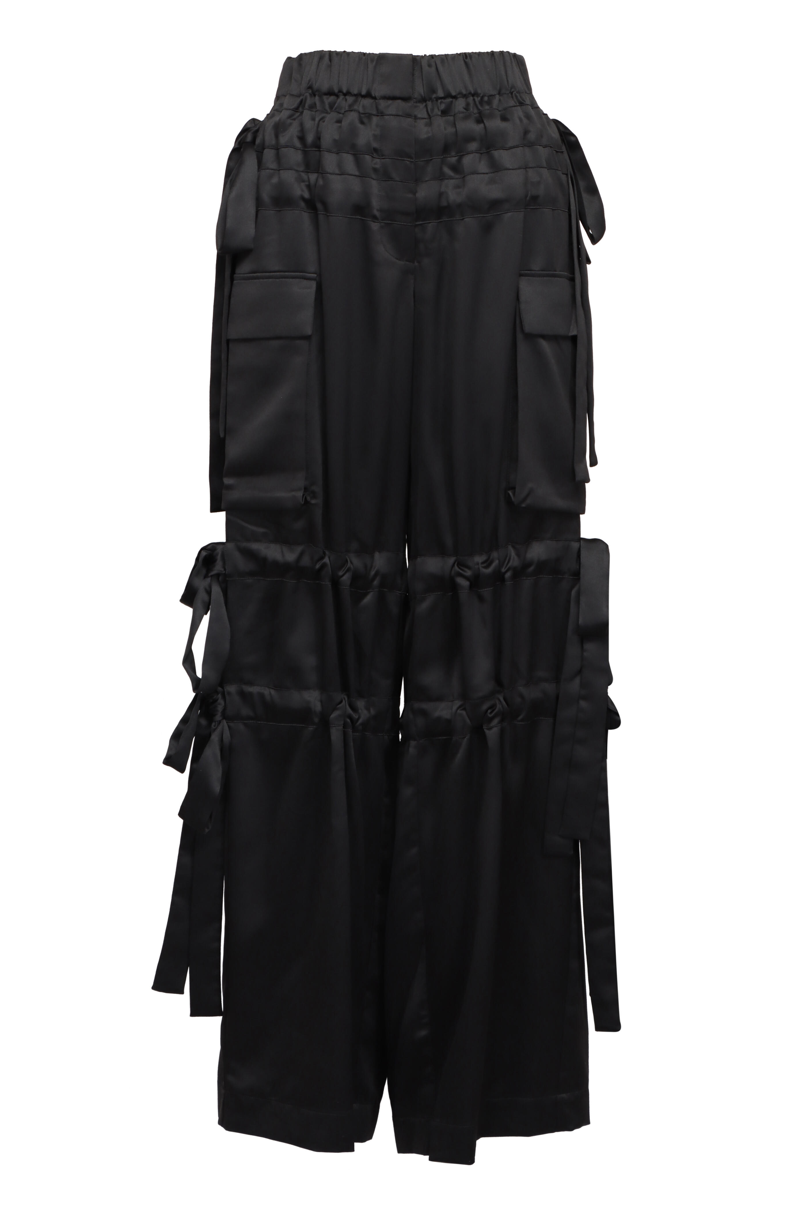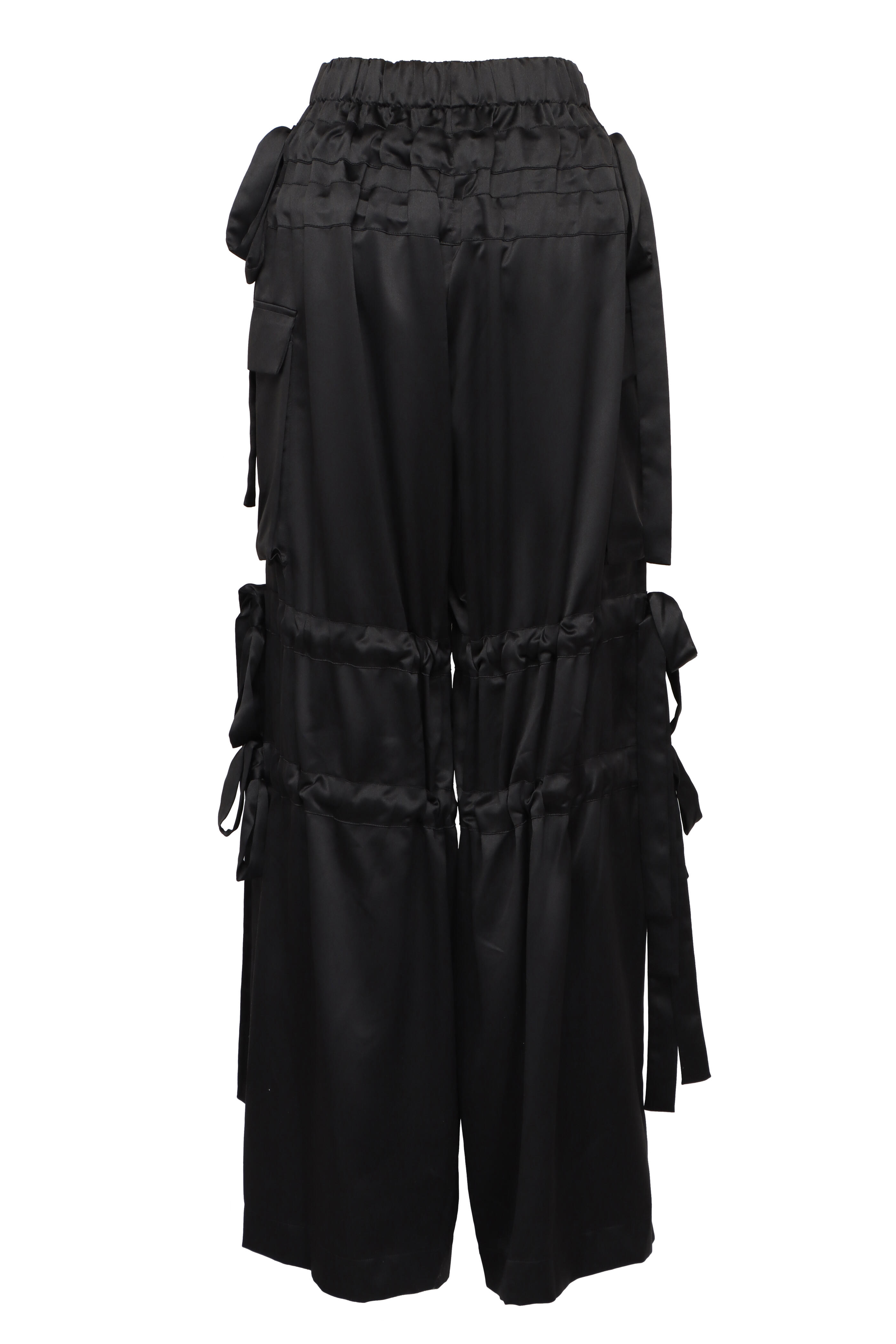 Mid rise. Hook and eye closure. Zip fly. Cargo flap pockets. Self-tie drawstring cinch detail through leg. Satin fabrication. Imported. Rise 12” (US 2). Inseam 34” (US 2). Full length. 100% polyester outer and lining. Dry clean.