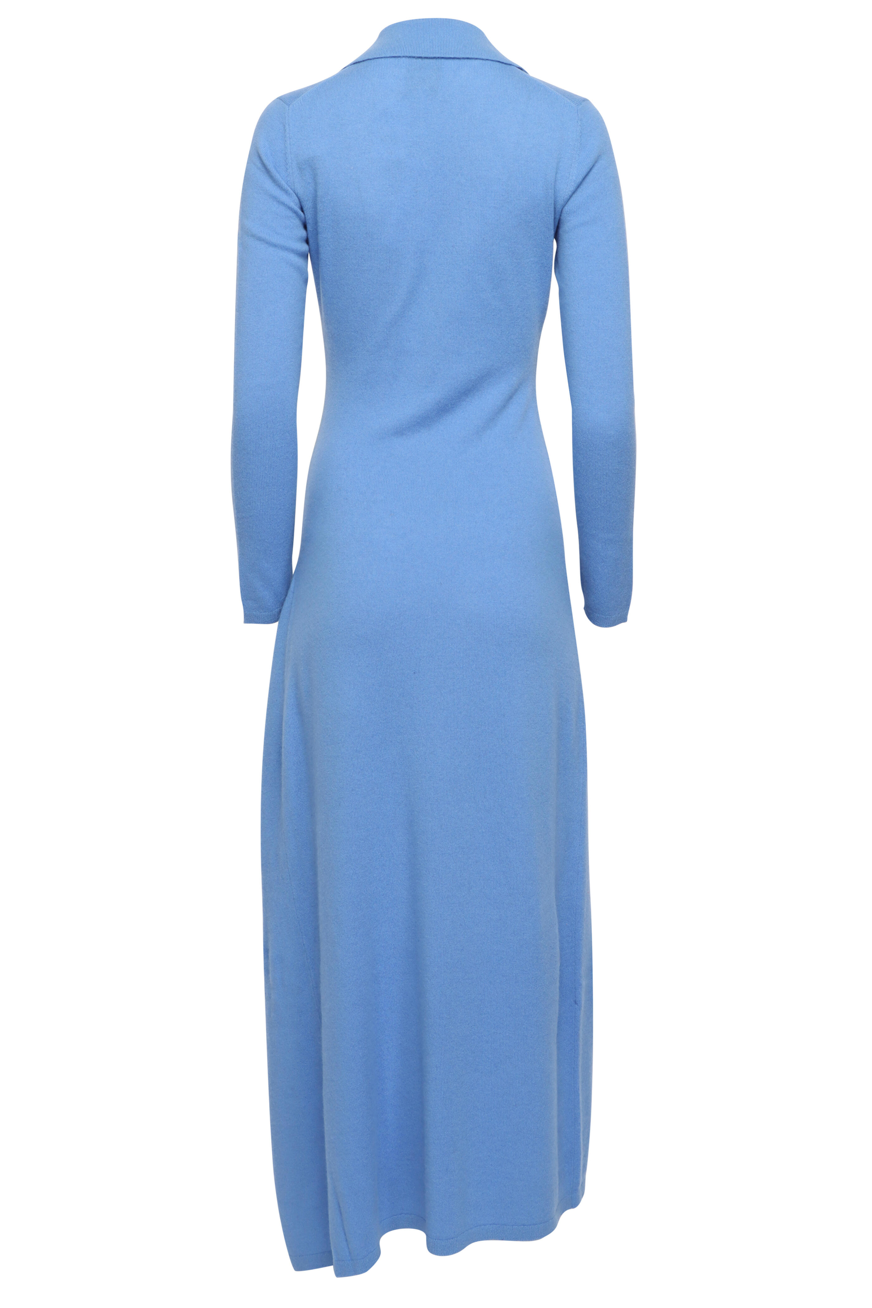 Polo collar. V neck. Long sleeves. Slim through waist. Aline silhouette. Imported. Midi length. 90% wool, 10% cashmere. Dry clean.
