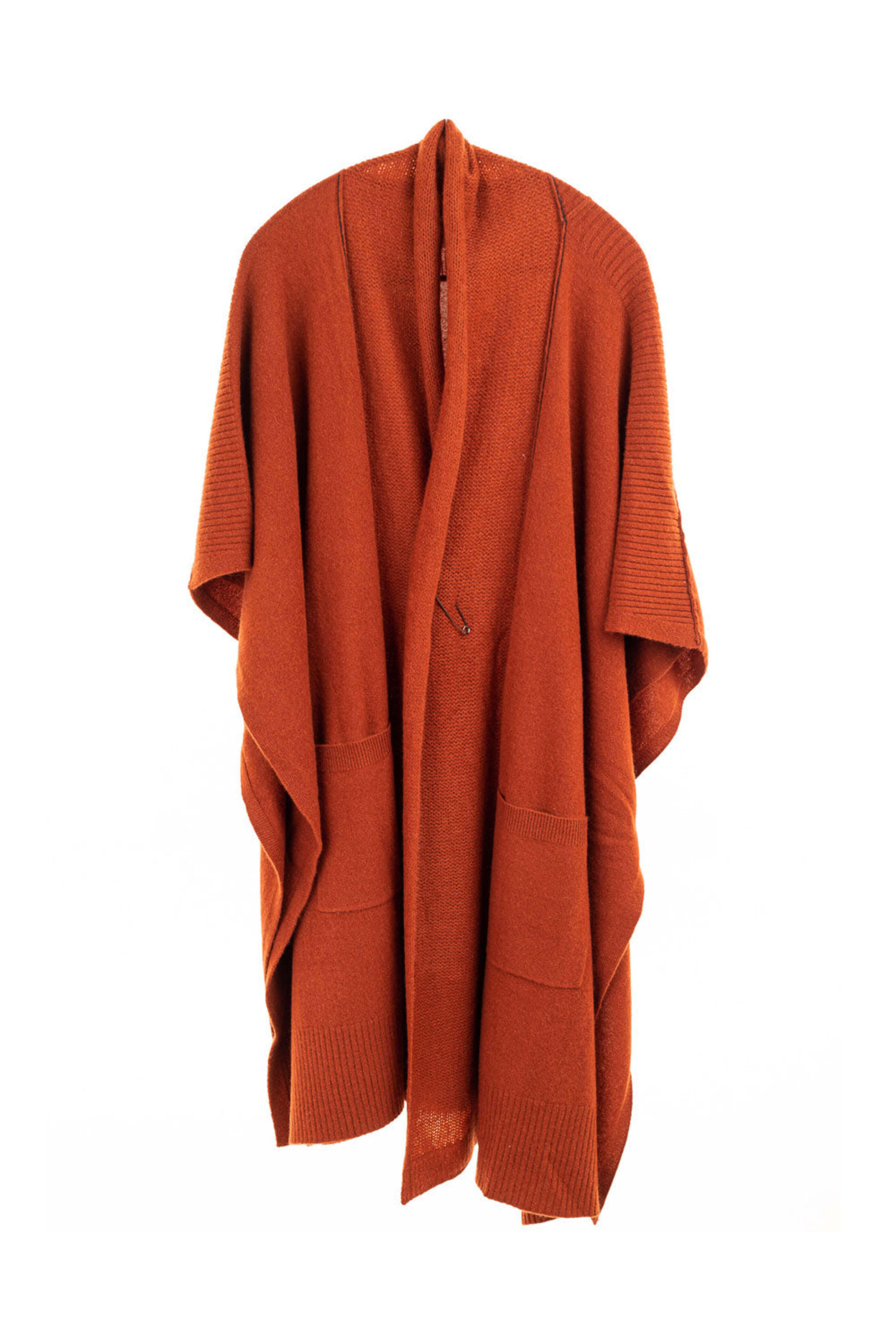 Paychi Guh Brandy Long Wrap Cardigan. Open front; pin closure. Short sleeves. Front patch pockets. Relaxed fit. Long length. Side hem slits. 100% premium Mongolian cashmere.