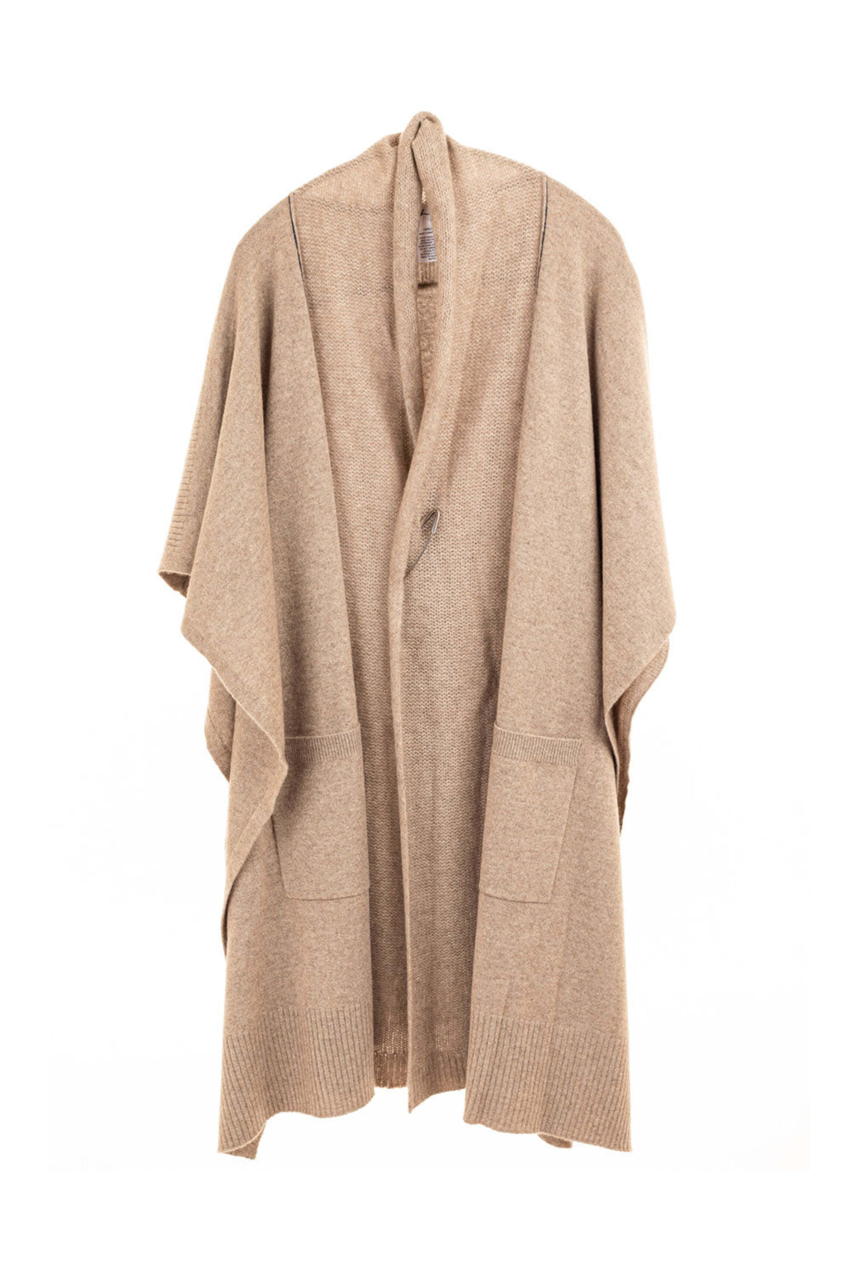 Paychi Guh Toast Long Wrap Cardigan. Open front; pin closure. Short sleeves. Front patch pockets. Relaxed fit. Long length. Side hem slits. 100% premium Mongolian cashmere.