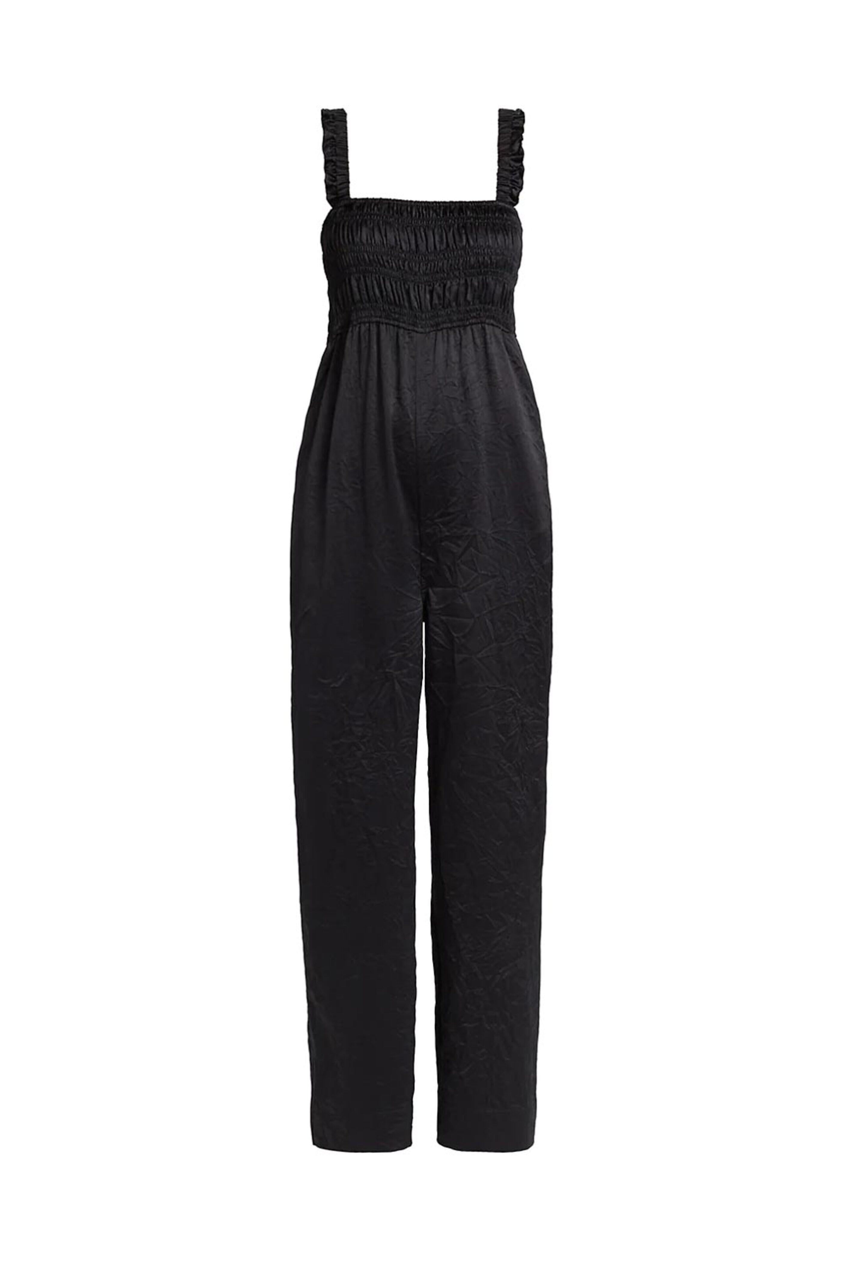 Ganni Black Crinkled Jumpsuit. Square neck. Square back. Sleeveless; ruffle shoulder straps. Smocked bodice. Side slip pockets. Relaxed through leg. Crinkled satin fabrication. Ankle length. Unlined. 95% polyester, 5% spandex.