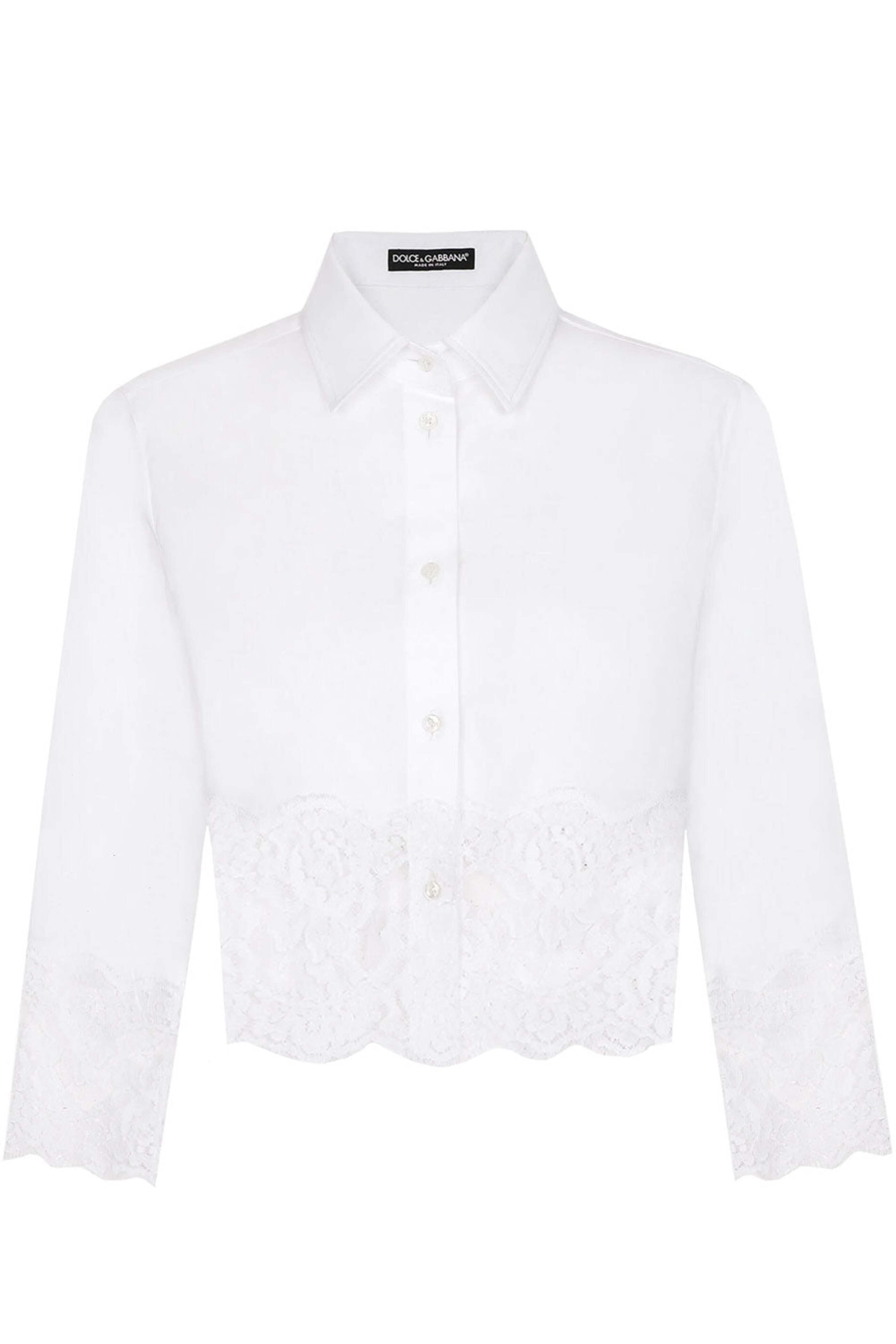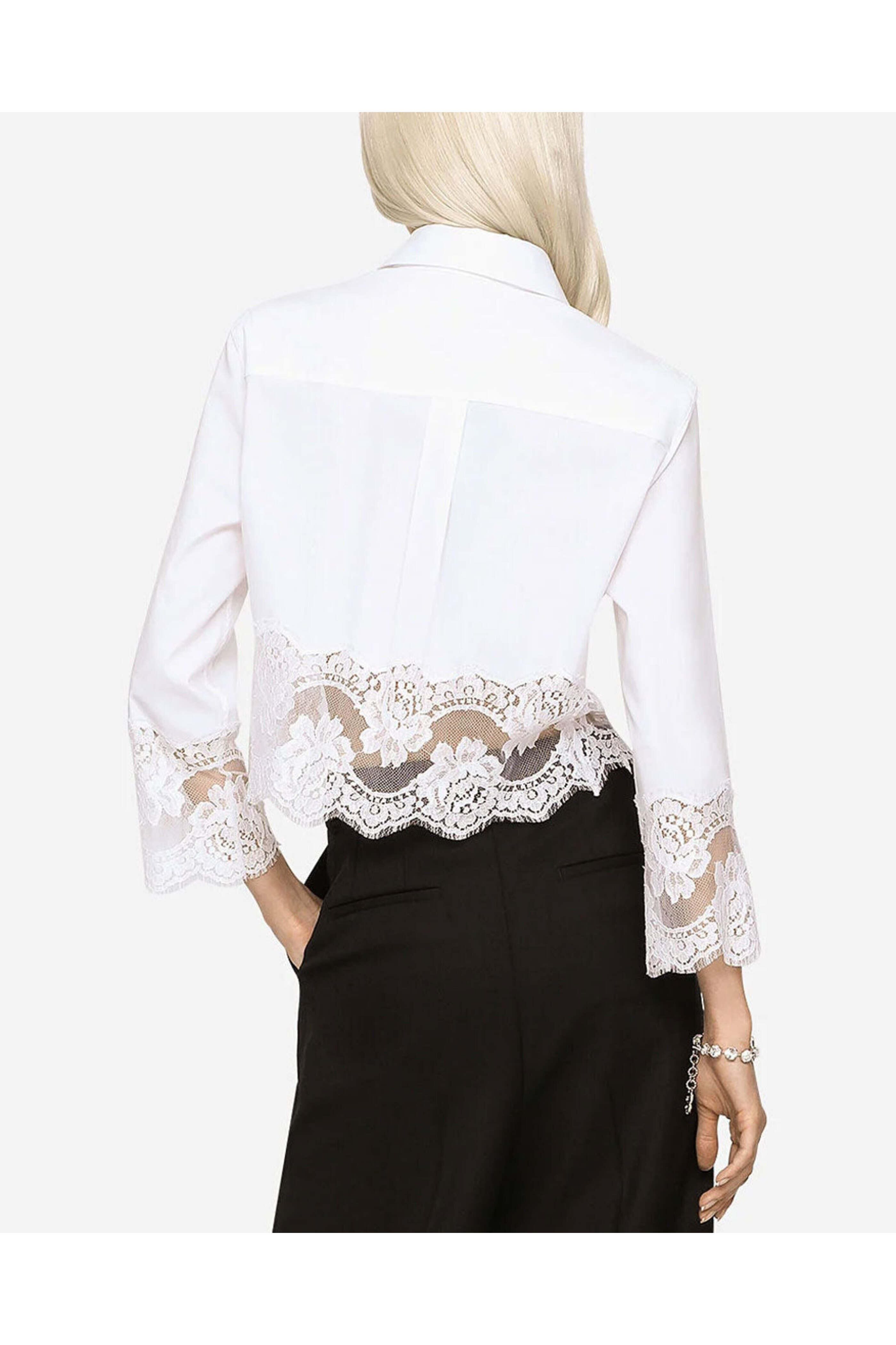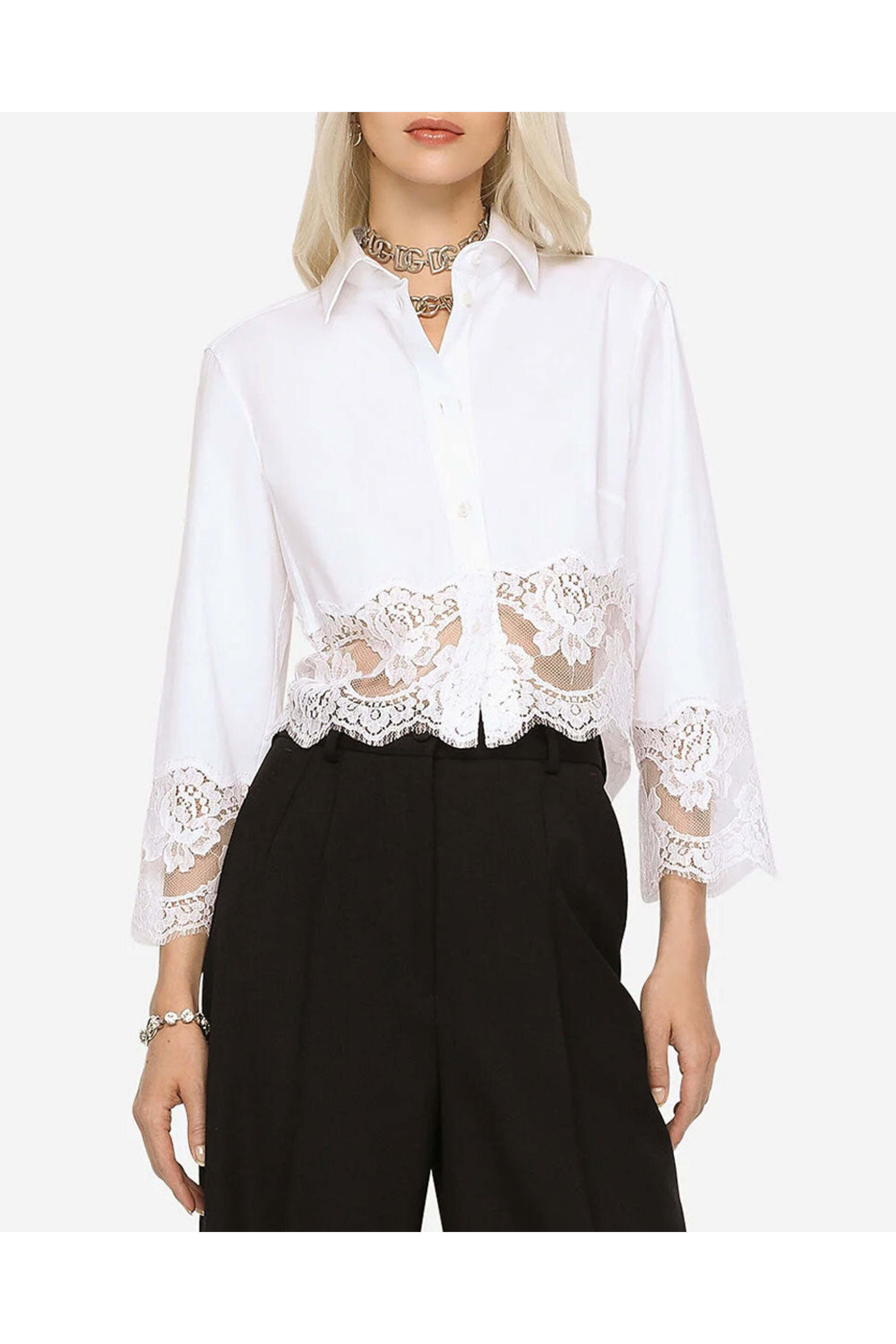 Dolce & Gabbana Optical White Lace Bodice Button Down Shirt. Collar. Bracelet length sleeves. Button down front closure. Lace detail at cuffs and hem. Boxy fit. Slightly cropped length. Made in Italy. 94% cotton, 4% polyamide, 2% spandex.