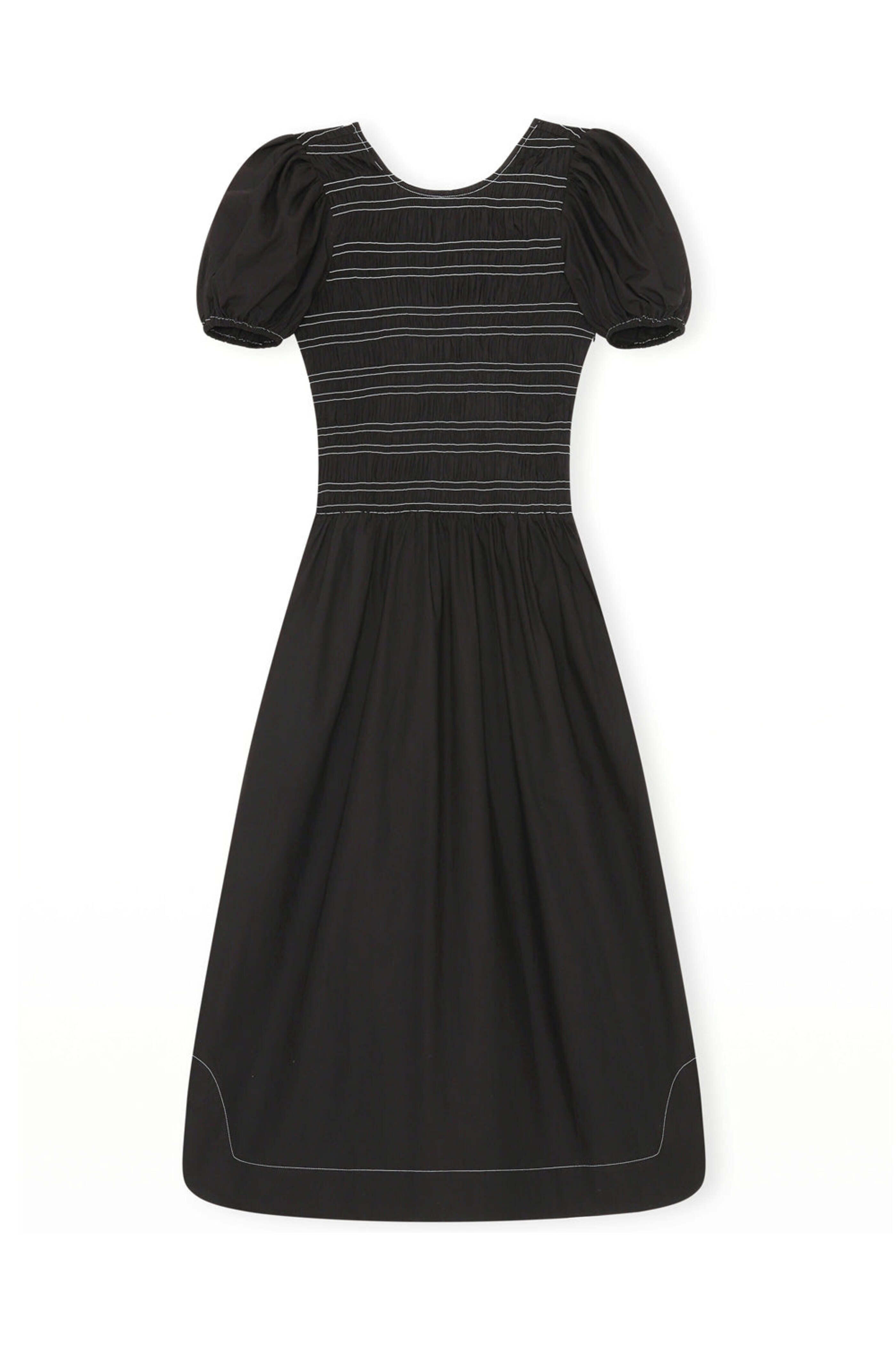 Ganni Black Smocked Midi Dress. Round neck. Scoop back. Short puff sleeves. Smocked bodice. Slim fit at bodice, relaxed fit through skirt. Midi length. Unlined. 100% organic cotton.