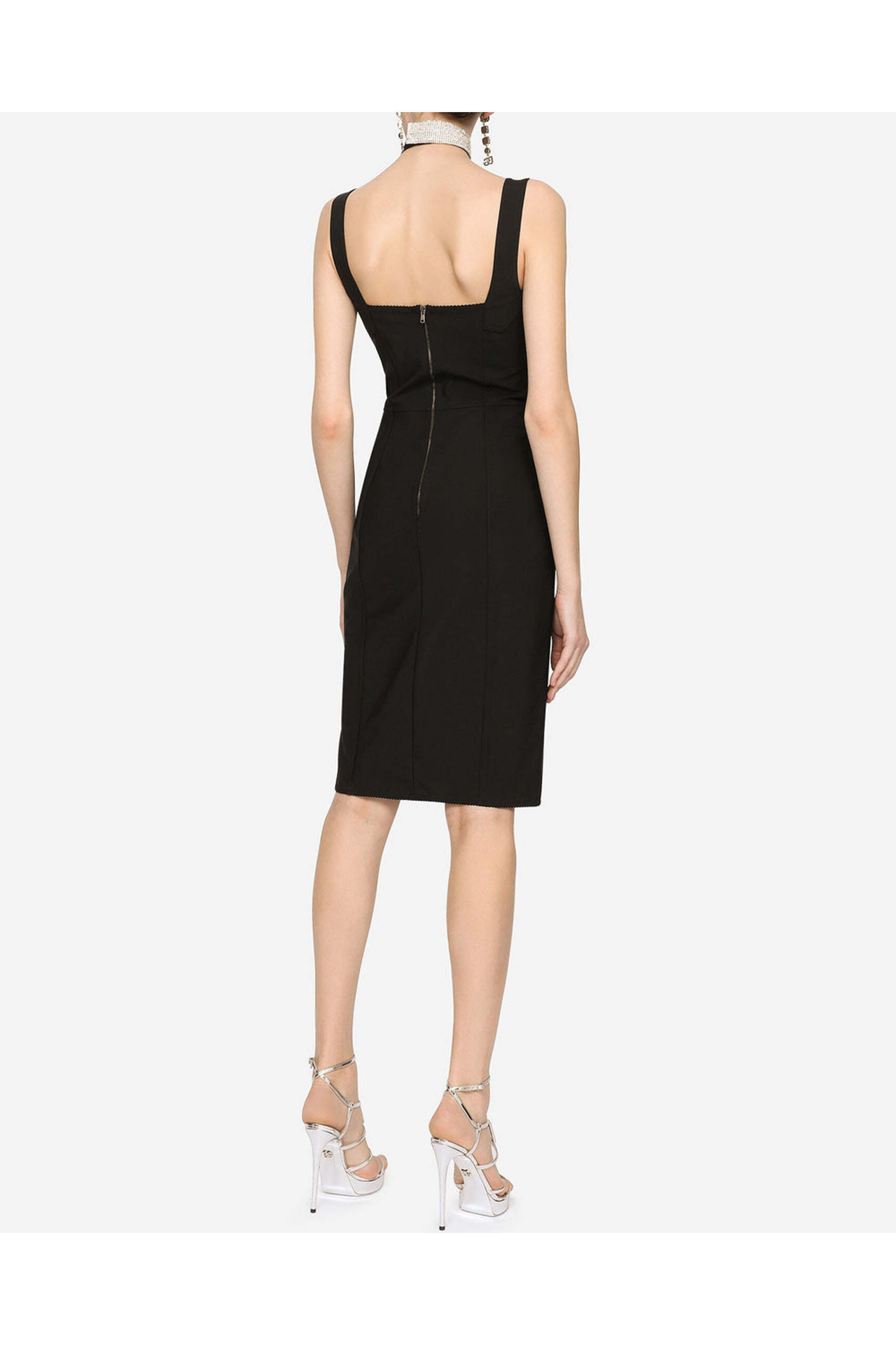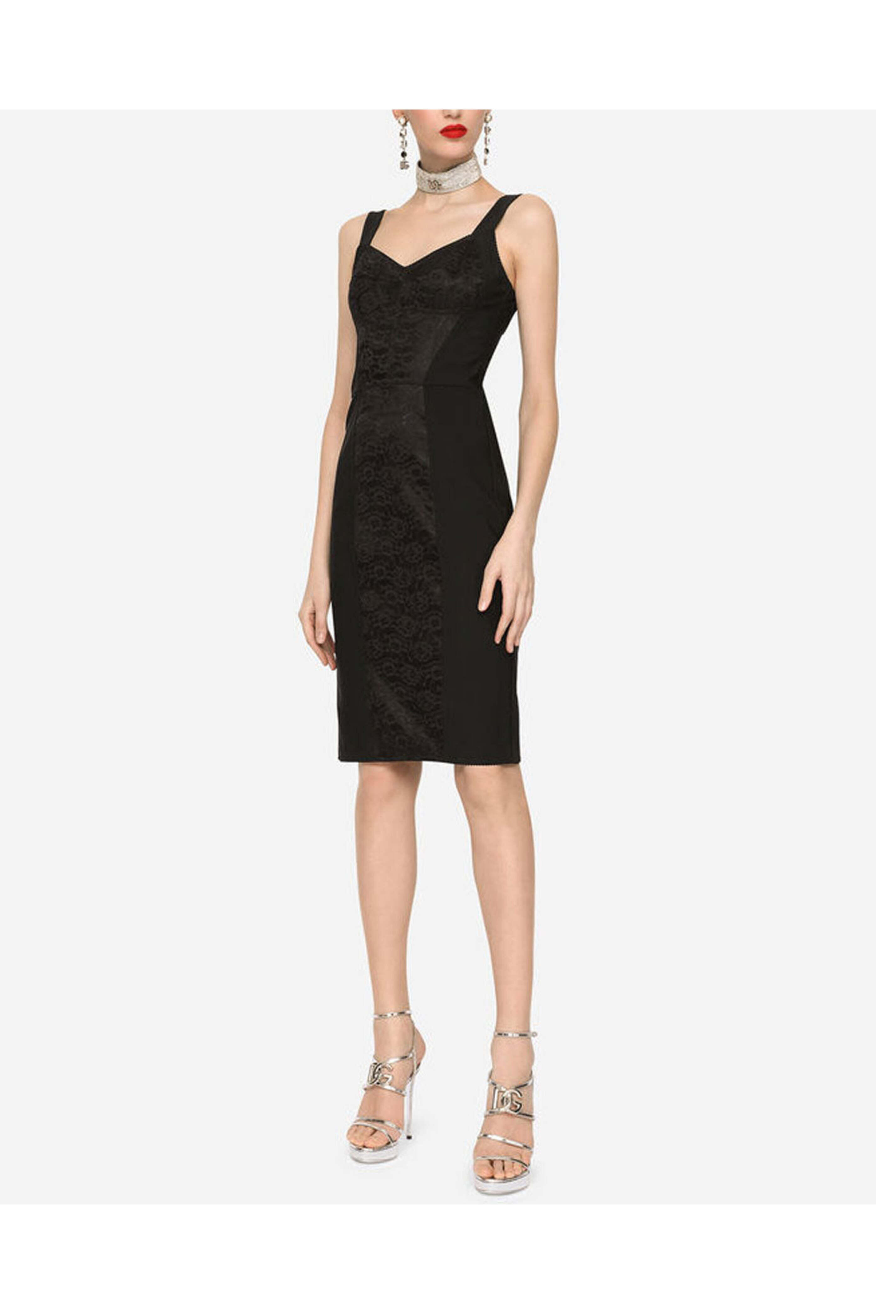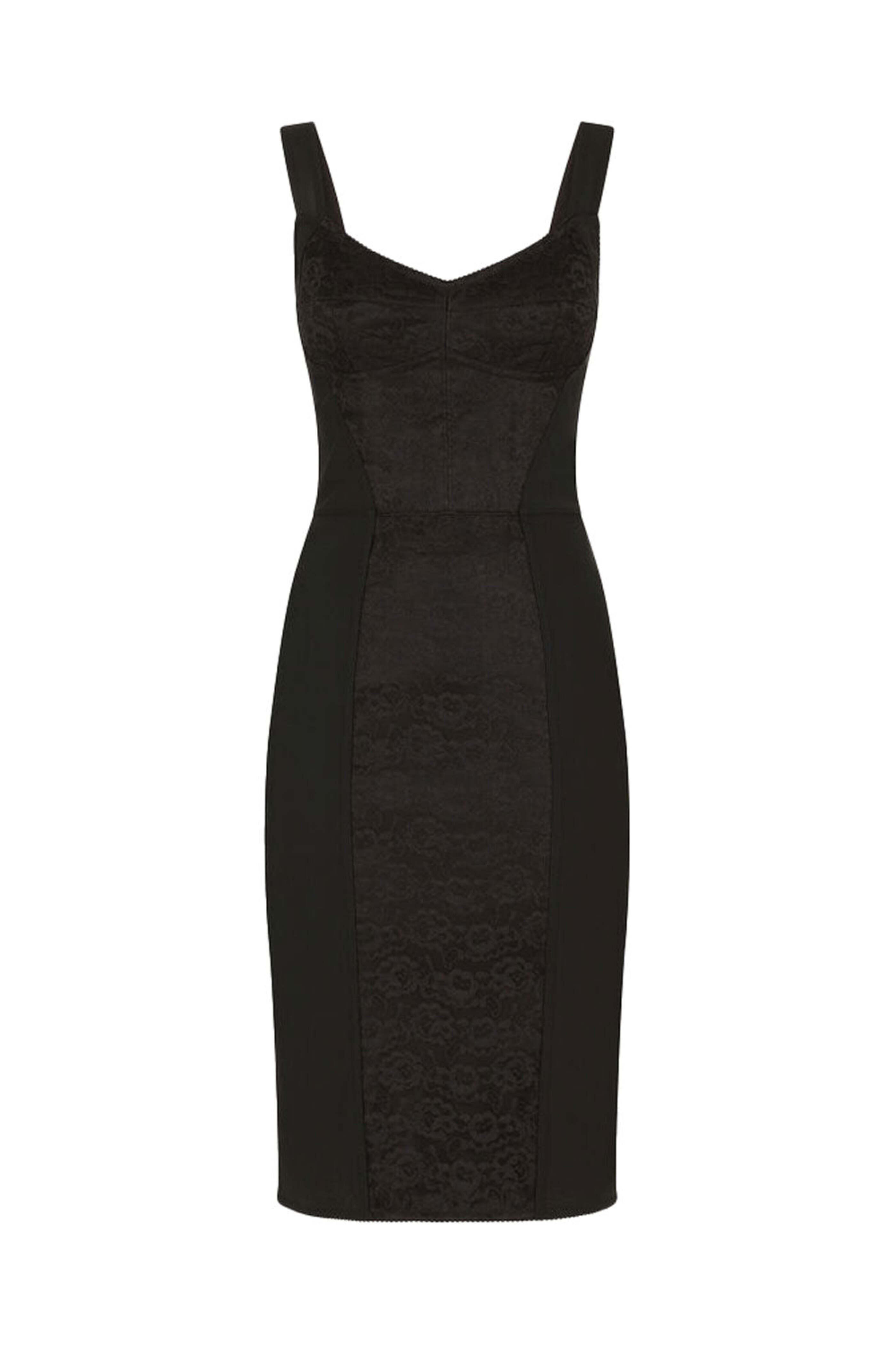 Dolce & Gabbana Black Lace Sleeveless Mini Dress. Sweetheart v neck. Square back. Sleeveless. Corset style bustier. Concealed back zip closure. Front lace panel detail. Slim silhouette. Knee length. Lined. Made in Italy. 87% polyamide, 13% spandex.