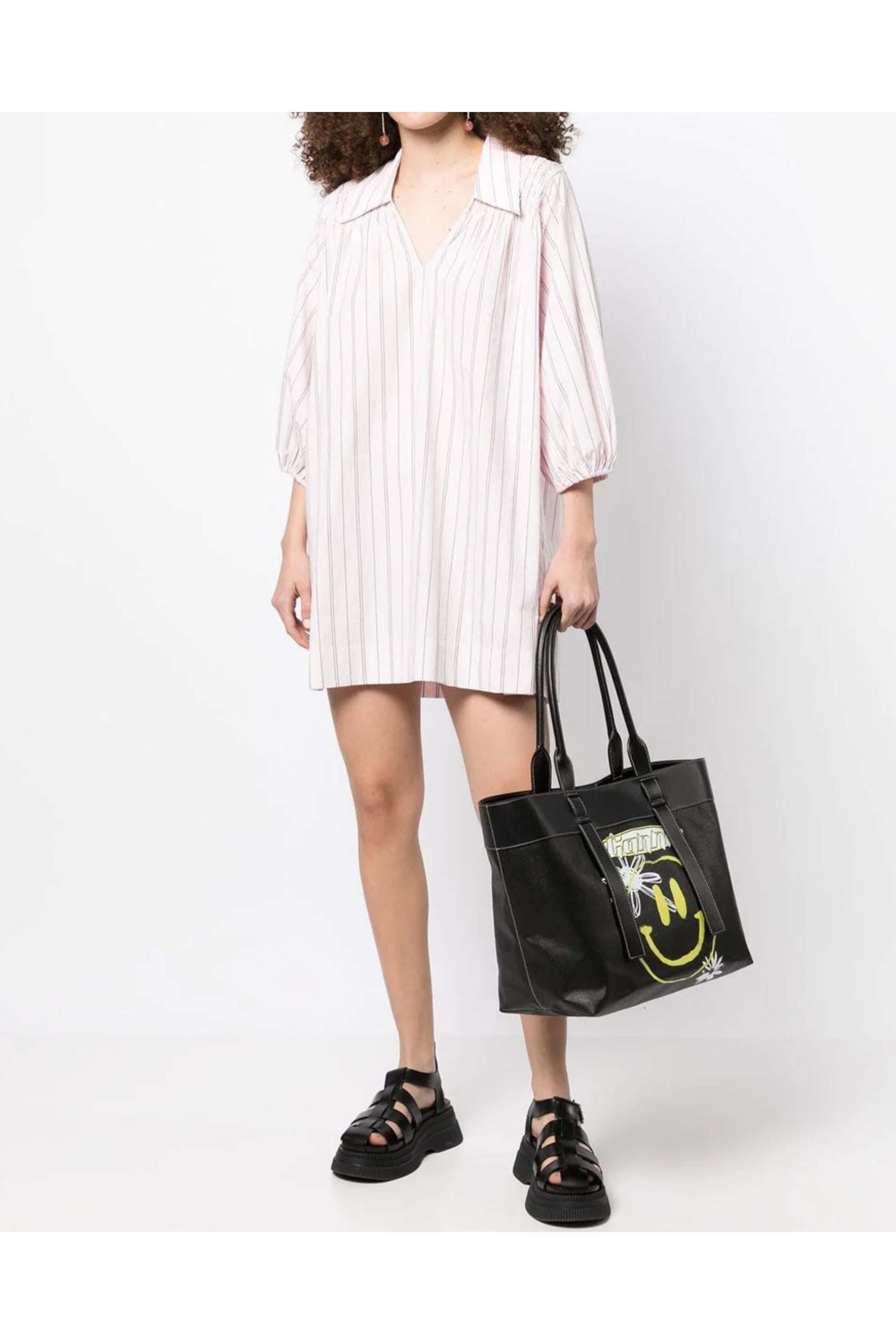Ganni Shrinking Violet Stripe Cotton V Neck Mini Dress. V Neck with collar. Elbow length blouson sleeves. Back smocked detail. Mini length. Relaxed fit. 100% Cotton.