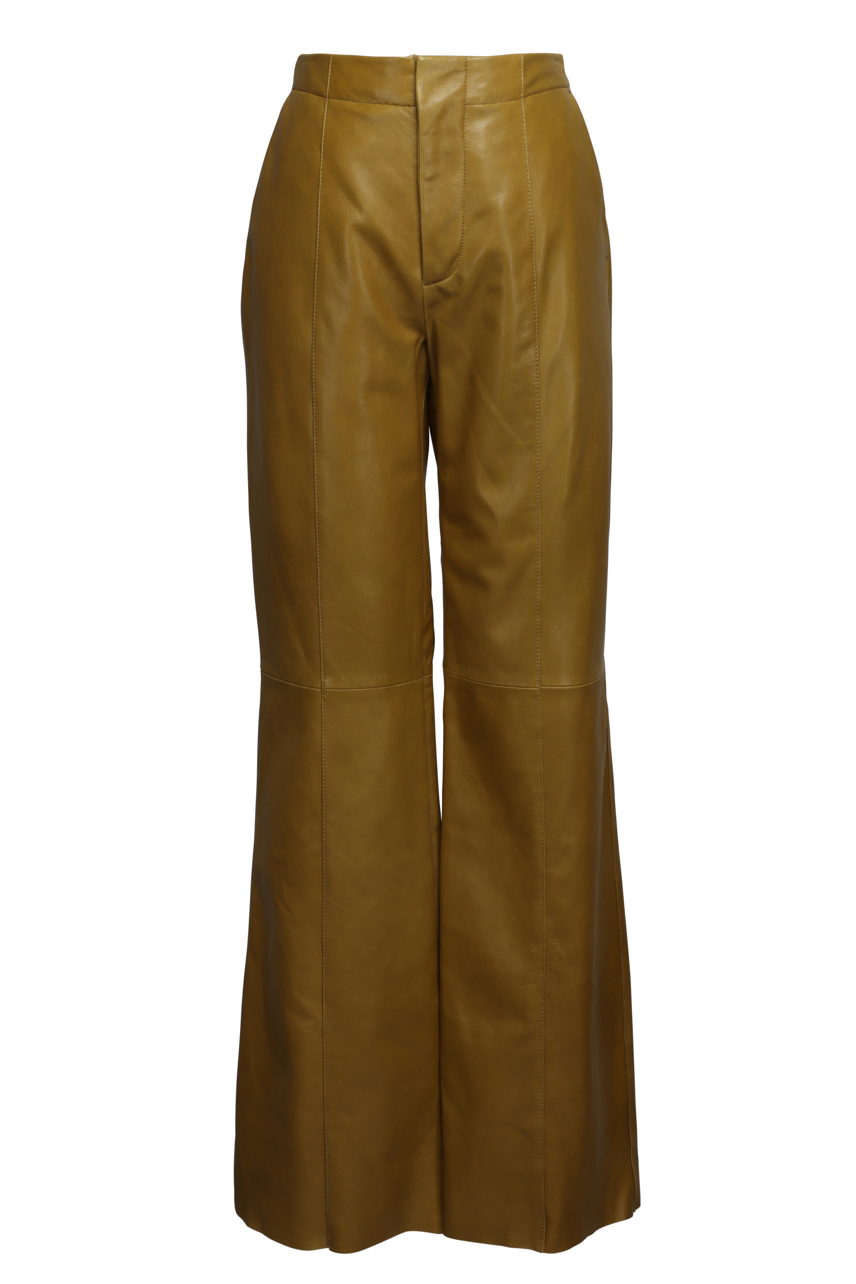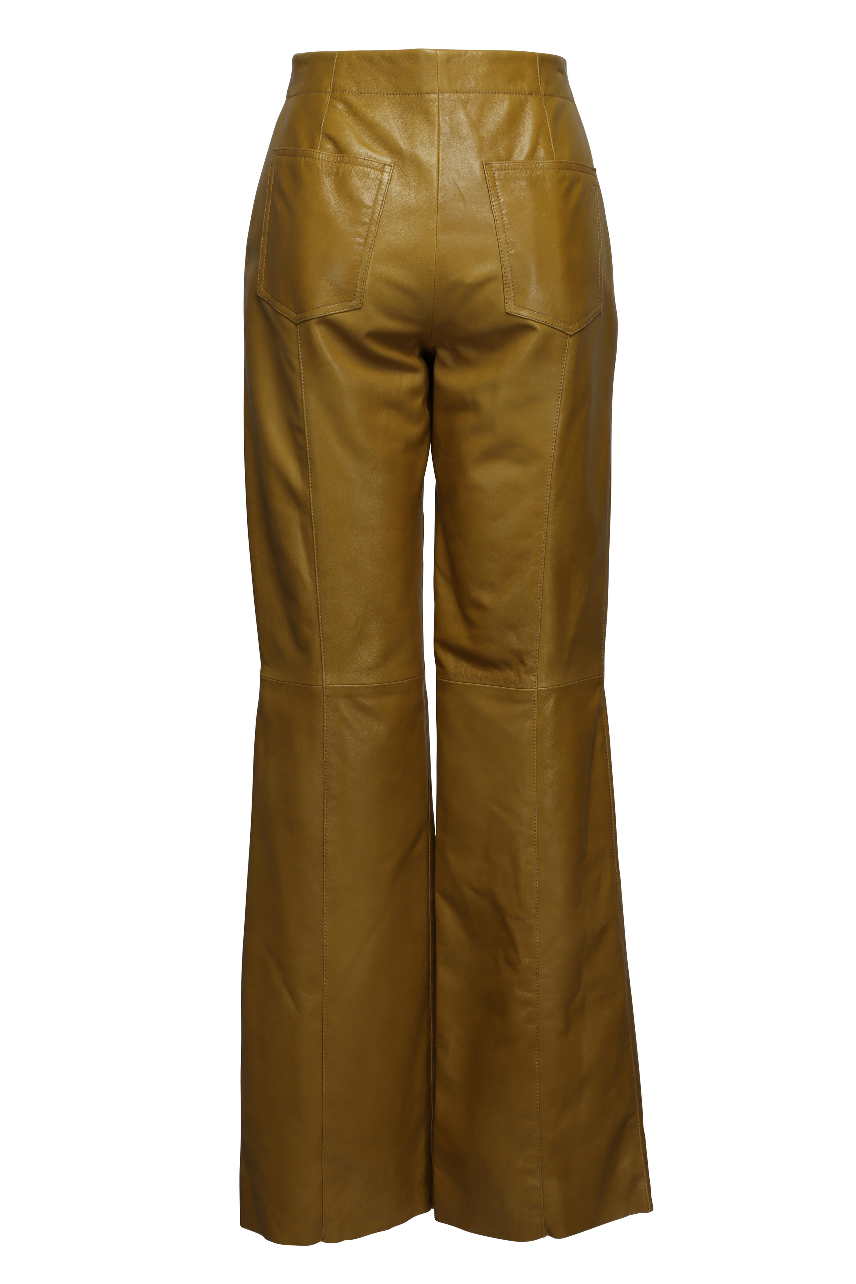 Mid rise. Hook and eye closure. Zip fly. Back patch pockets. Straight silhouette. Wide hem. Imported. Rise 11.375” (US 4). Inseam 33” (US 4). Length 43.75” (US 4). 100% leather. Dry clean.