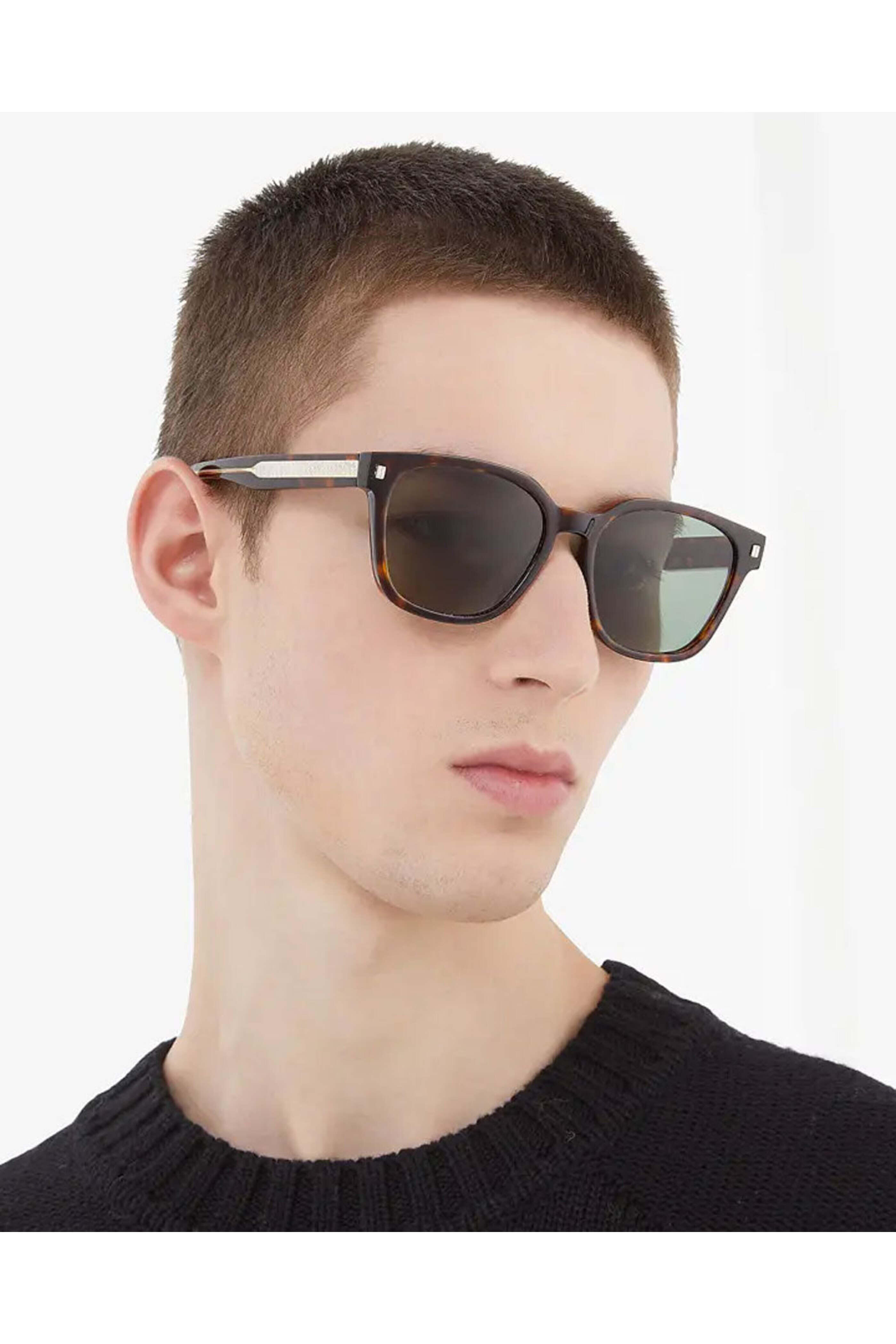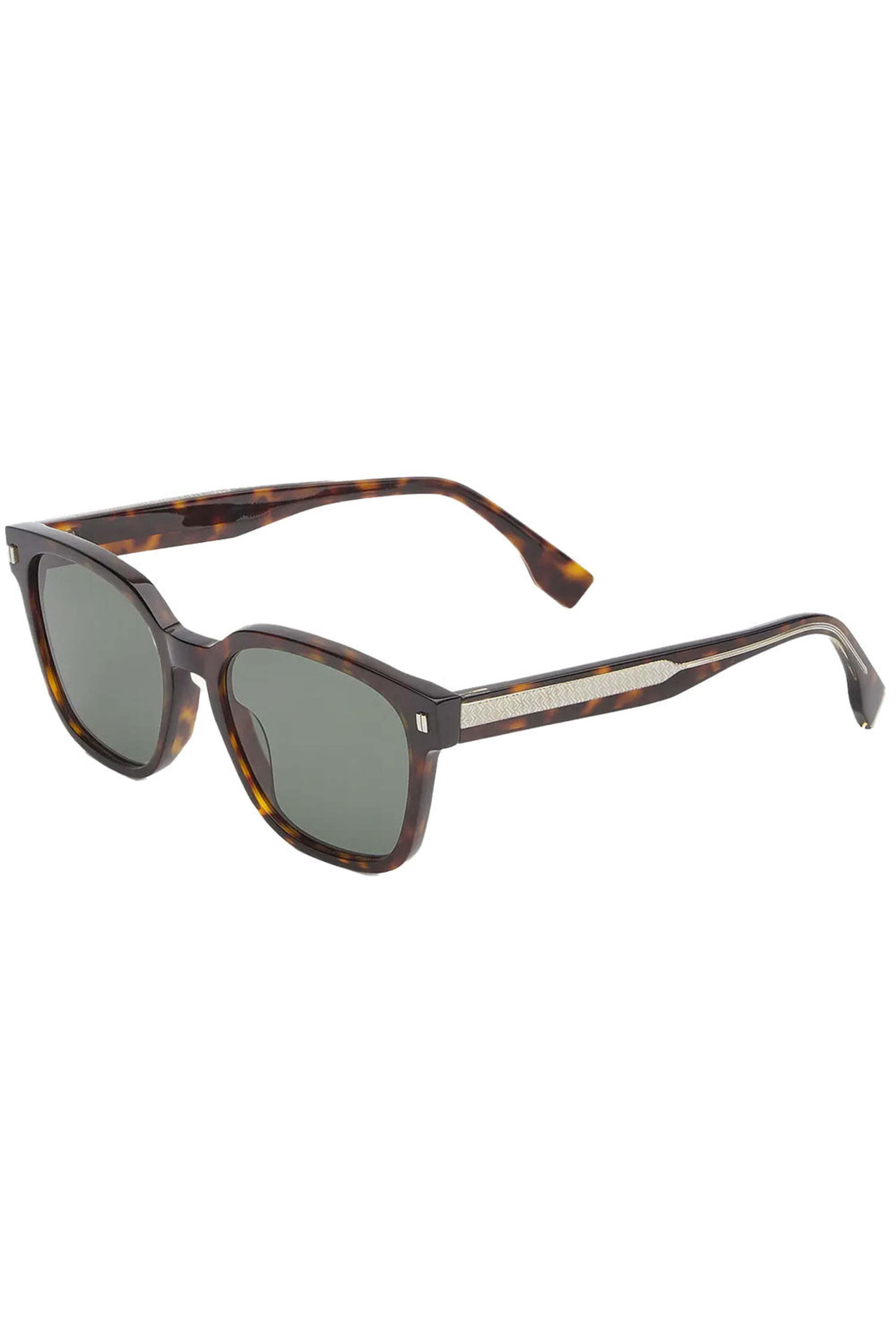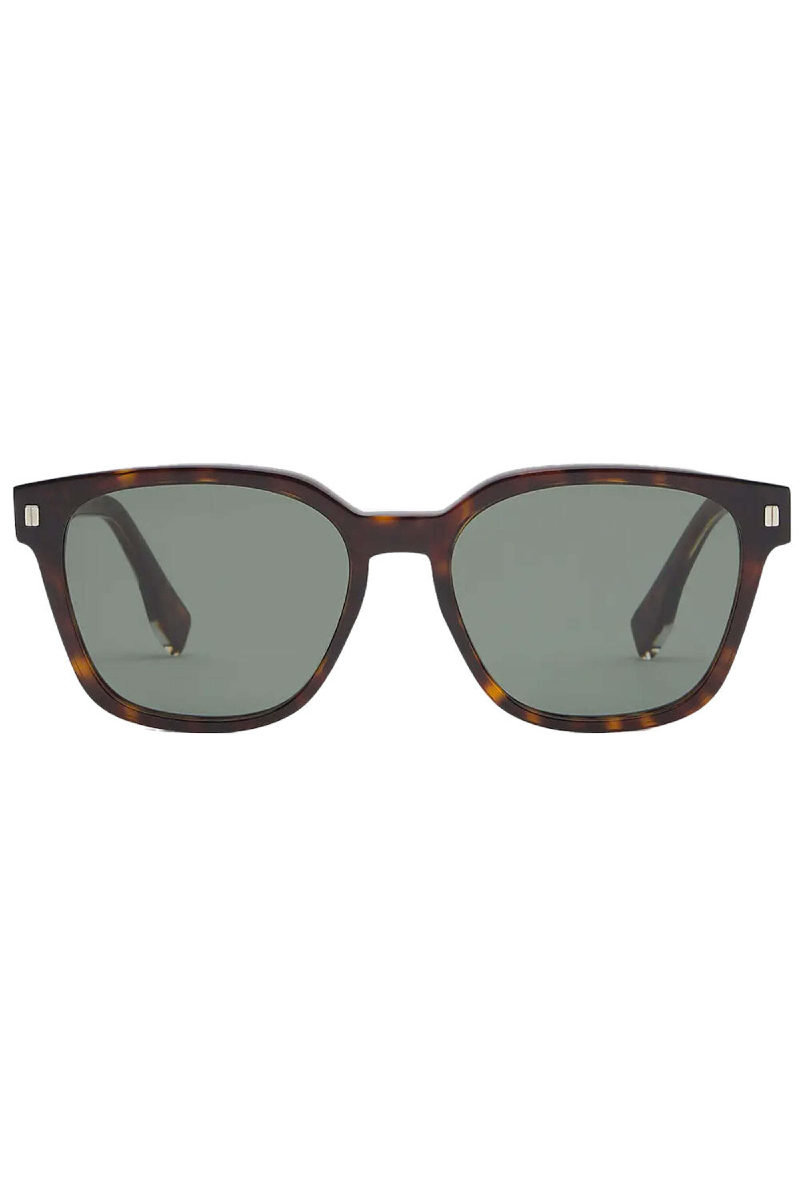Fendi Square Acetate Sunglasses in Tortoise. Havana acetate frames. Dark green lens. Metal Pequin front rivets. Branded metal temples. Made in Italy.