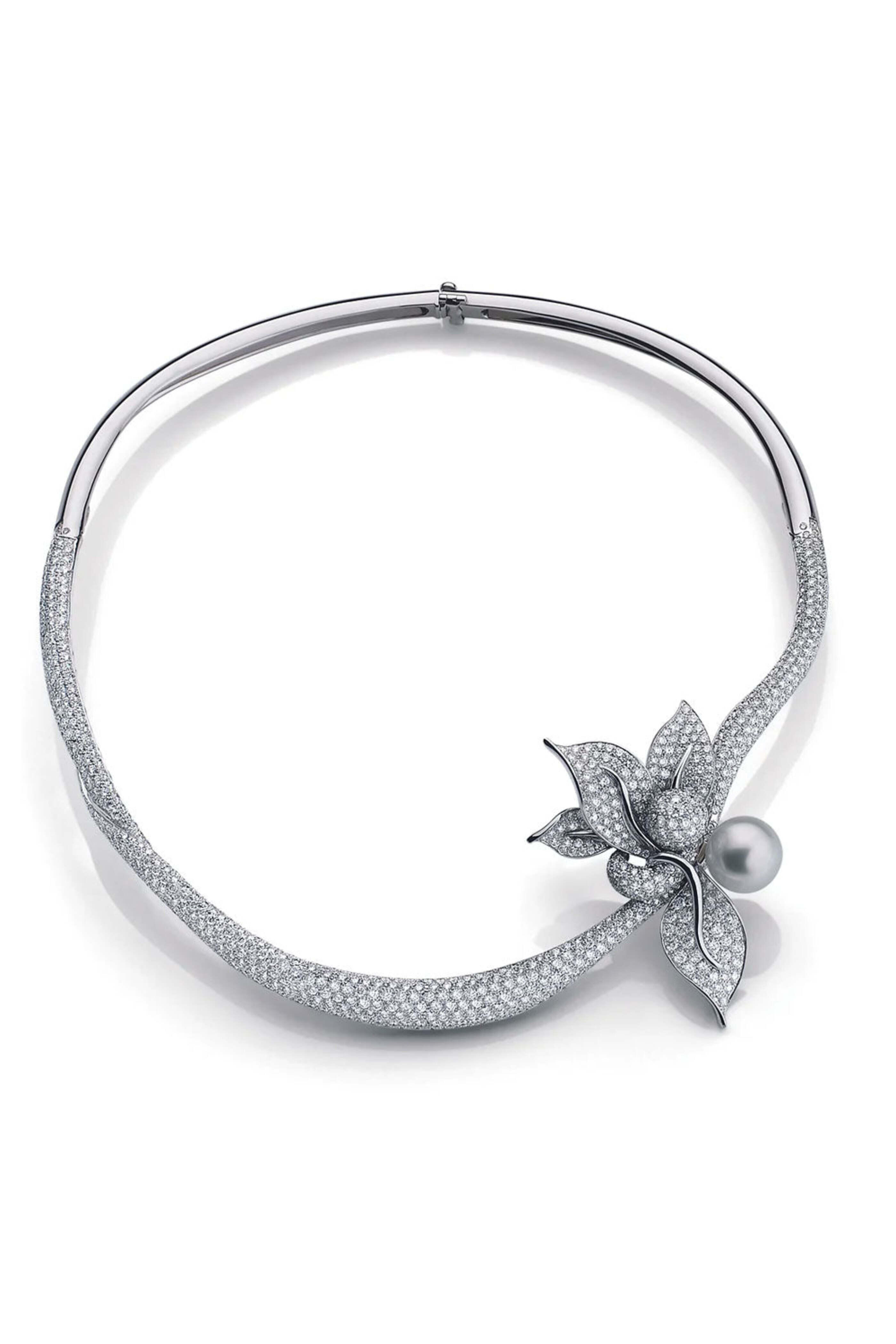 Garnazelle Feedbois Diamond and Pearl Necklace. 18k white gold. Diamond 22.55 total carat weight. 1 pearl. Diamond leaf design. Tube lock closure.