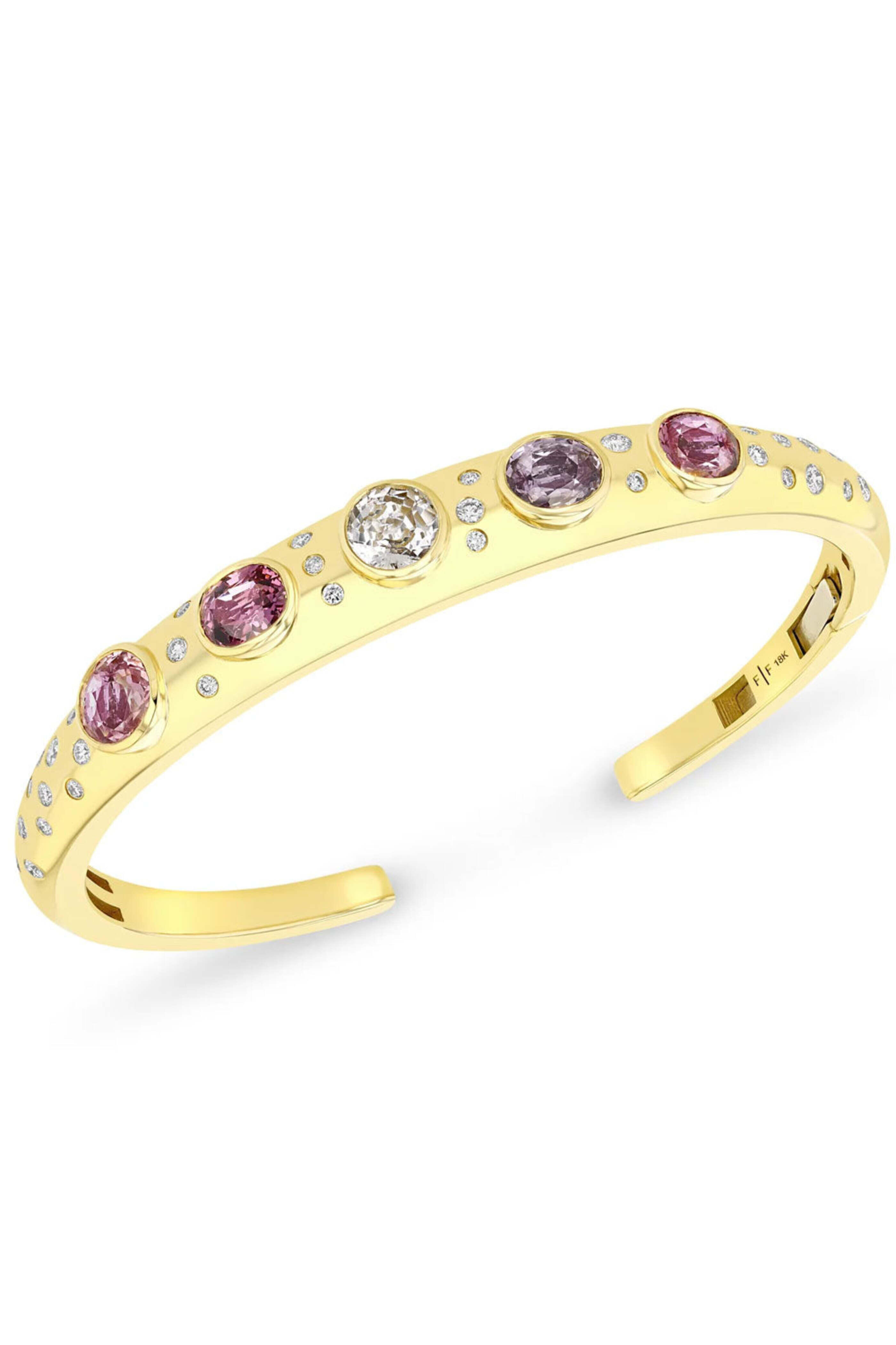 Future Fortune Diamond and Spinel Flare Bracelet. 18k yellow gold. Spinel. Diamond. Oval bracelet. Bezel set spinels. Burnish set diamonds. 2.28. Hinge opening. Made in the USA.