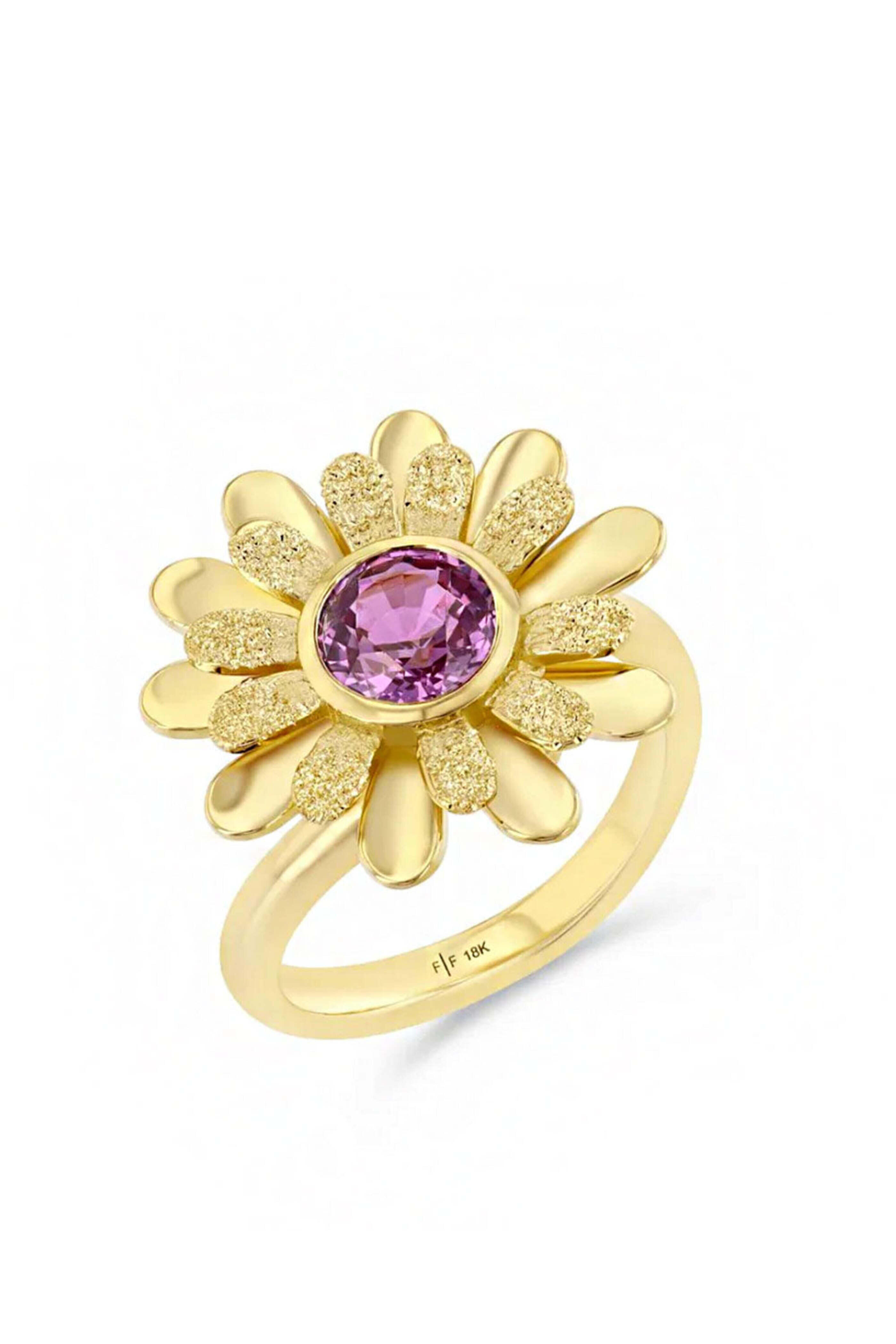Future Fortune Mini Wildflower Ring. 18k gold. Pink sapphire. Flower design. Gold bezel center. 6 ring size. Handcrafted in L.A.