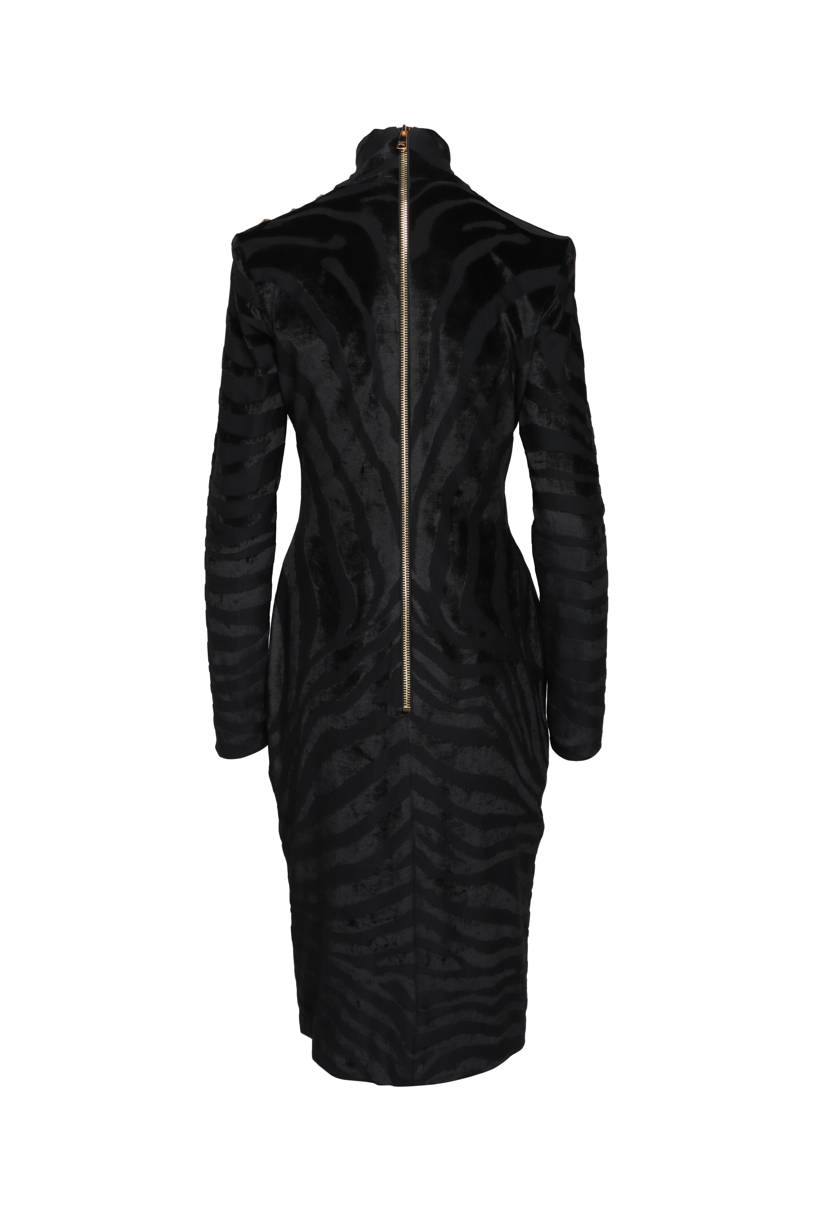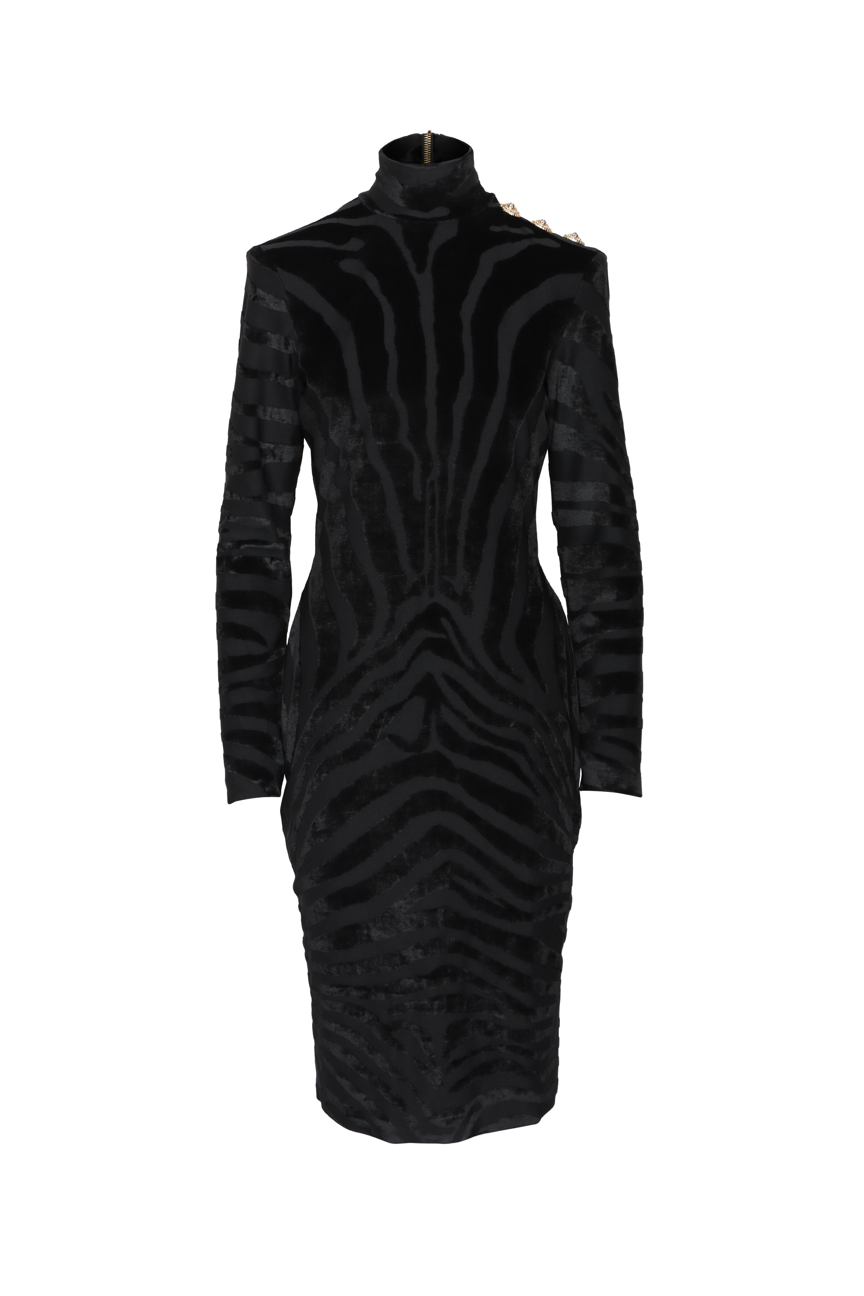 Mockneck. Structured shoulders. Gold tone statement button detail at left shoulder. Long sleeves. Concealed back zip closure. Slim silhouette. Imported. Mini length. 70% viscose, 30% polyester ; lined. Dry clean.