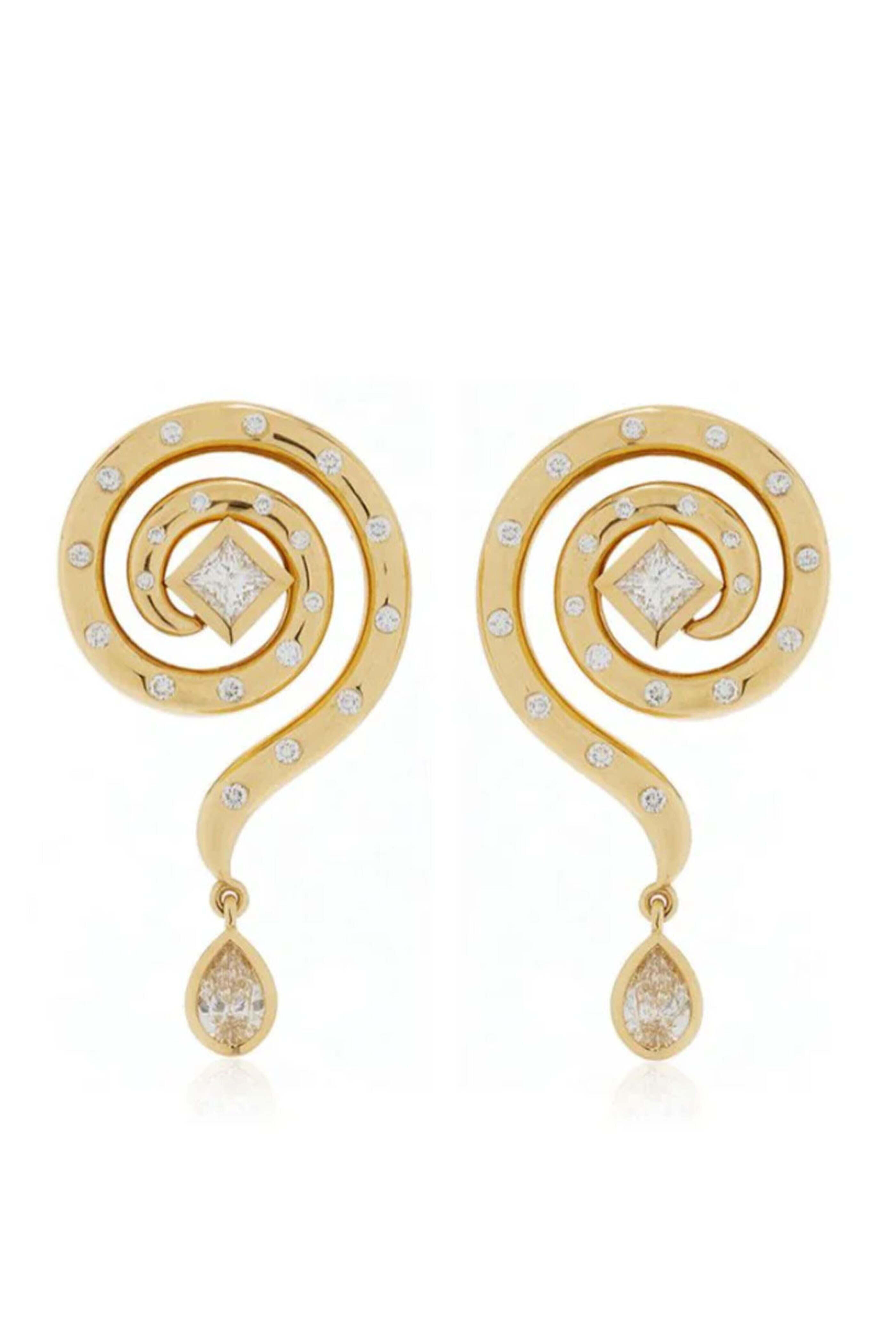 Future Fortune Lucy in the Sky Earrings. 18k gold. Diamond 1.00 total carat weight. Pear cut. Spiral design. Star detailing. Stud style. Push back post. Handcrafted in L.A.