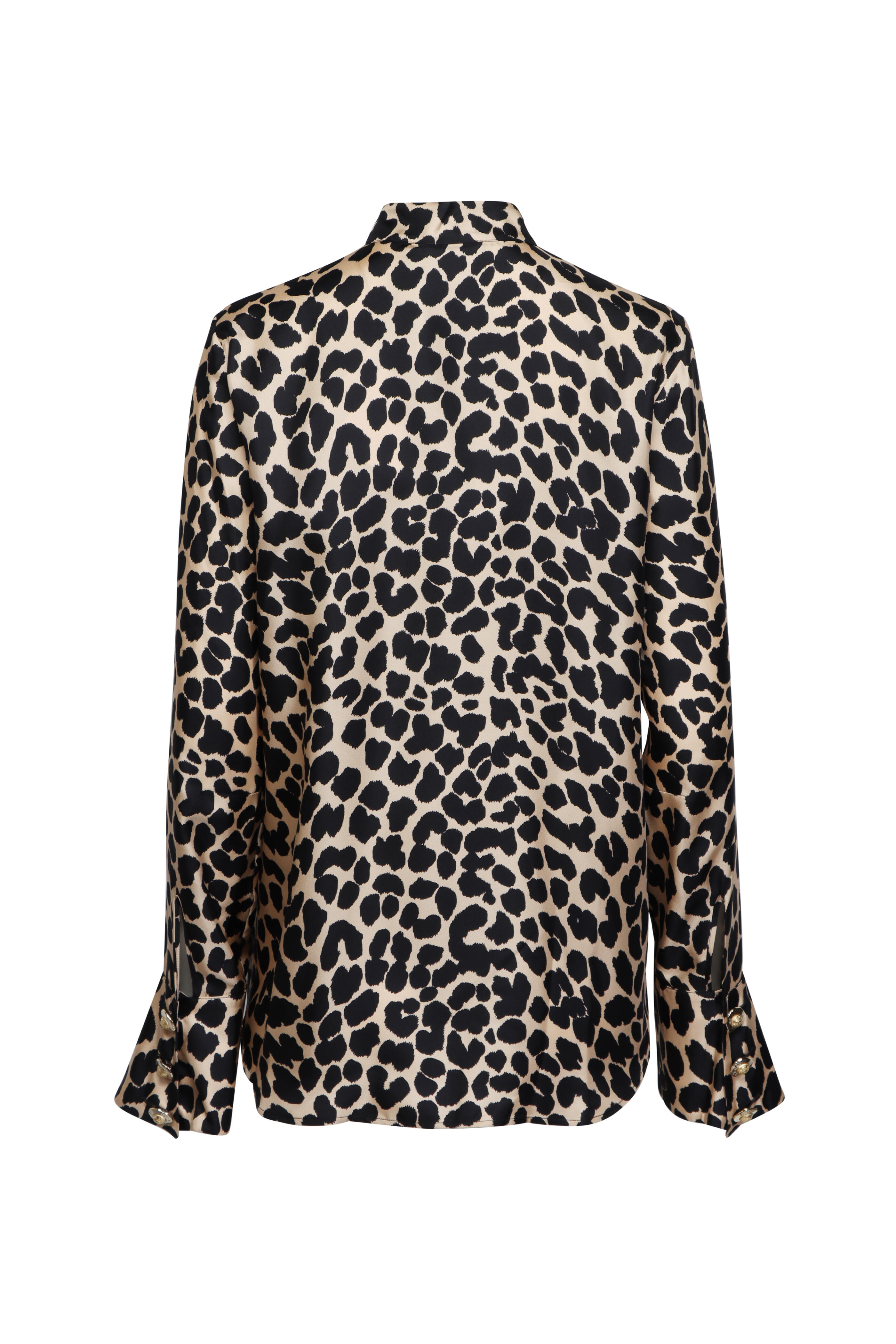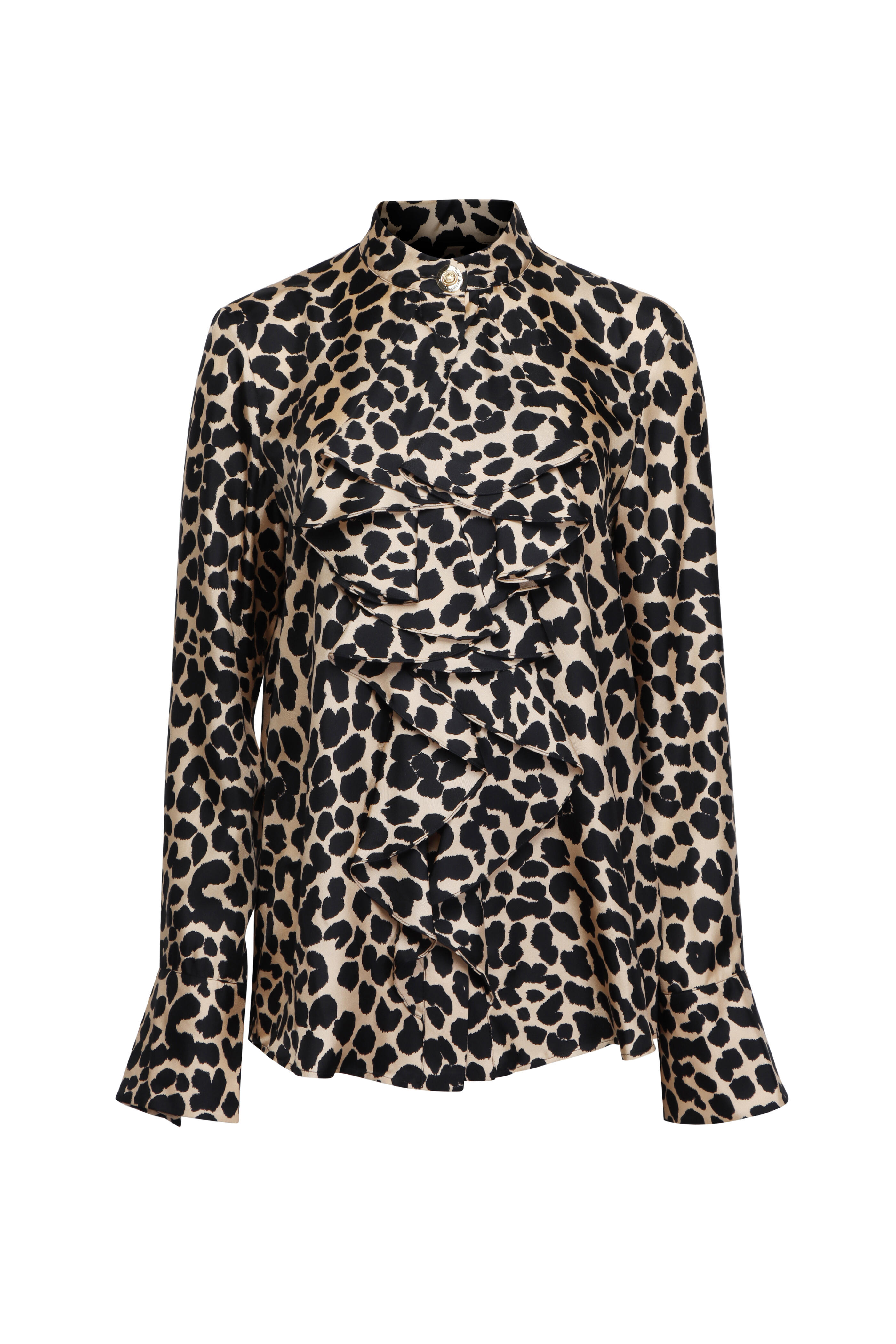 Stand collar. Long sleeves; button cuffs. Button up front closure. Gold tone statement buttons. Ruffle jabot placket detail. Relaxed fit. Rounded hem. Made in Italy. 100% silk. Dry clean.