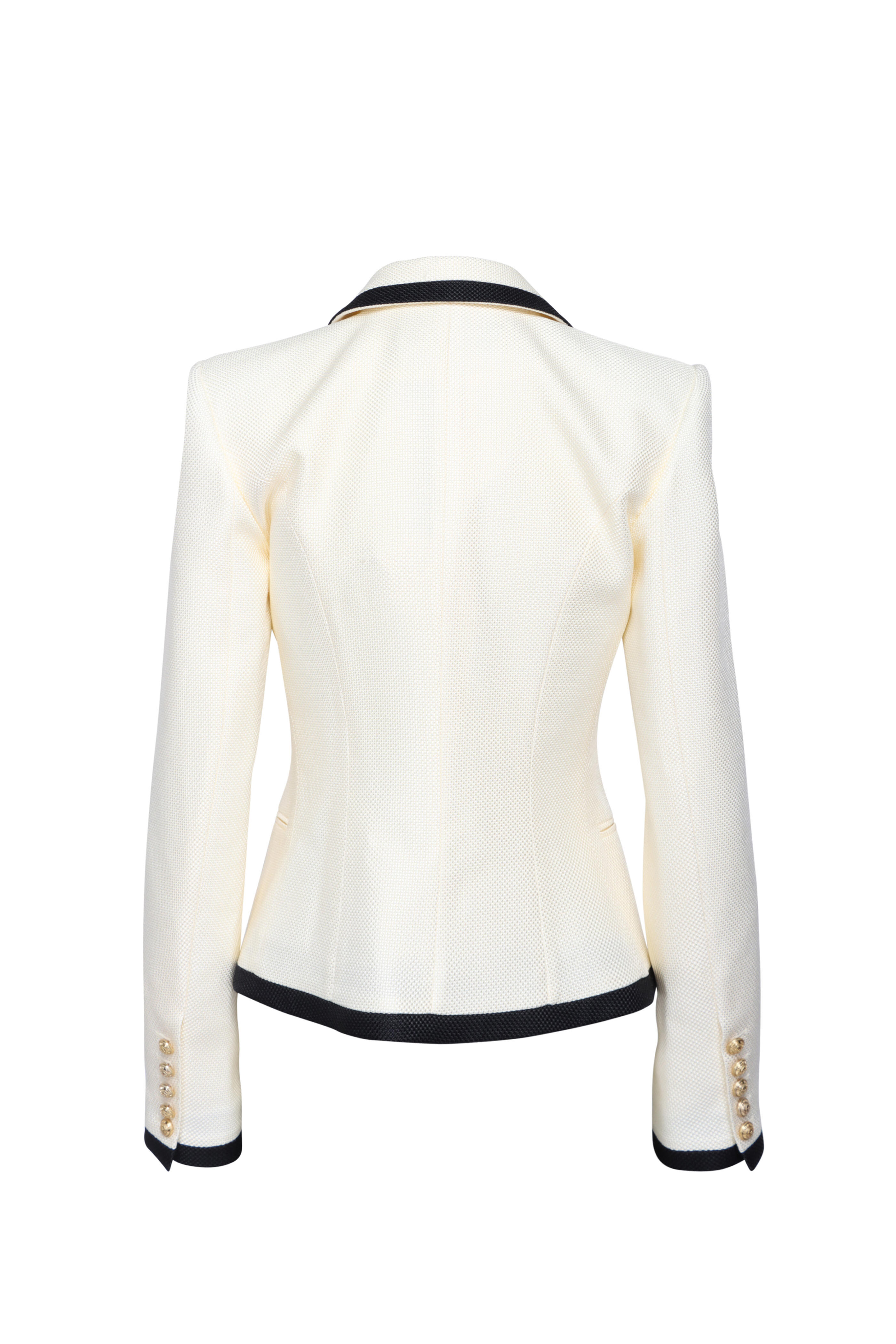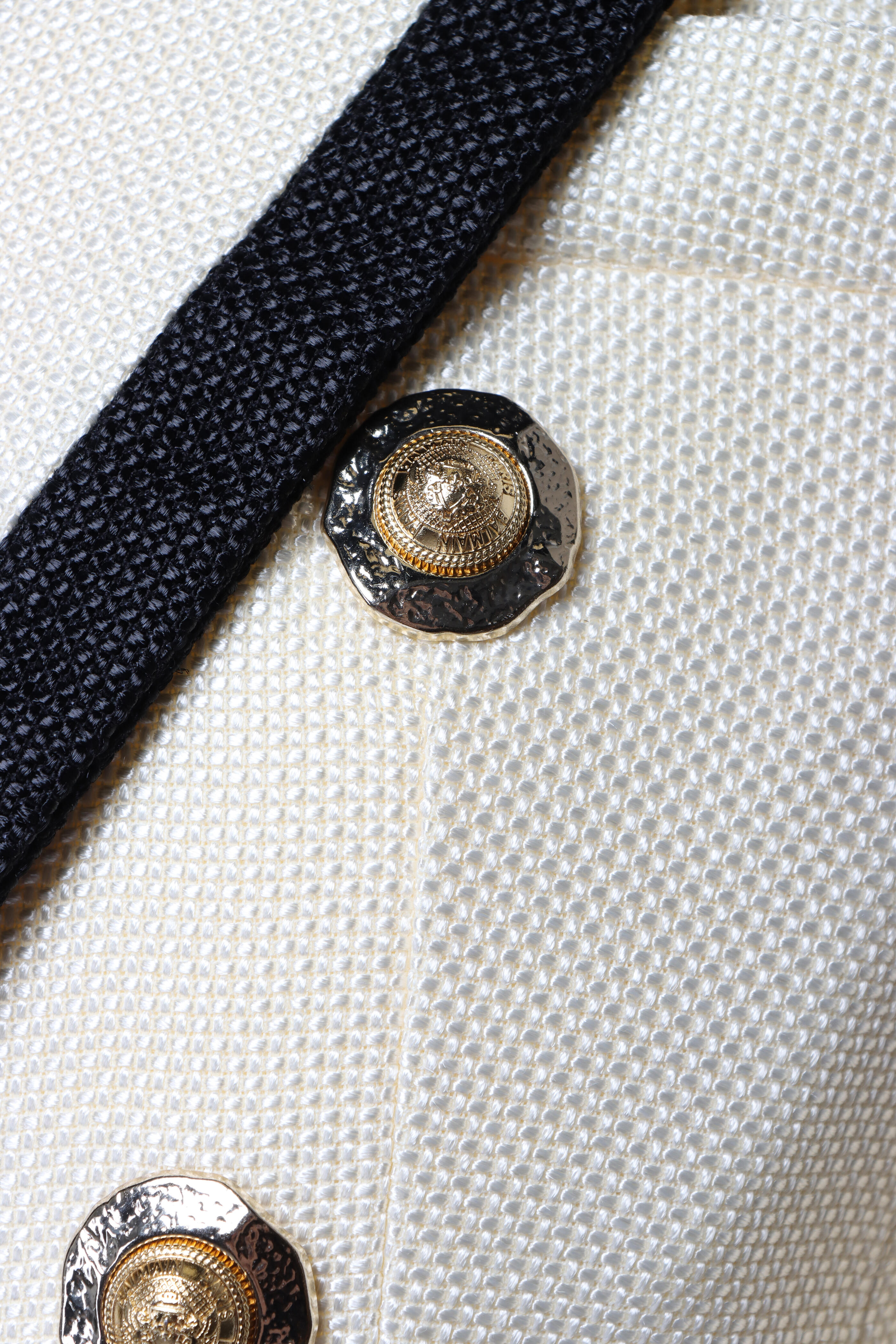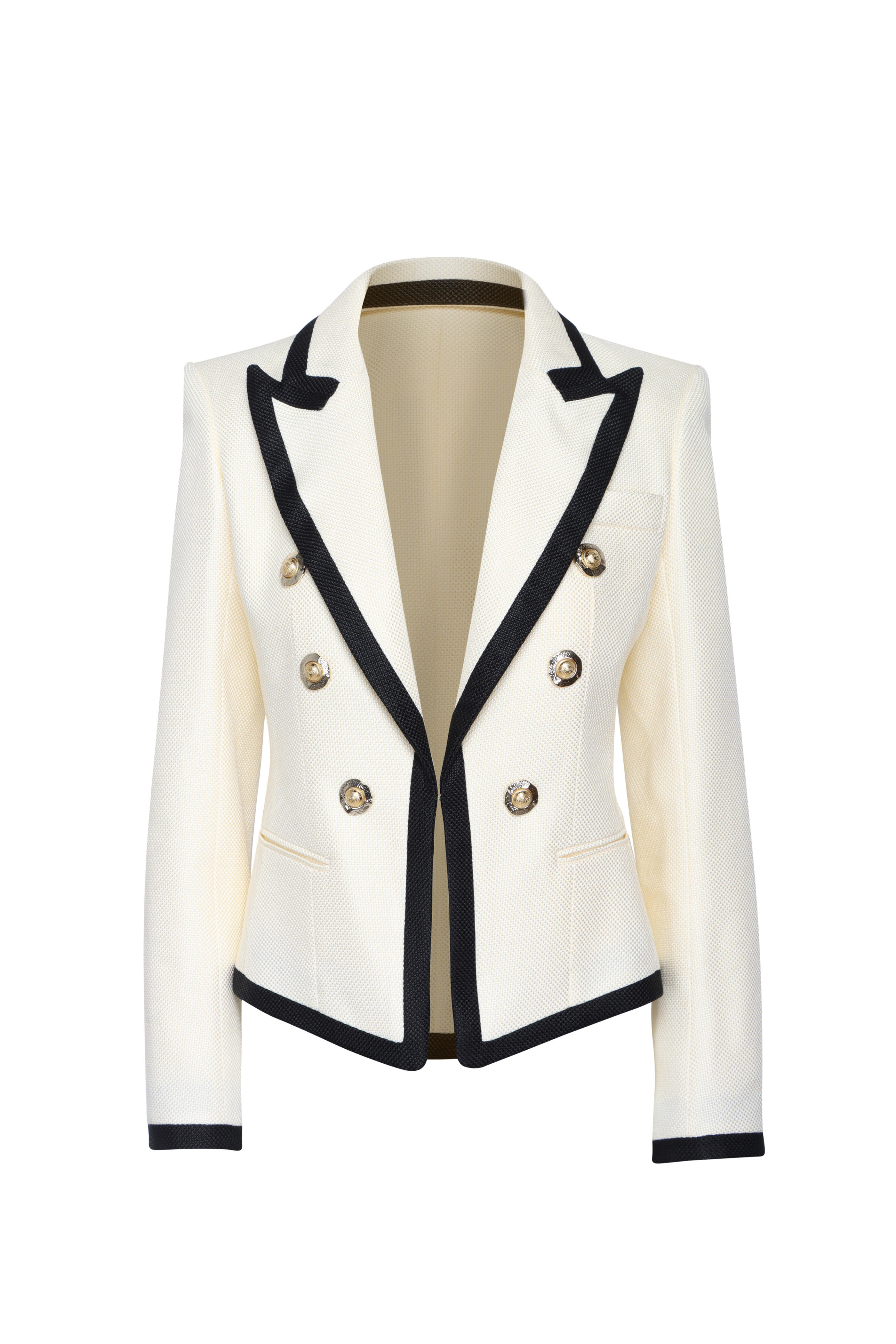 Peak lapel. Long sleeves; button cuffs. Hook and eye closure. Double breasted front button detail. Gold tone statement buttons. Chest welt pocket. Hip welt pockets. Tailored fit. Made in France. 77% viscose, 23% cotton; lined. Dry clean.