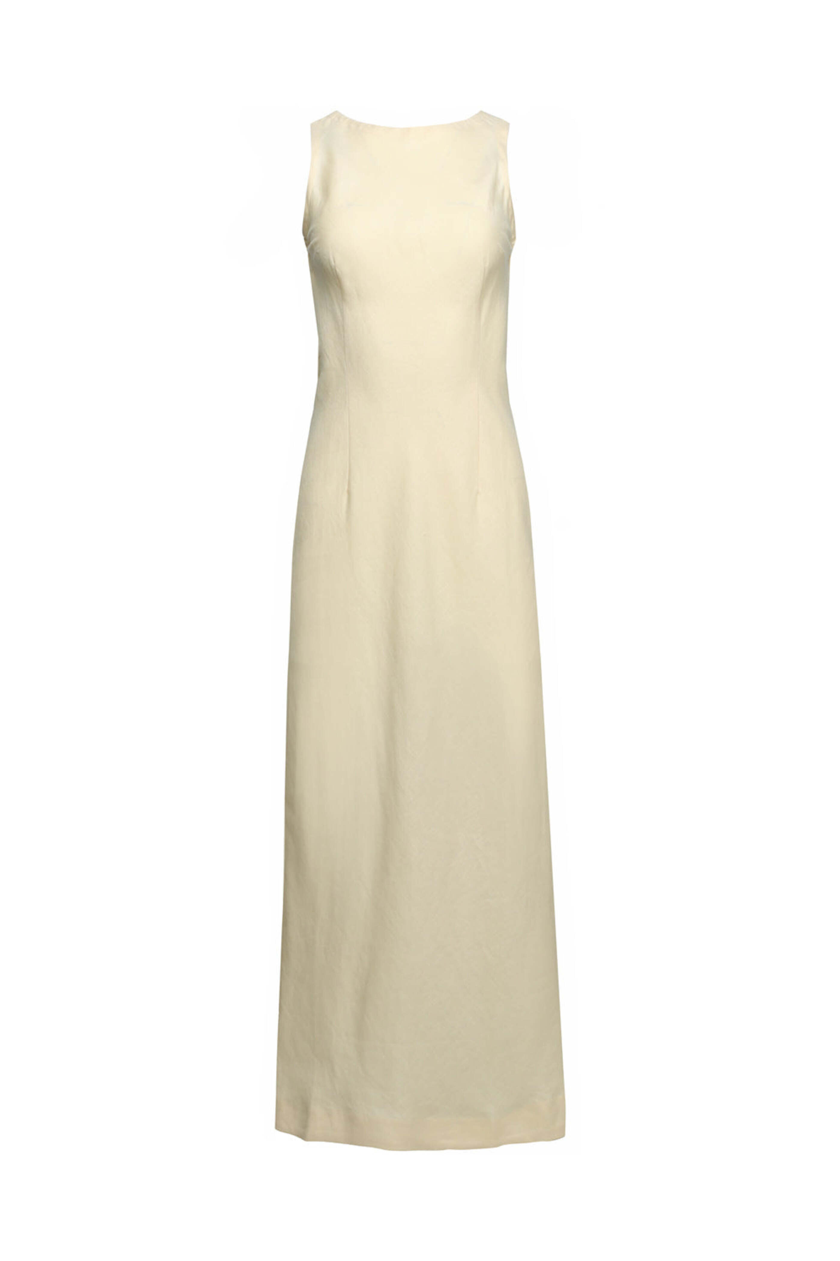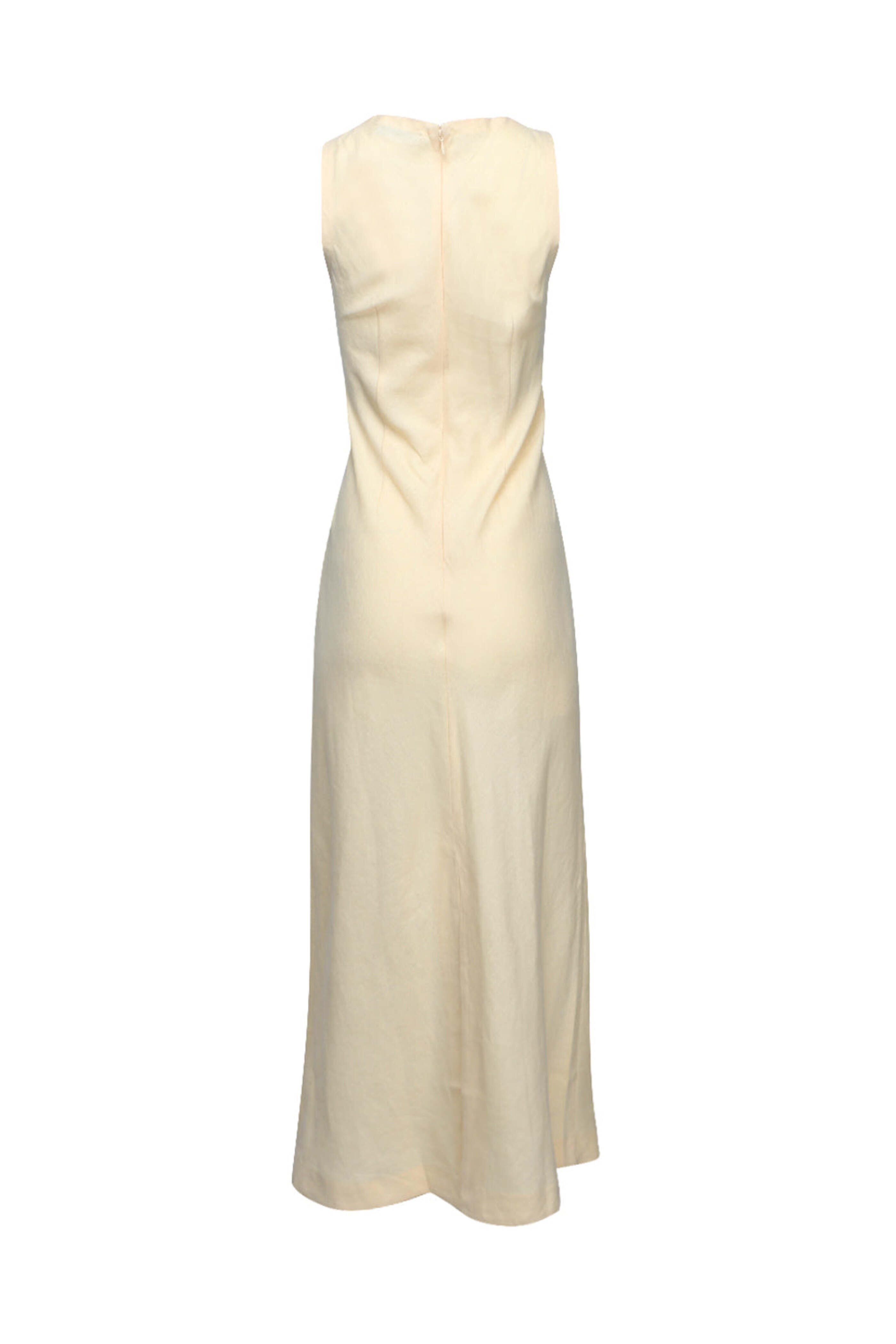 Faithfull Butter Lydie Maxi Dress. Round neck. Sleeveless. Concealed back zip closure. Tailored silhouette. Aline skirt. Ankle to maxi length. 100% linen.