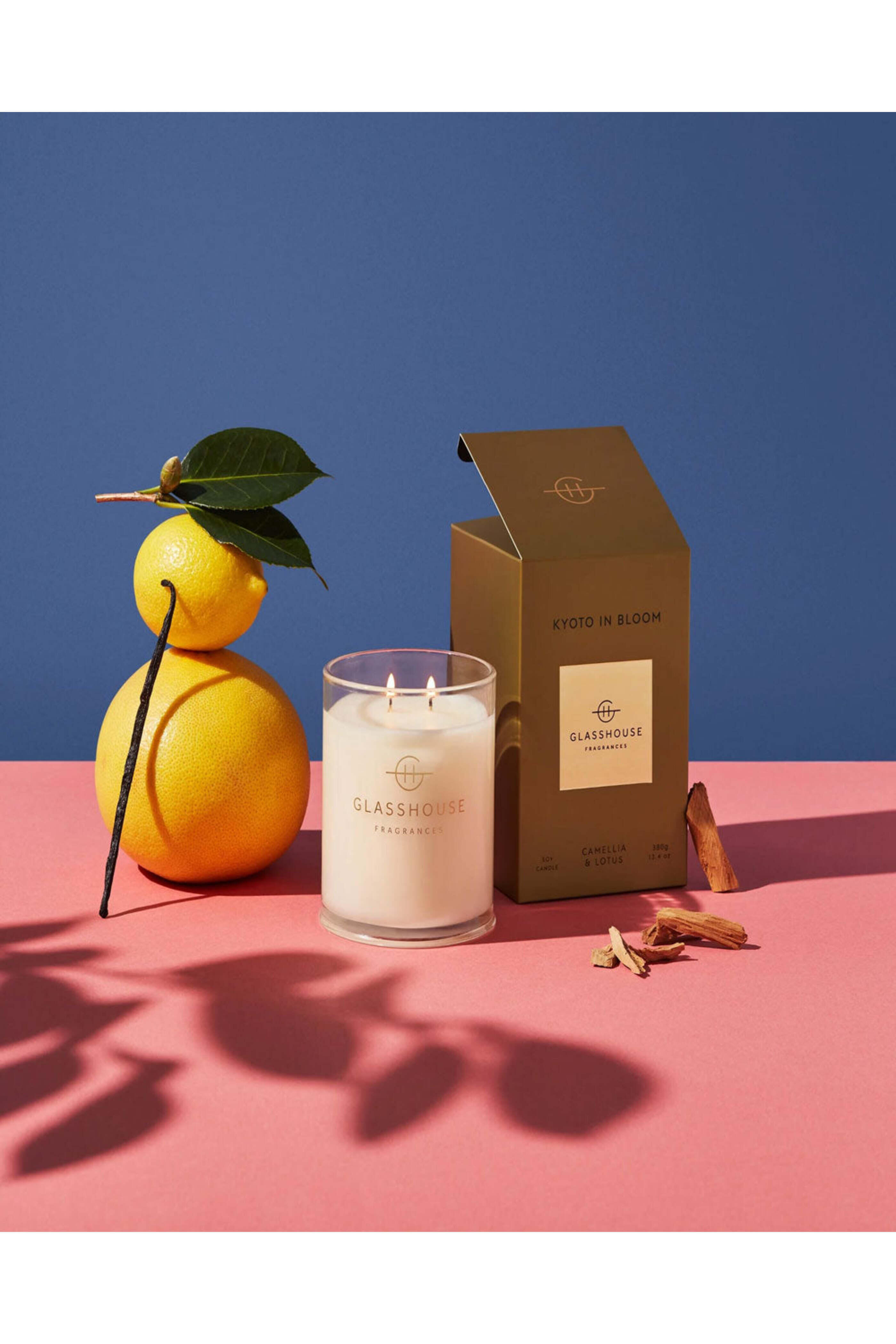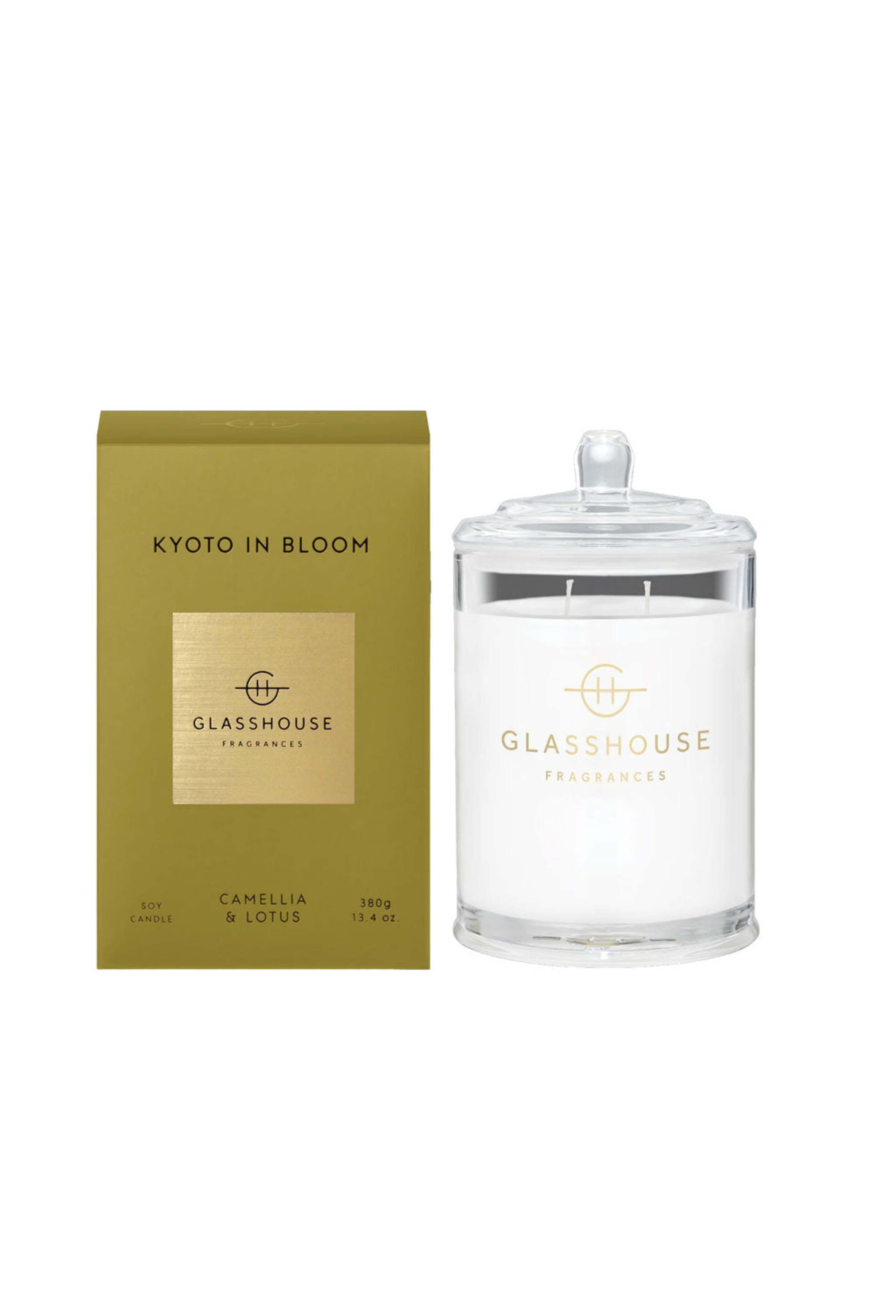 Glasshouse Fragrances Kyoto In Bloom Candle. Top: Fresh Lime, Bergamot, Citrus. Middle: Camellia, Lotus. Base: Amber, Sandalwood, Musk, Vanilla. Free of parabens and silicones. The most intense of fragrance that fills the room, suitable for a large area where the fragrance will go far.