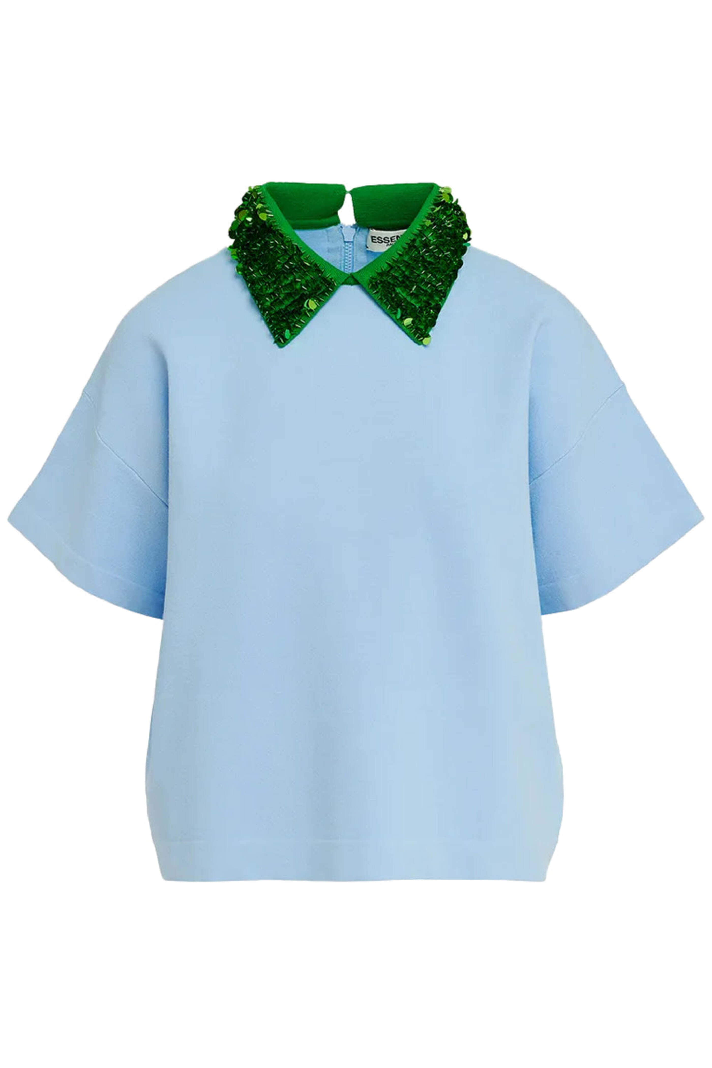 Essentiel Antwerp Feeling Blue Filano Embellished Collar Top. Collar. Back button closure; keyhole detail. Drop shoulders. Short sleeves. Relaxed fit. Straight hem. Sequin detail at collar. 62% viscose, 38% polyester outer, 100% acrylonitrile butadiene styrene detail.