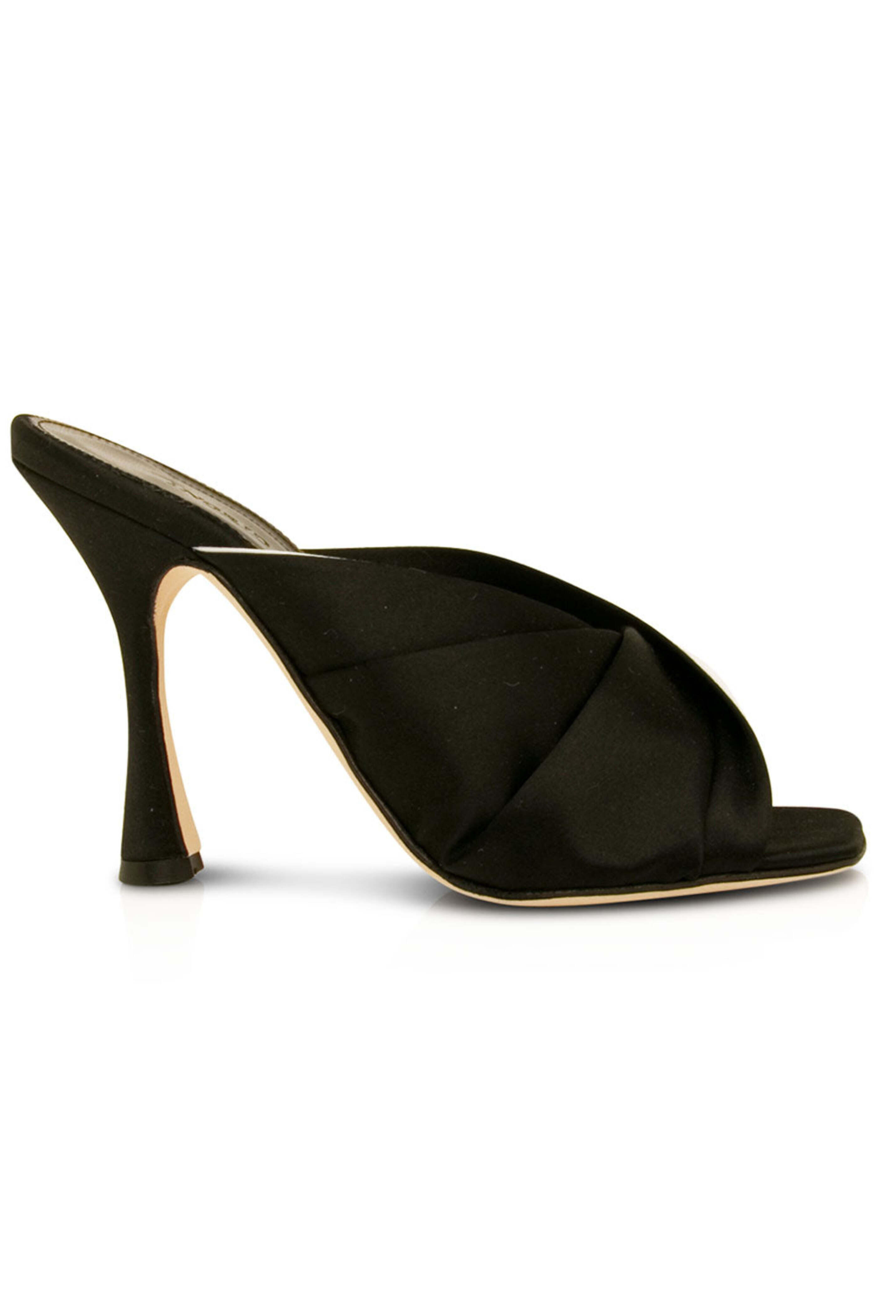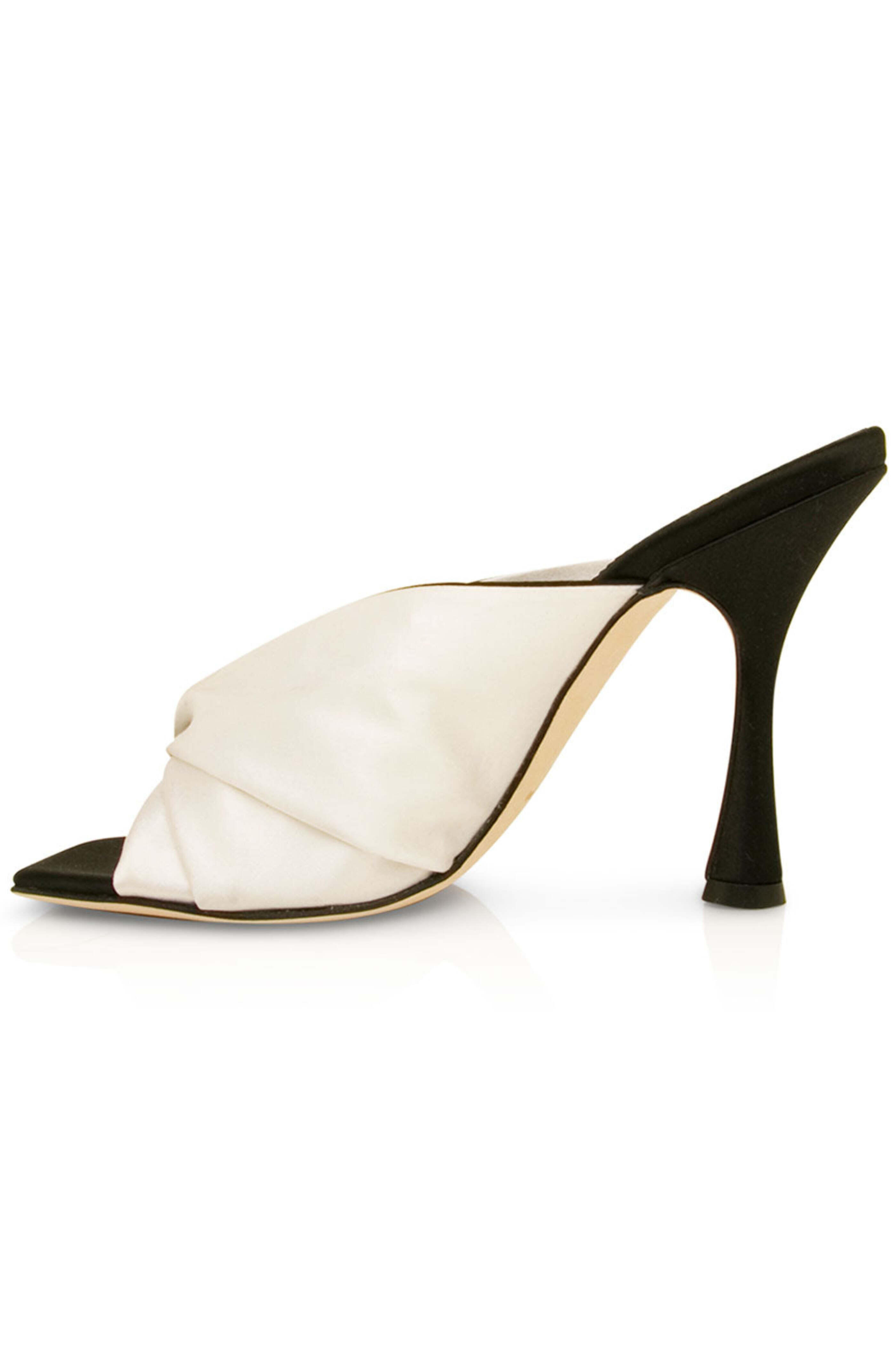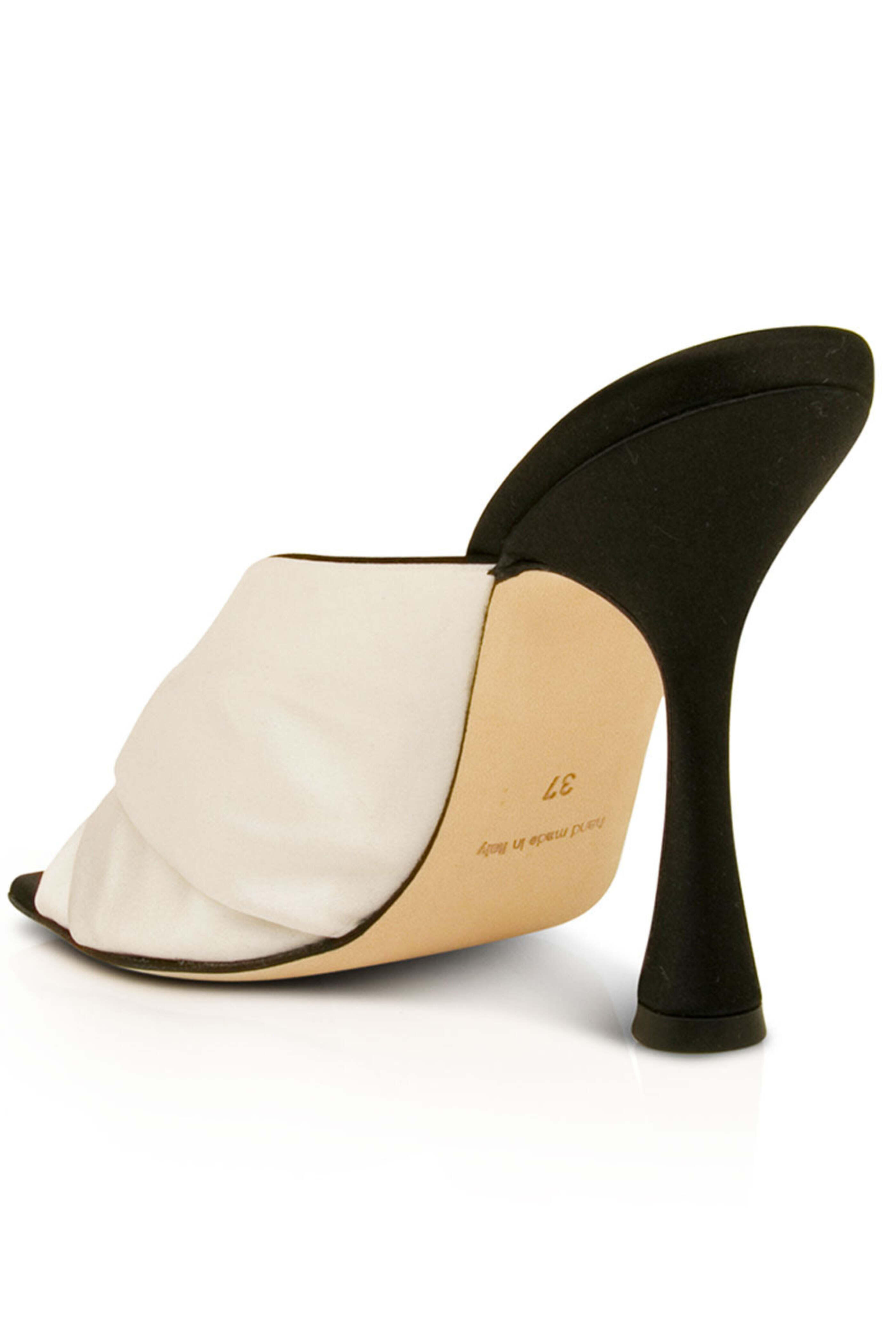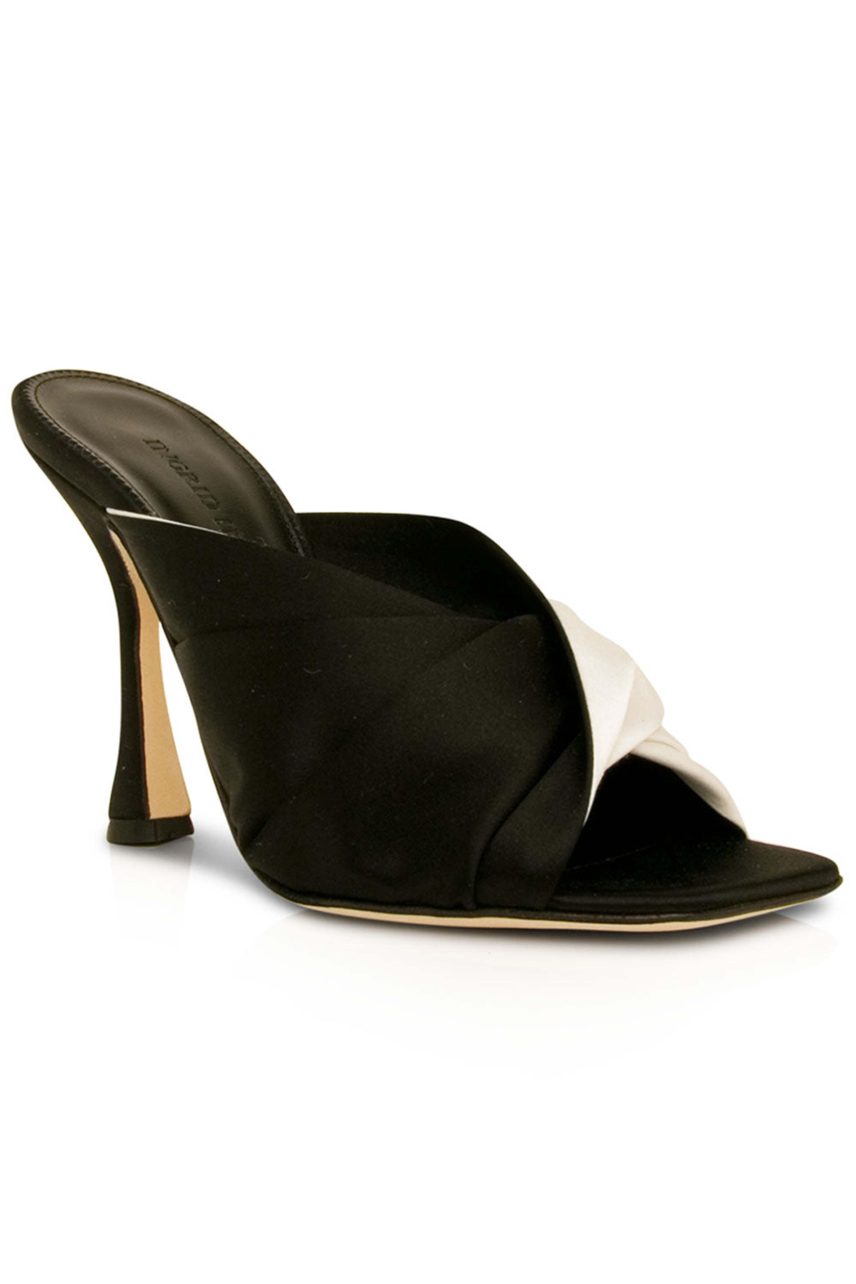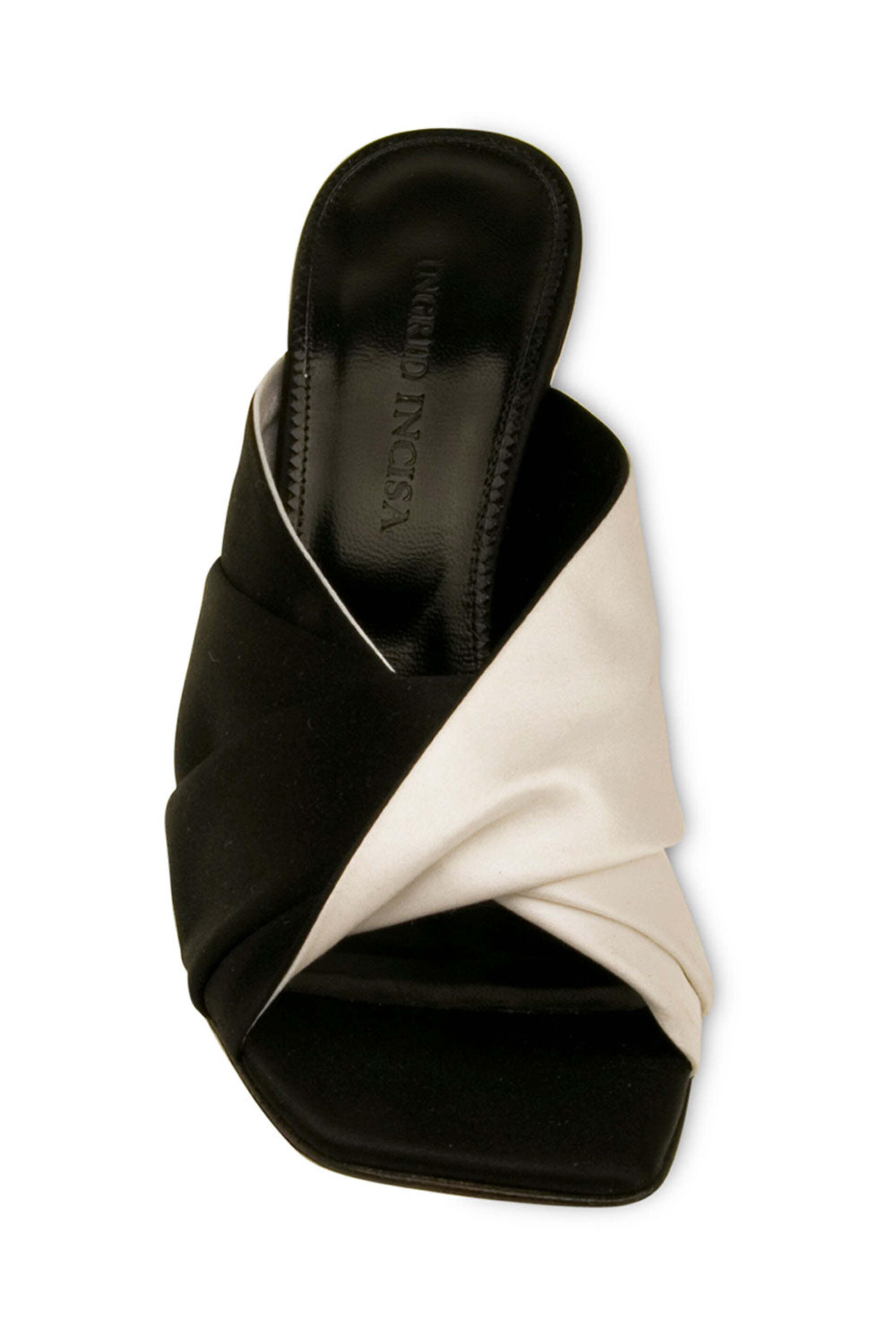 Ingrid Incisa Filippa Sandal in Black and White. Open square toe. Twisted two-tone strap. Slip on. 4.25 flared heel. Satin upper. Leather lining and sole. Handmade in Italy.