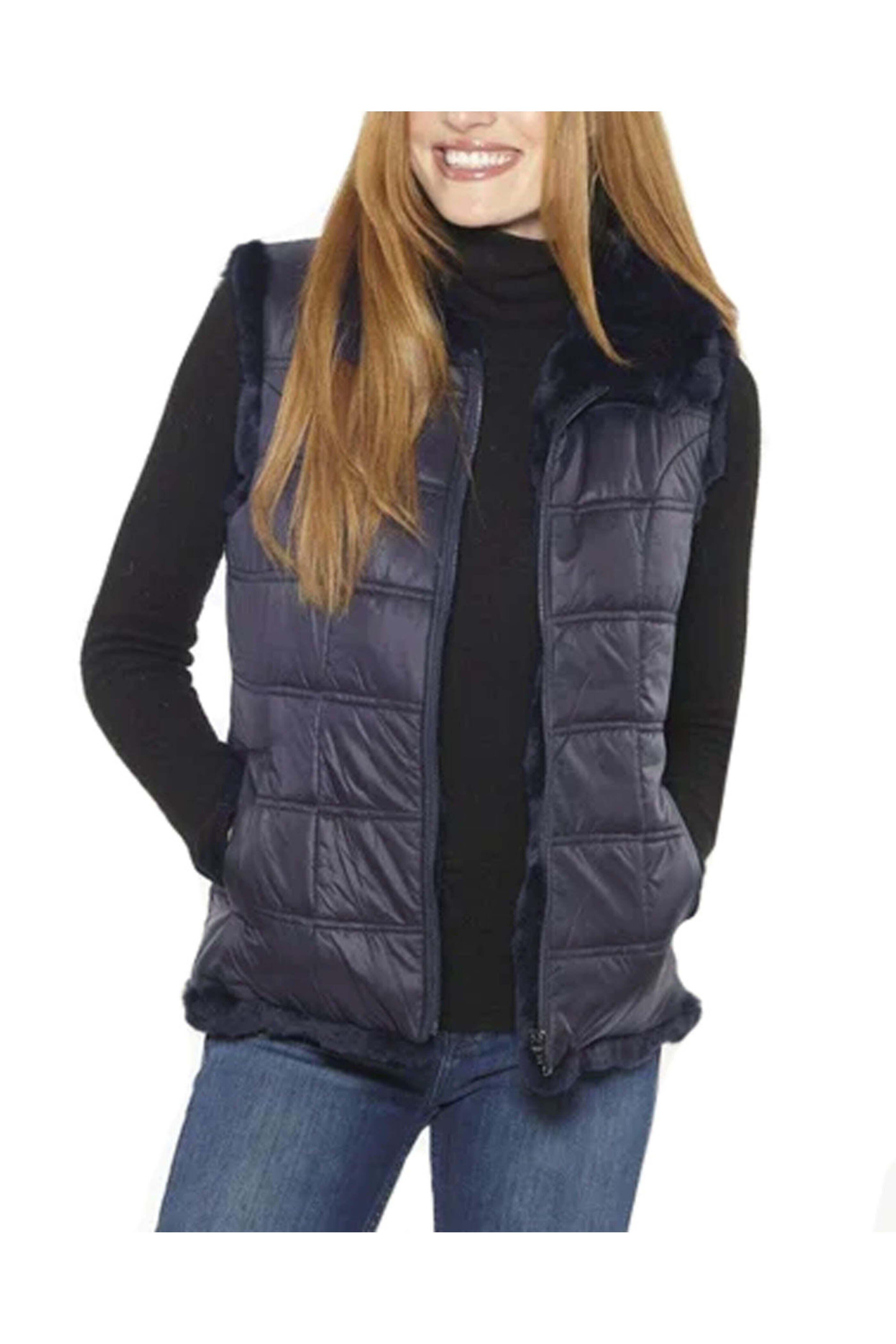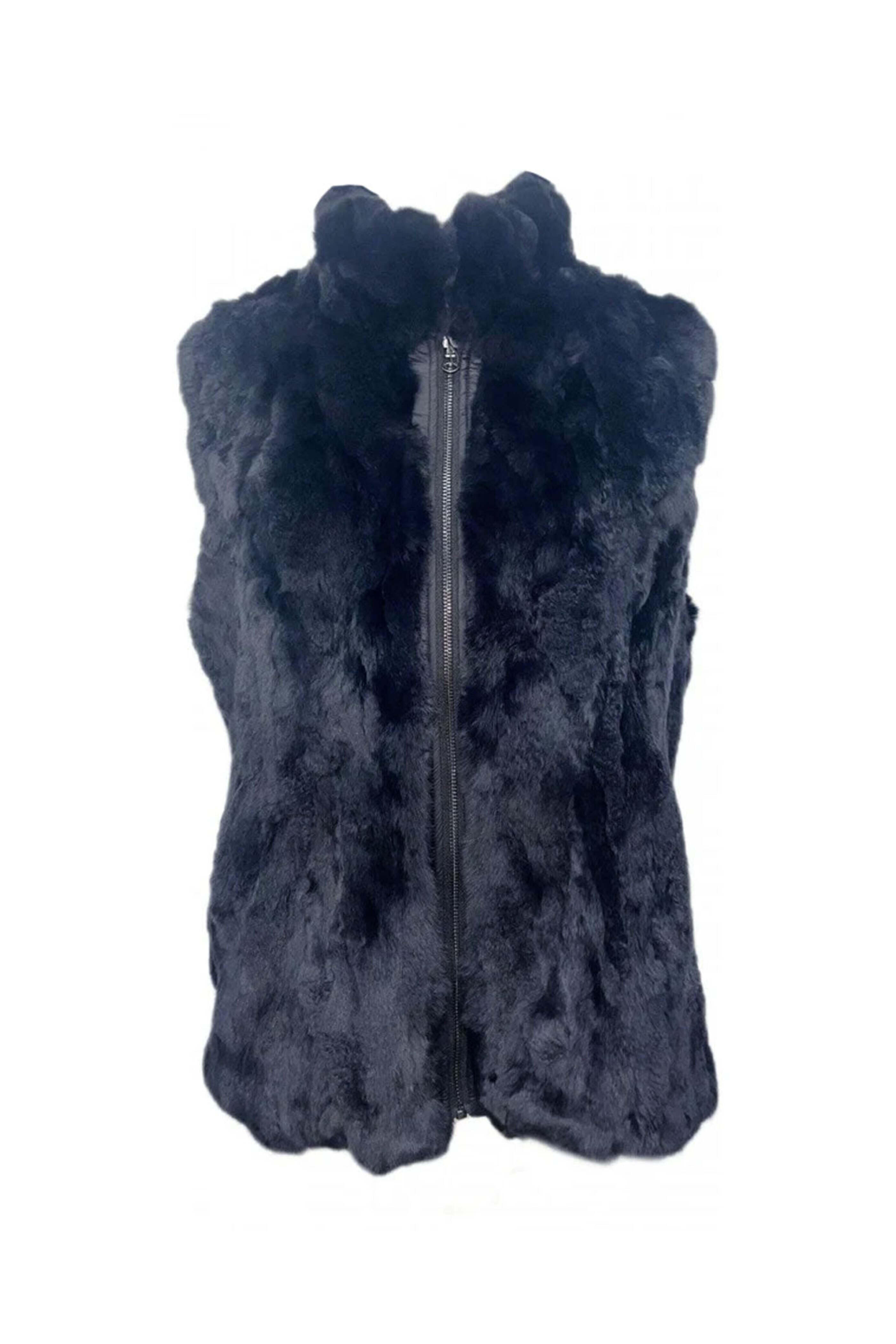 Linda Richards Reversible Rex Rabbit Vest in Navy. Zip closure. Sleeveless. Two side pockets. Hip length. Reversible. Rex rabbit fur.