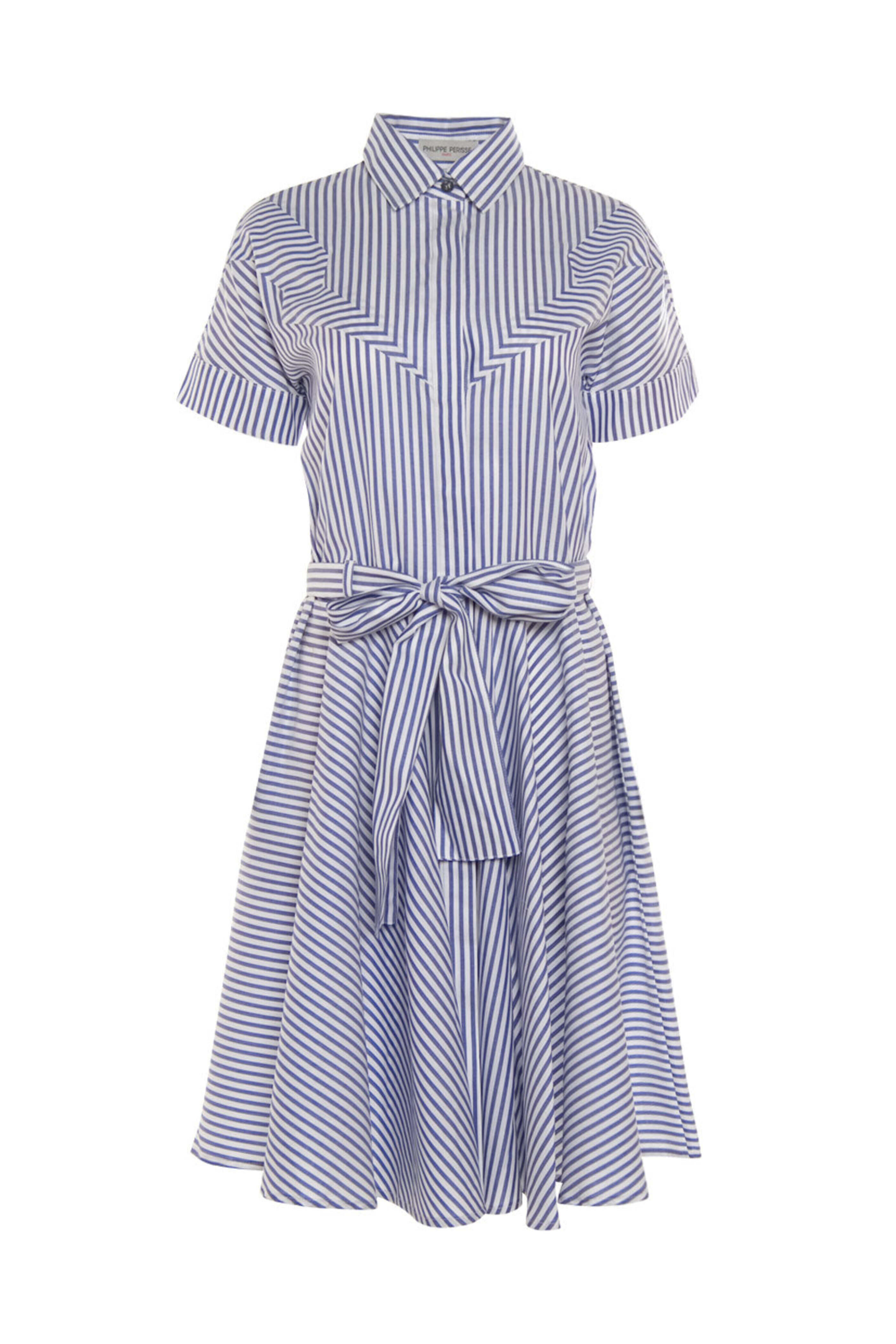 Philippe Perisse Pinstripe Flash Bolt Dress. Collar. Short sleeves. Concealed front button placket. Belt loops. Removable self-tie at waist. Side slip pockets. Full hem. Midi length. Made in Europe. 100% cotton.