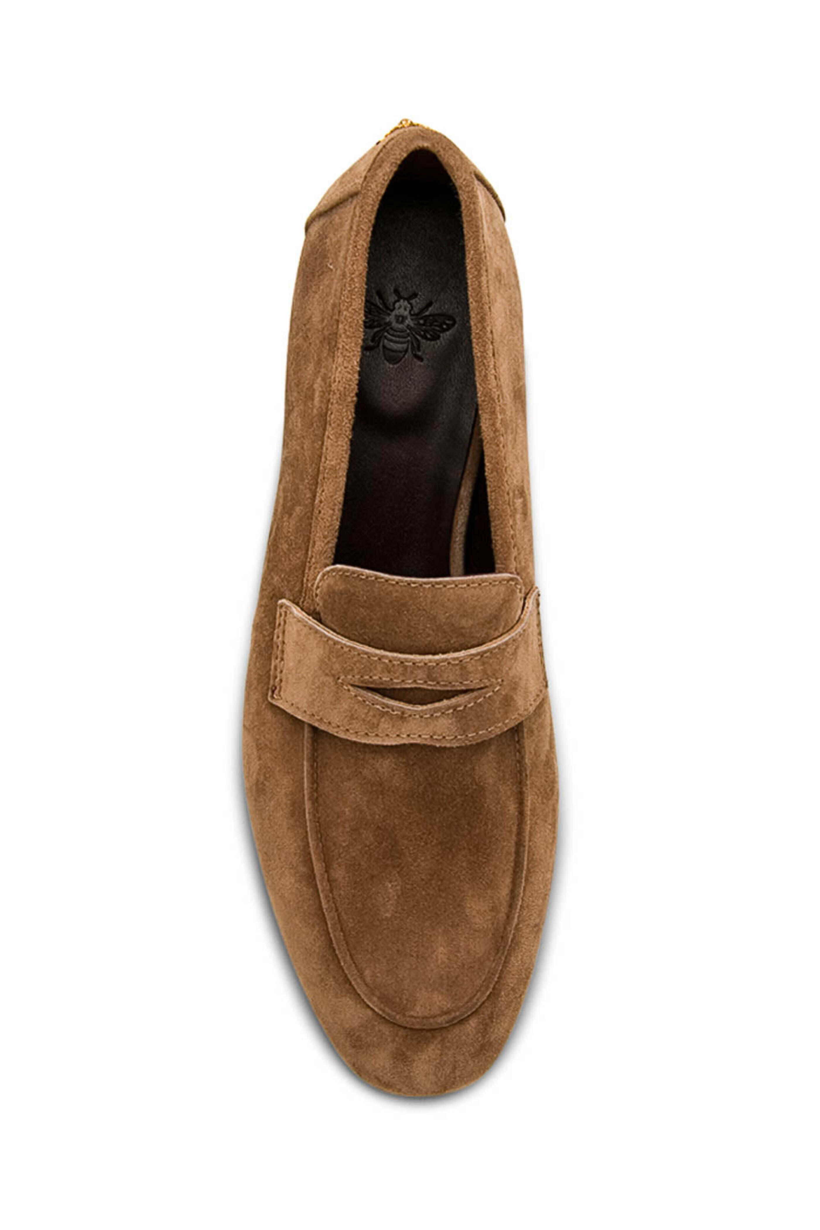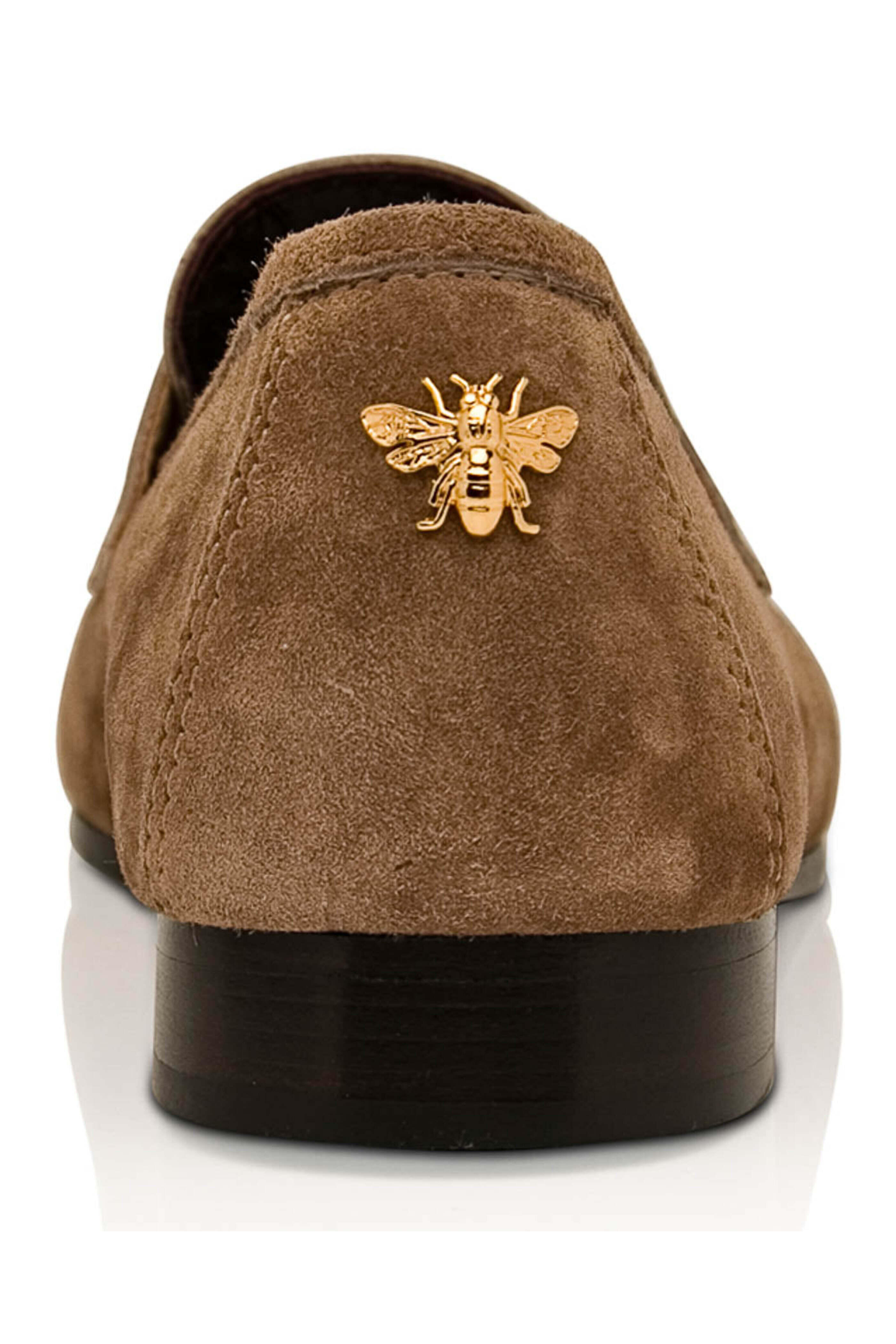 - Bougeotte Beige Suede Park Avenue Loafer Round toe Slip on style Gold tone bee detail at heel Suede upper; leather lining ½ heel Made in Italy