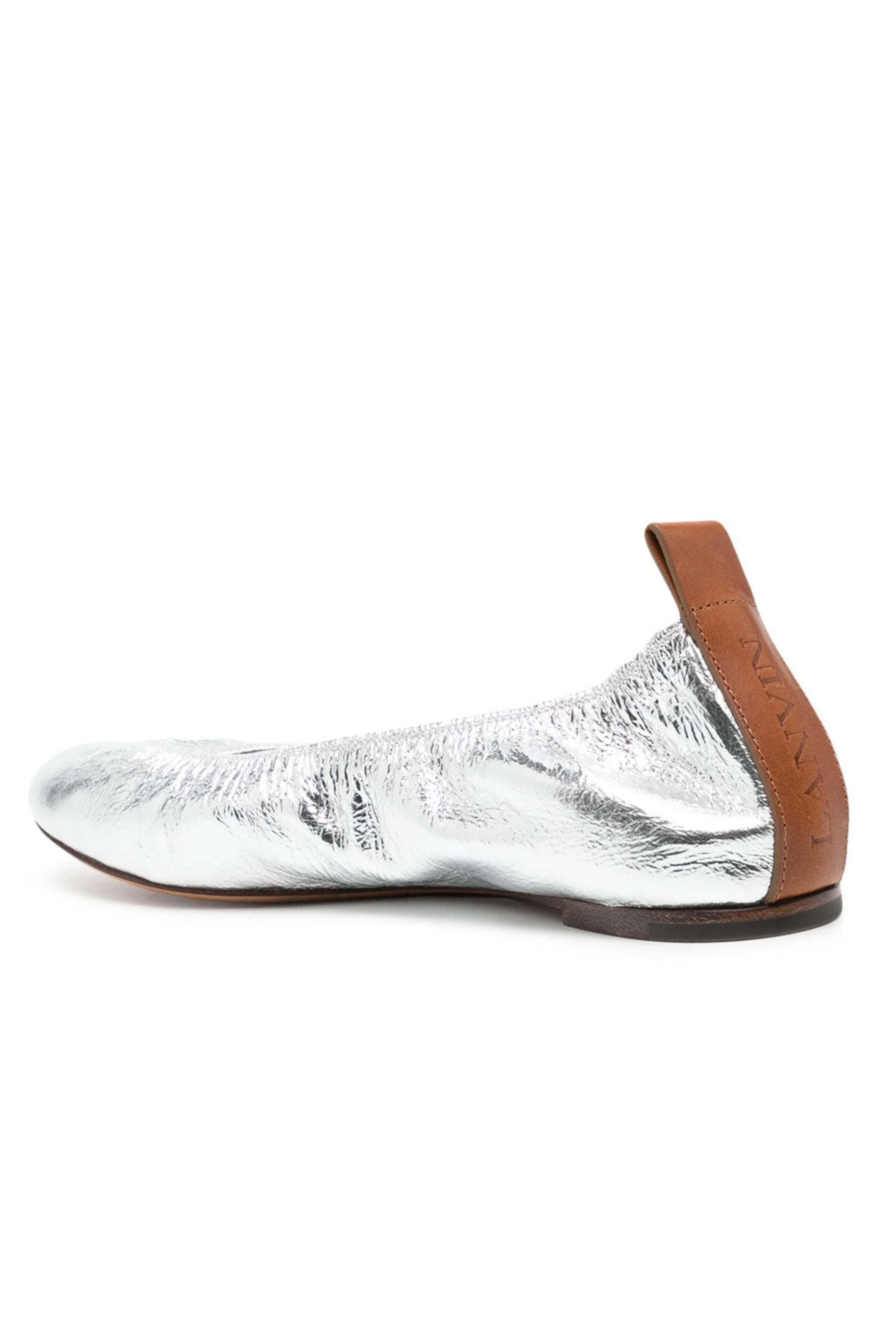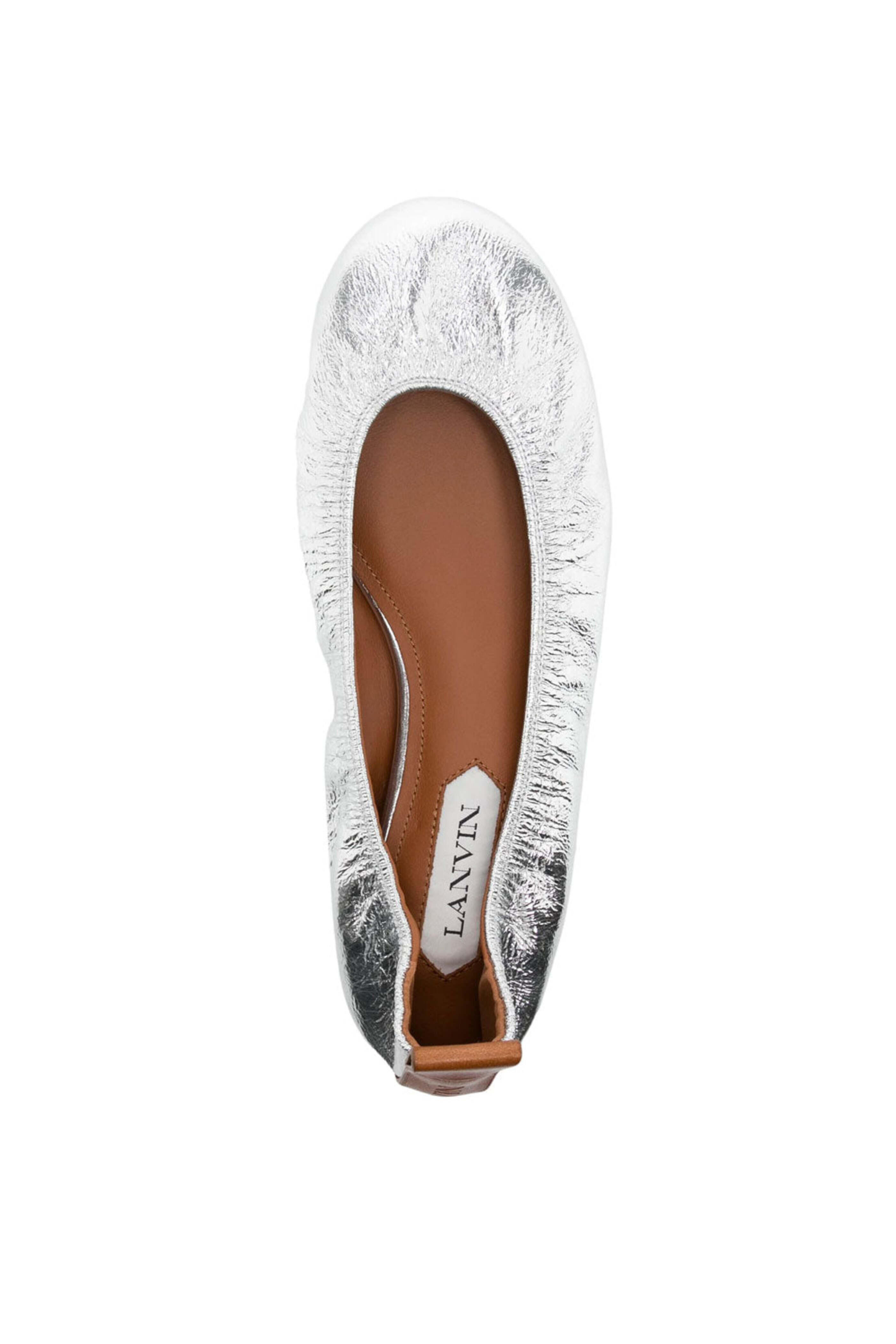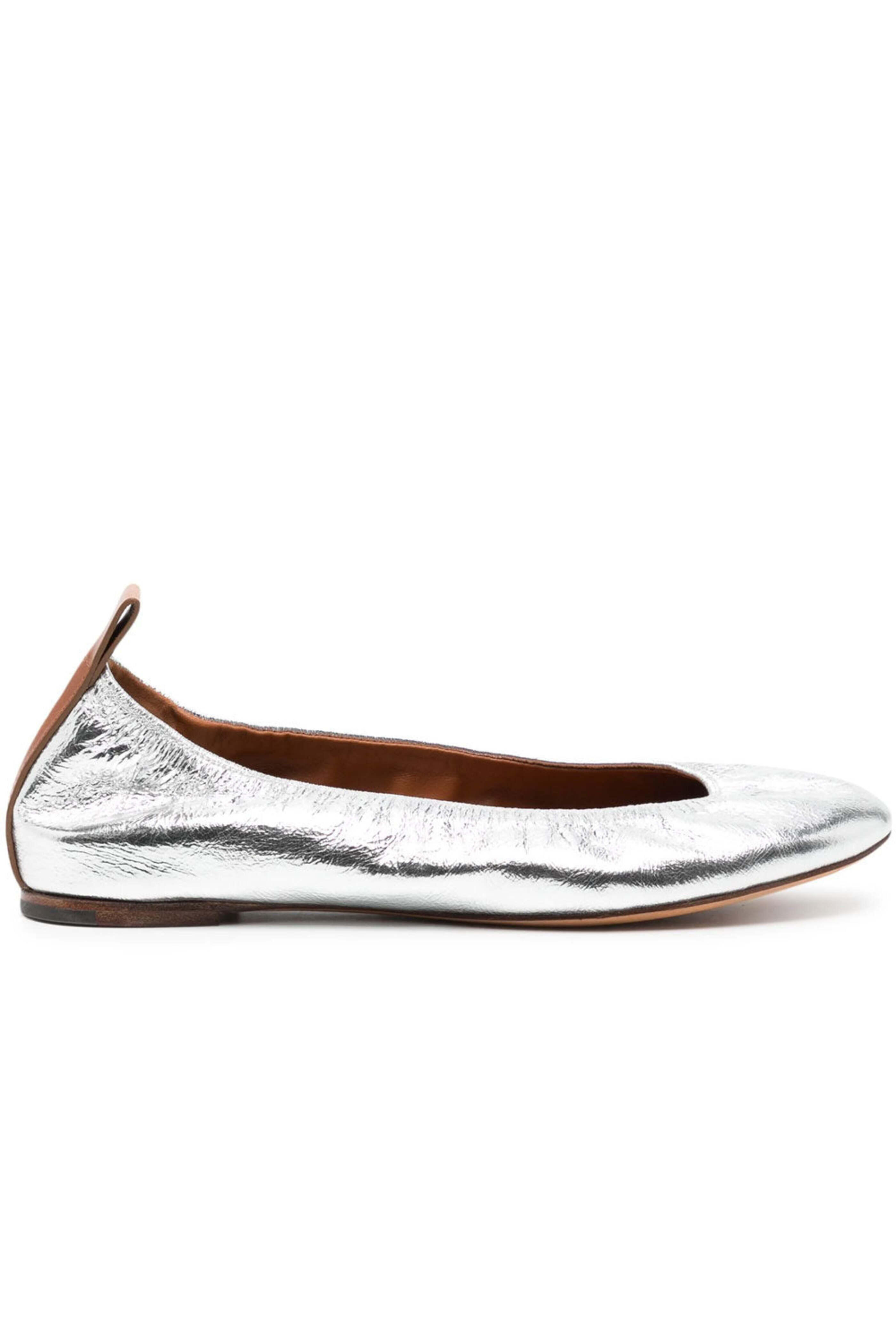 Lanvin Metallic Ballet Flat in Silver. Round closed toe. Slio-on style. Pull-tab at heel. Metallic finish. Leather upper, lining, and sole. Made in Italy.
