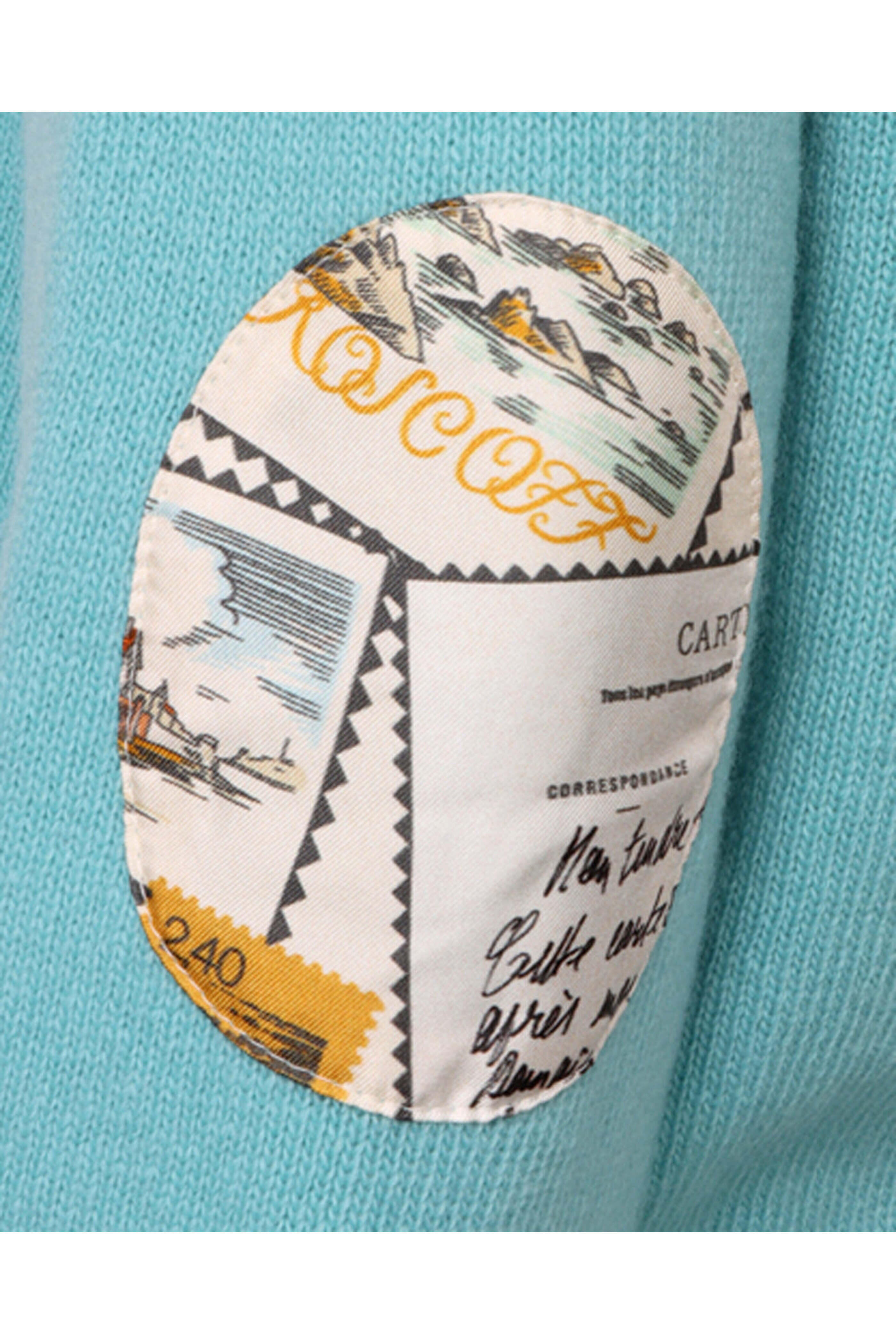 - Long raglan sleeves; carte postale print silk elbow patch detail