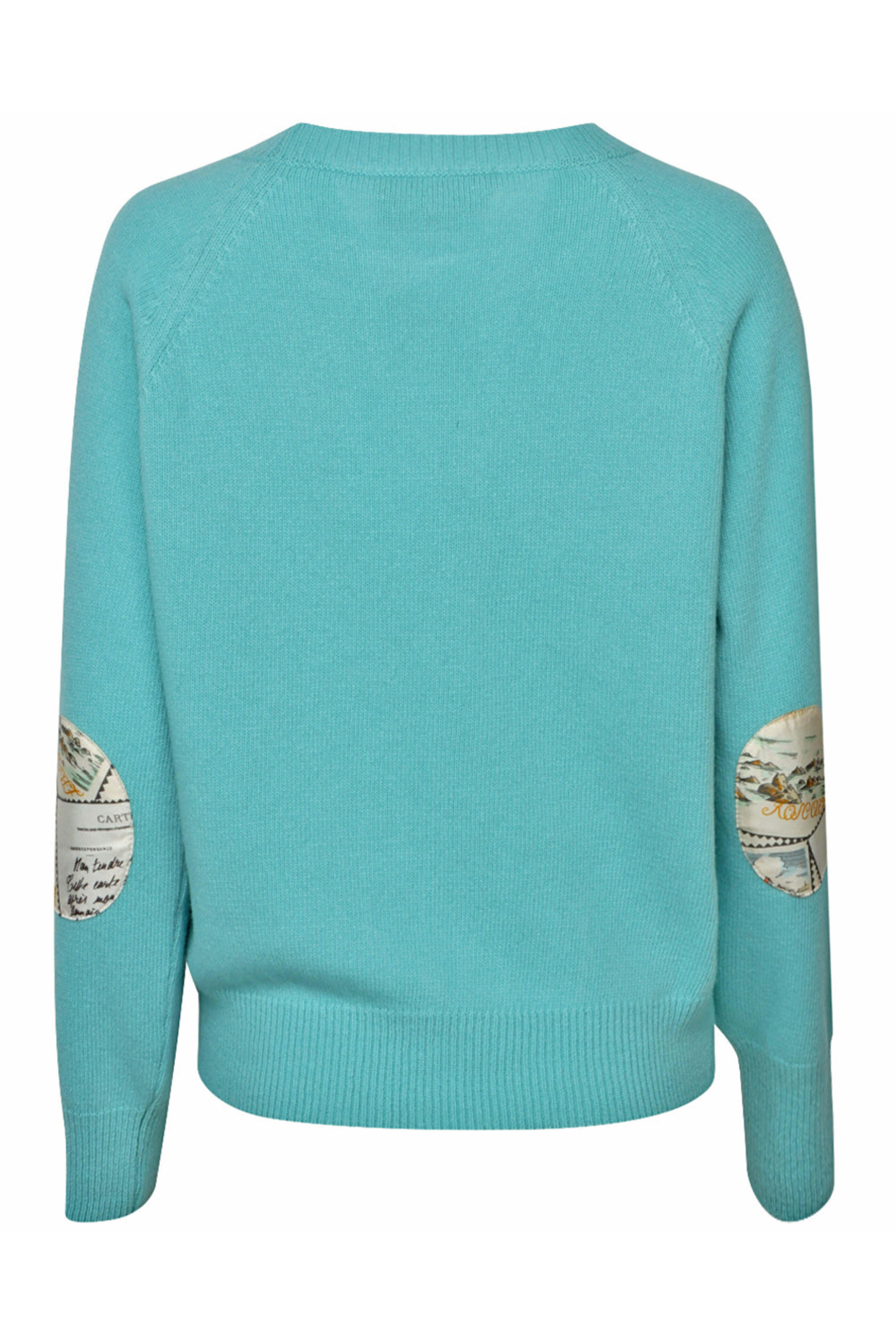 La Prestic Ouiston Gin Carte Postale Ras Du Cou Sweater. Crewneck. Long raglan sleeves; carte postale print silk elbow patch detail. Relaxed fit. Ribbed neck, cuffs, and hem. 100% wool outer, 100% silk detail.