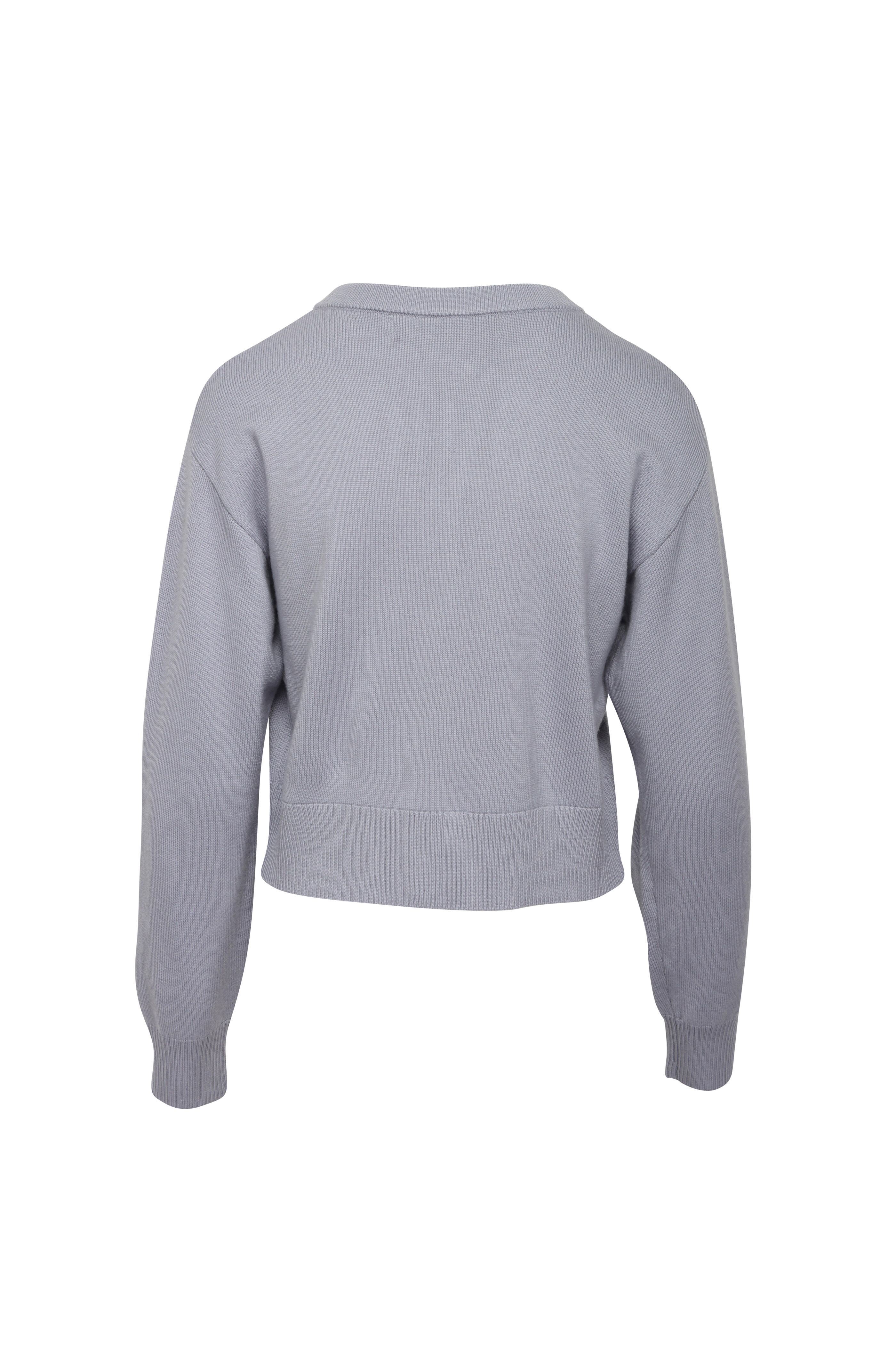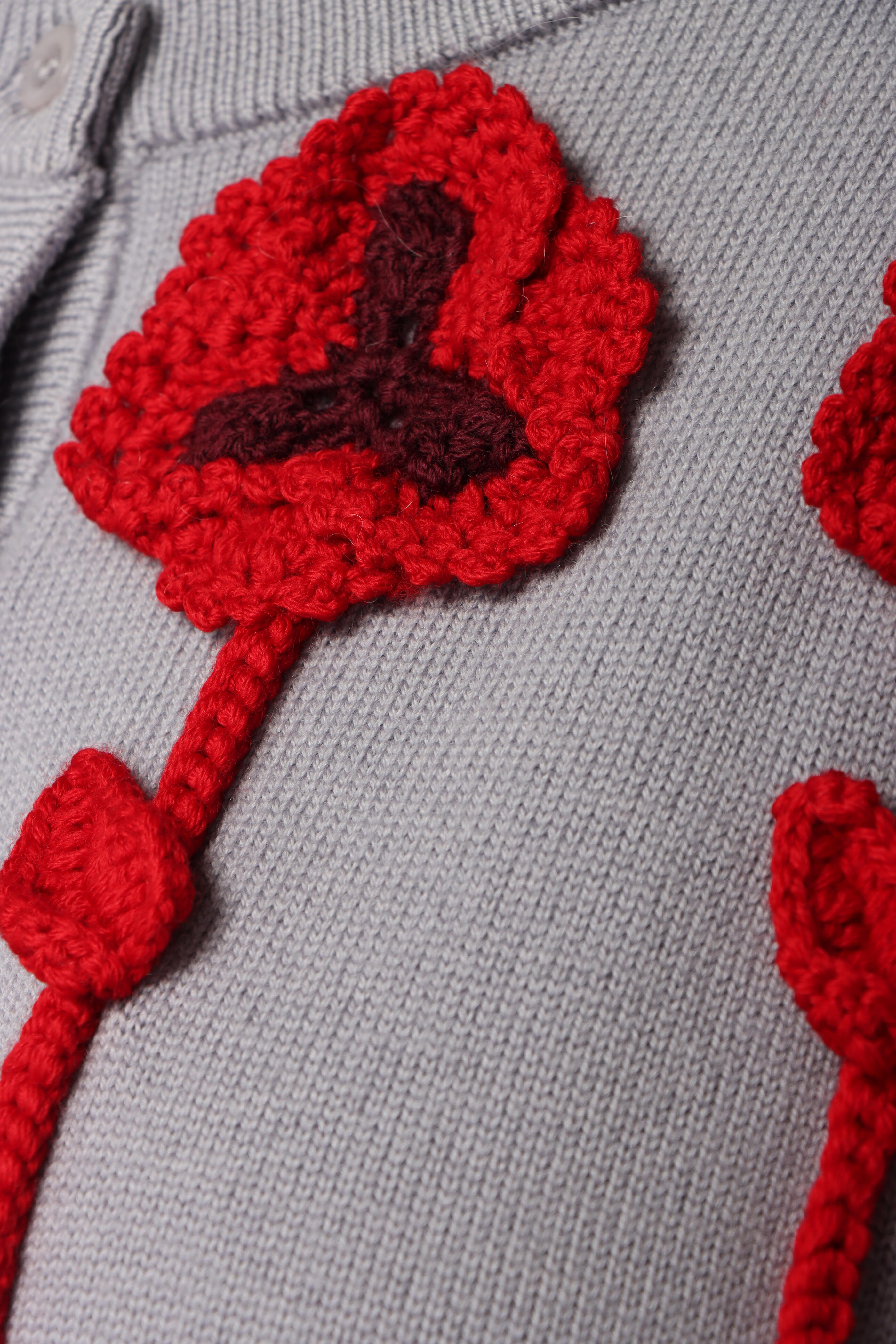 Round neck. Drop shoulders. Long sleeves. Button front closure. Boxy fit. Crochet flower detail. Rib cuffs, hem, and trim. Imported. 100% merino wool. Dry clean.