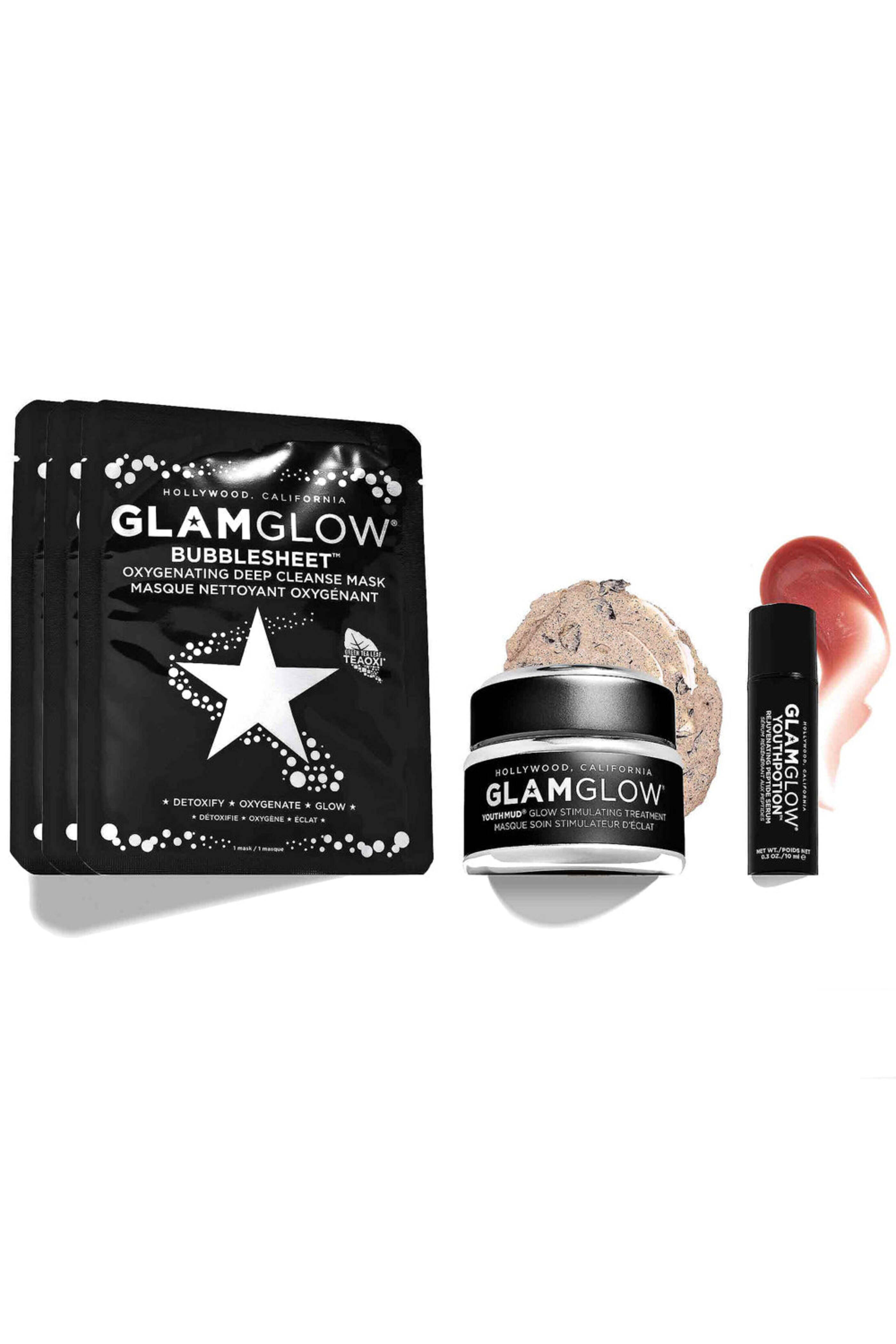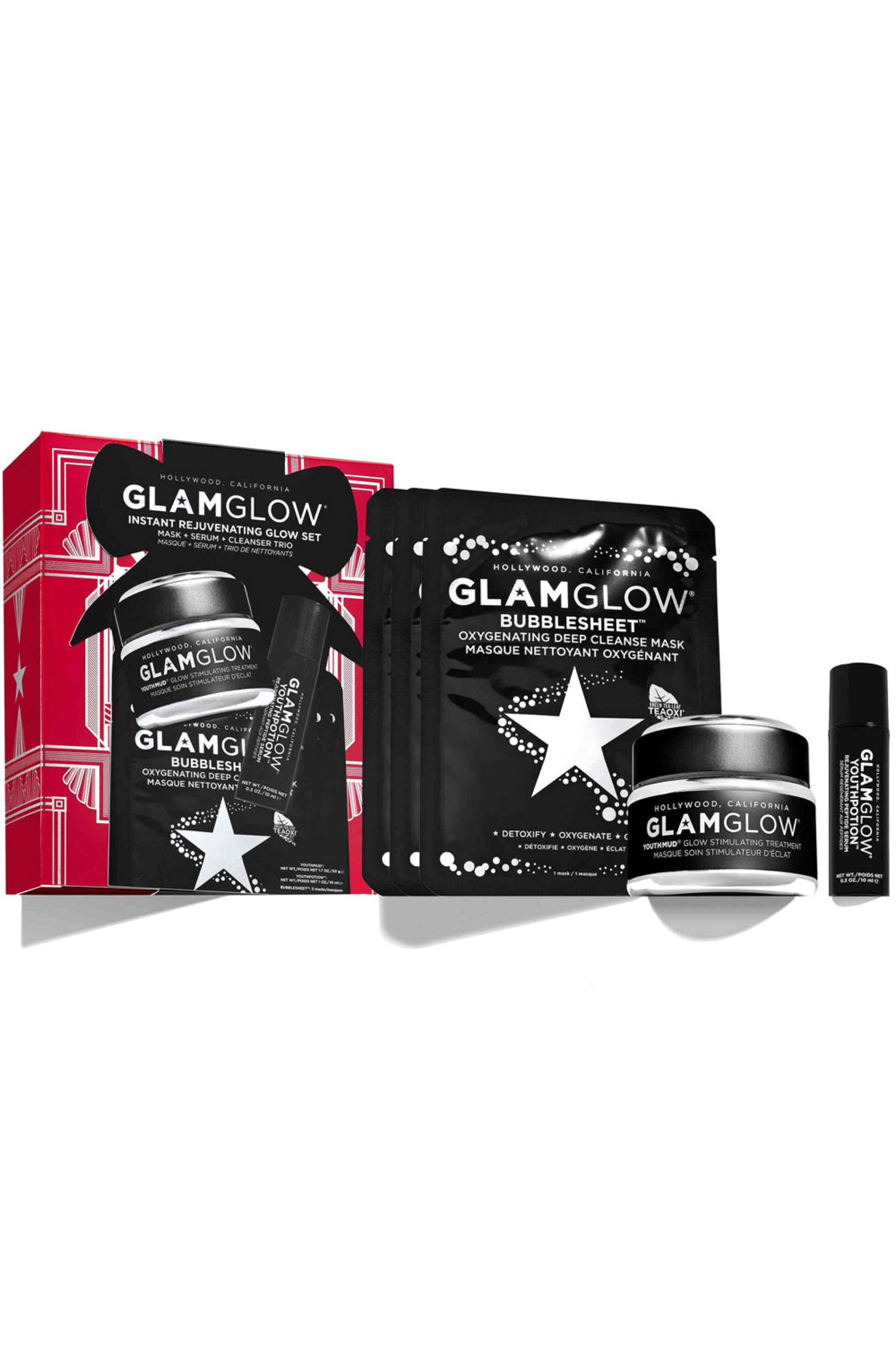 - Glam Glow Instant Rejuvenating Glow Set Includes: YOUTHPOTION Peptide Serum: works to smooth the appearance of skin. Apply to a clean~ dry face morning and night. Follow with a moisturizer. 1 oz YOUTHMUD Glow Treatment: exfoliates~ revealing the appearance of younger-looking skin. Leave on up to 10 minutes. Product will tingle. Remove with water in circular motions. Use twice a week or as desired. Follow with a moisturizer. 1.7 oz 3 BUBBLESHEET Oxygenating Deep Cleanse Sheet Masks: Try the mask as a one-and-done cleansing step to remove a full face of makeup. Place mask on damp face and align the eye and nose area. Leave on for approximately three minutes. Remove mask and gently massage face. Rinse face clean. (3) 1 oz sheets