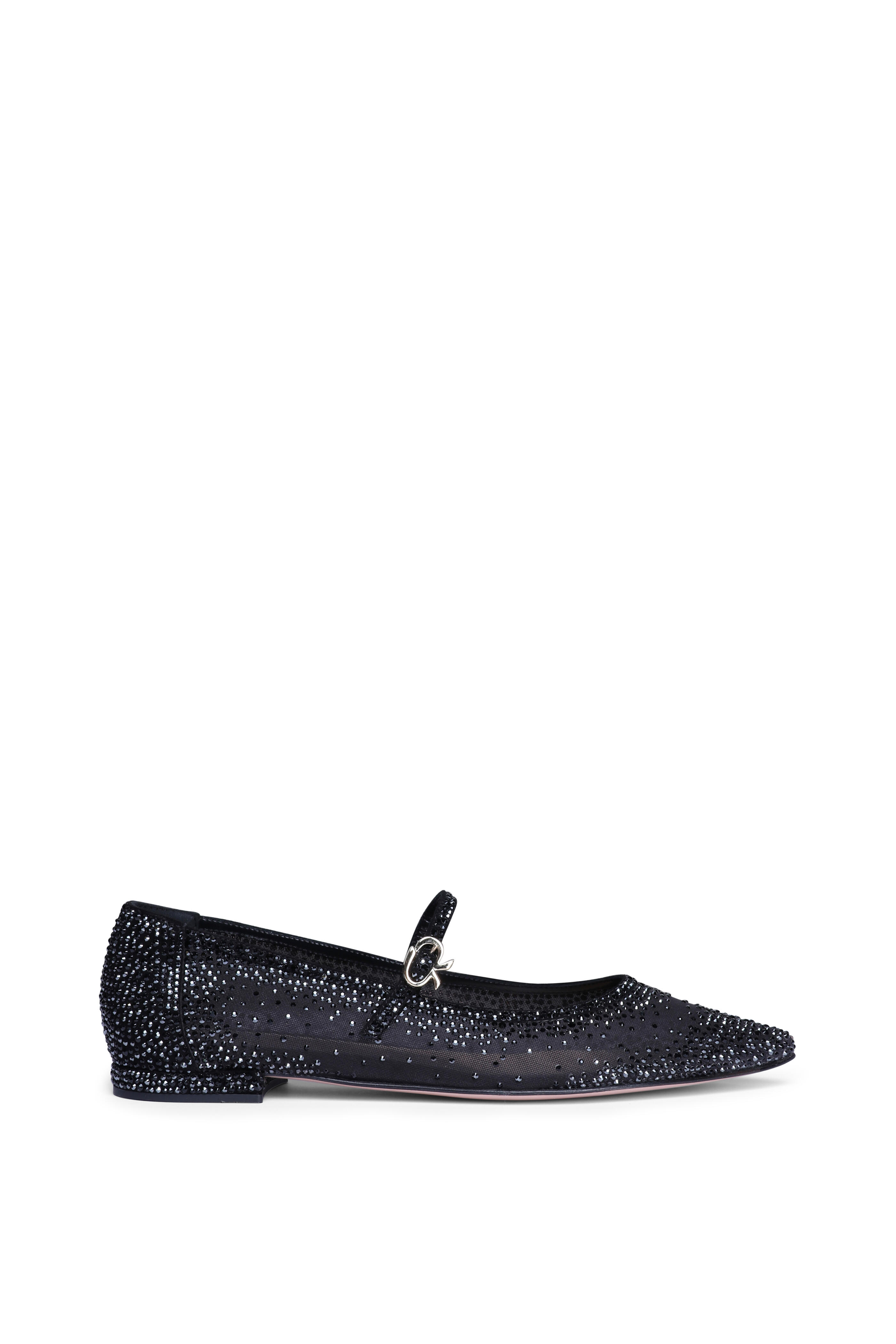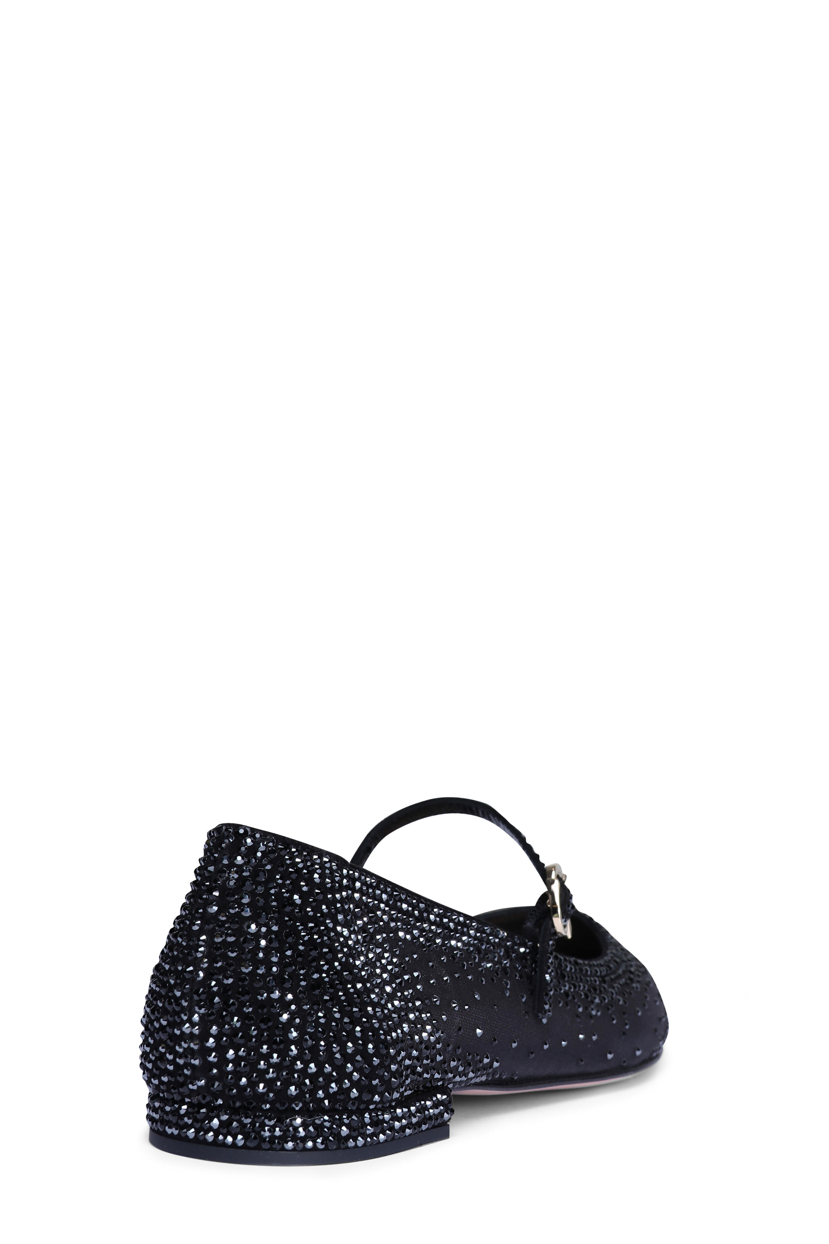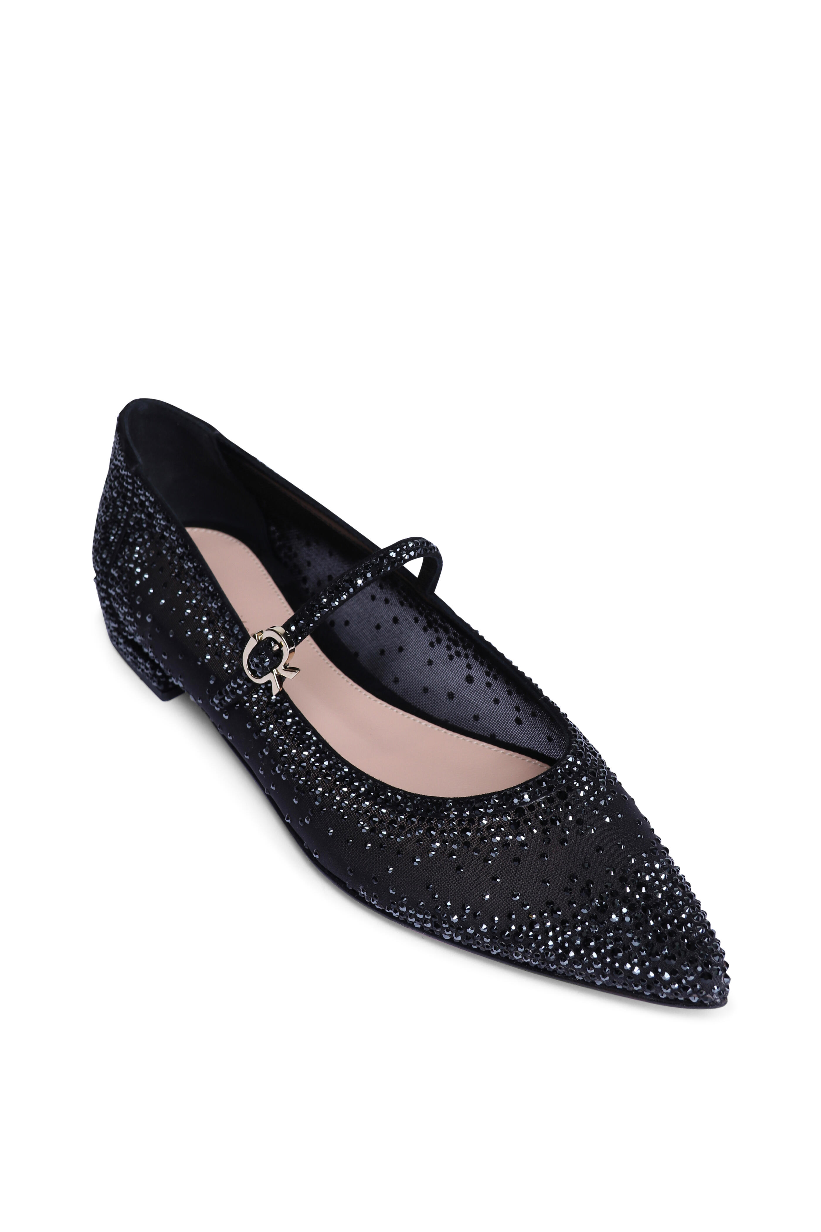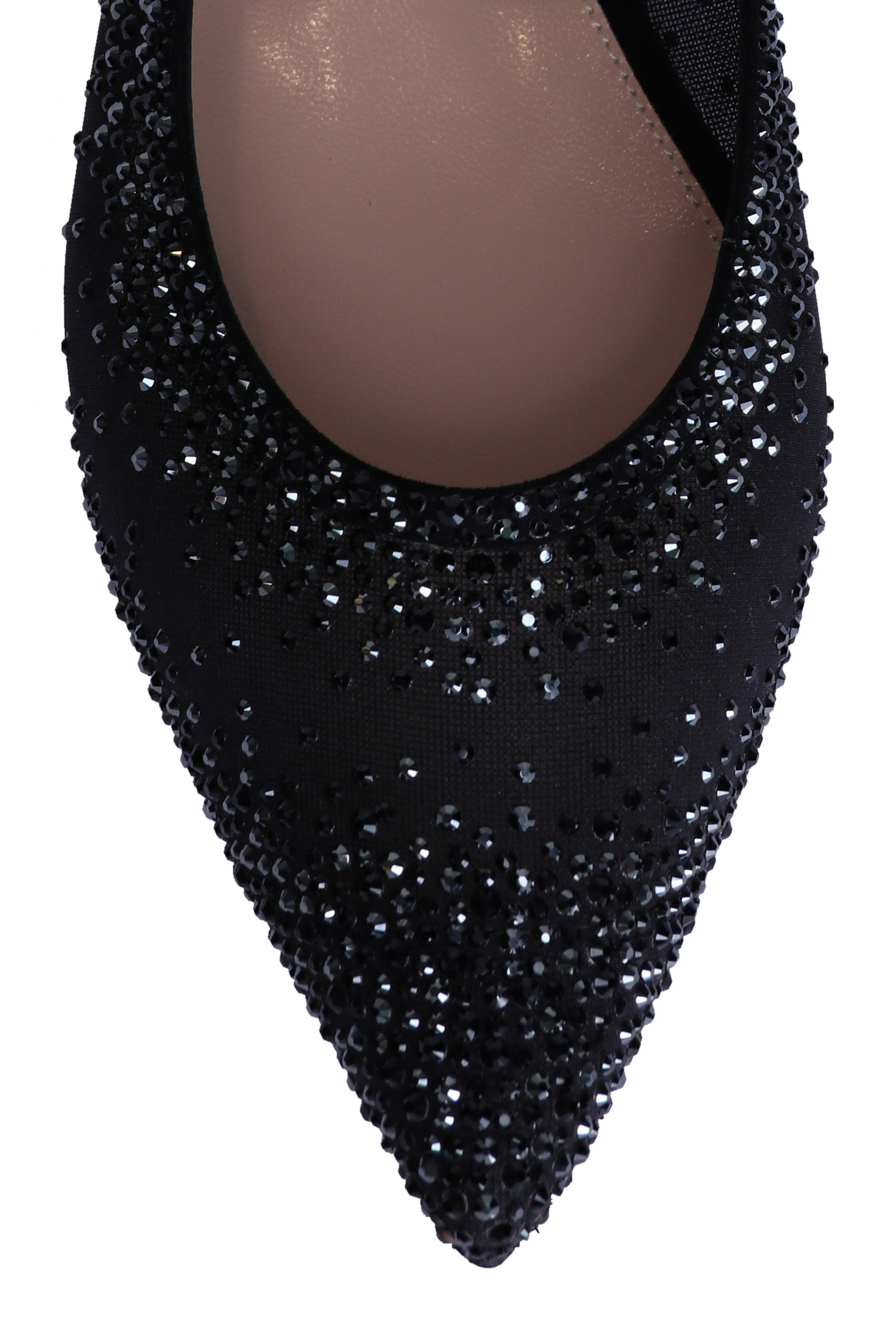 Embellished fabric upper. Leather lining and sole. Pointed toe. Buckle fastening. Slip-on style. Crystal embellishments. Made in Italy. Heel measurement: 5mm.