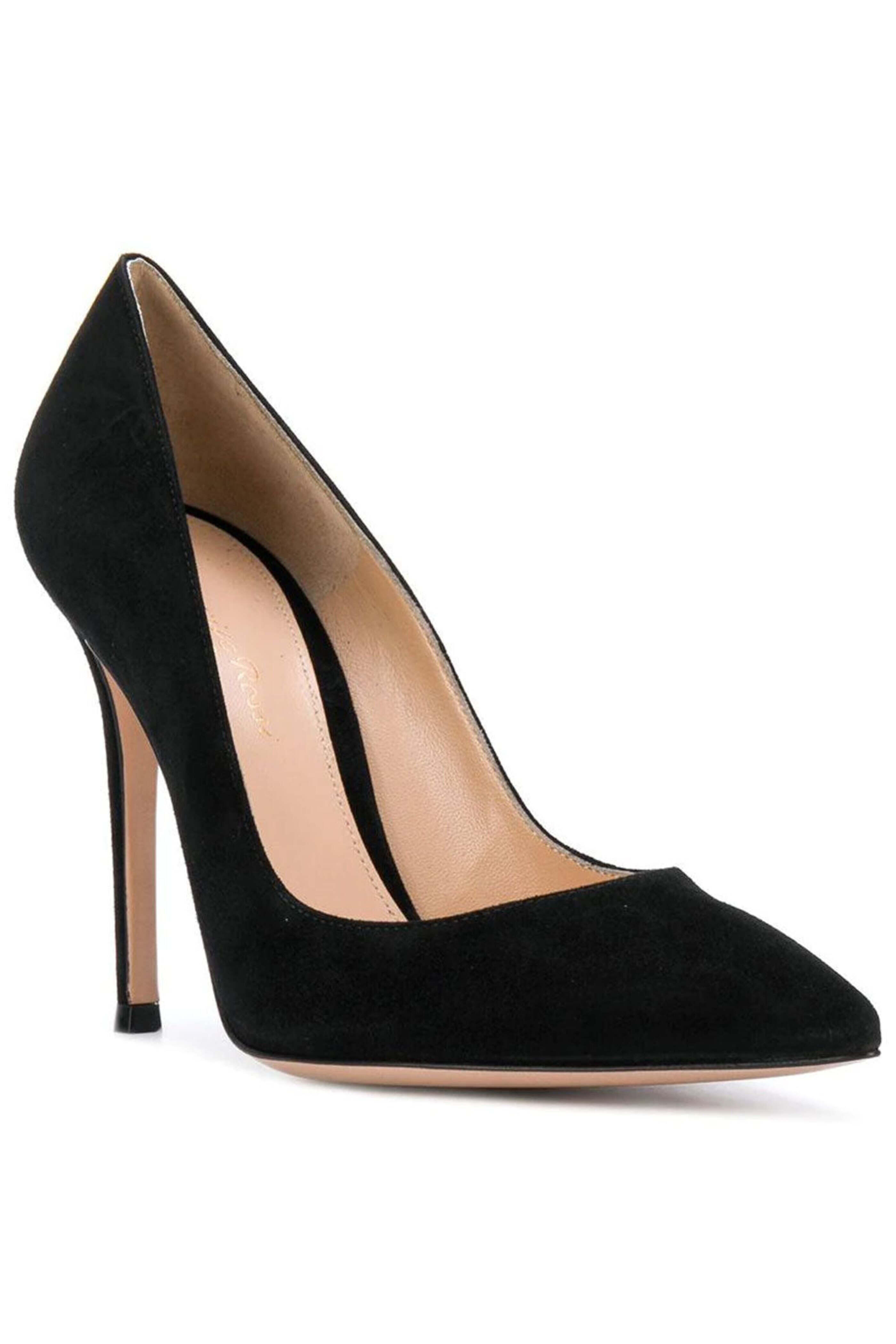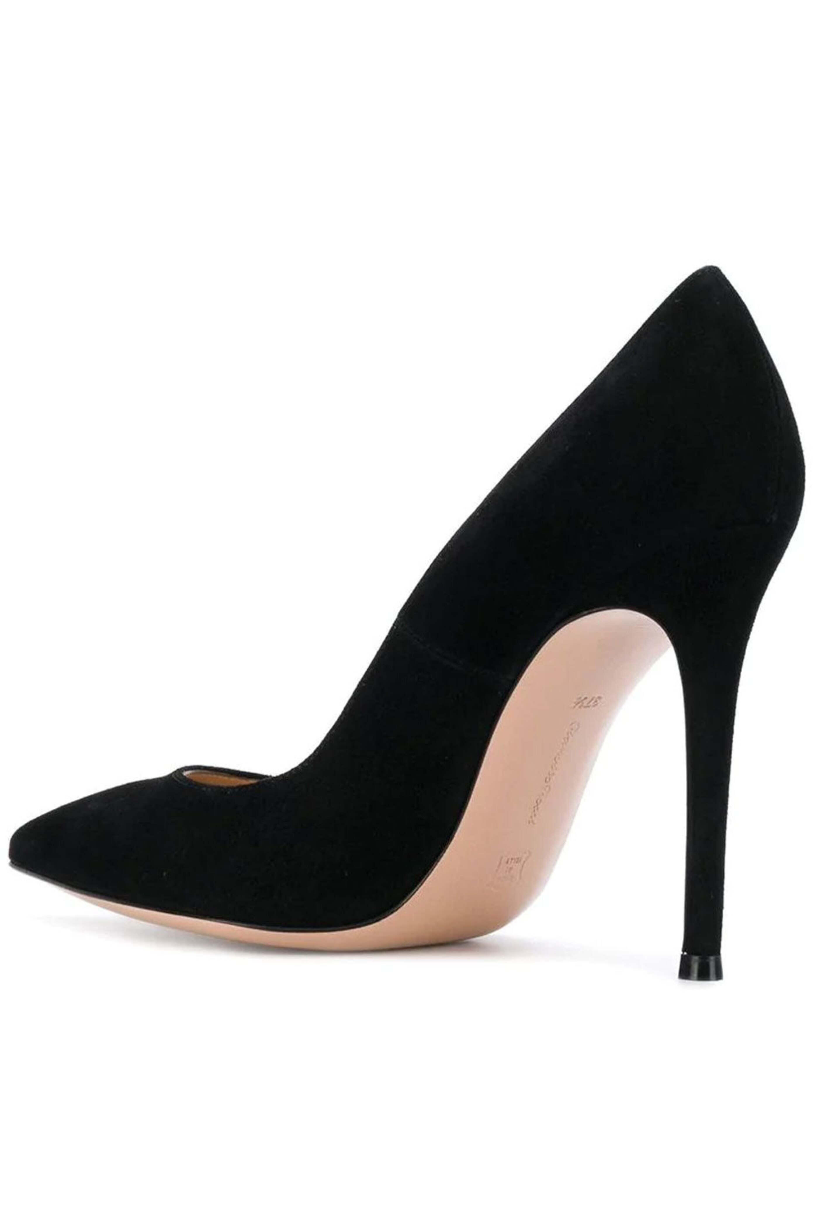 Gianvito Rossi 105 Suede Pump in Black. Pointed toe. Slip on. 4.13 covered stiletto heel. Suede upper. Leather lining and sole. Made in Italy.