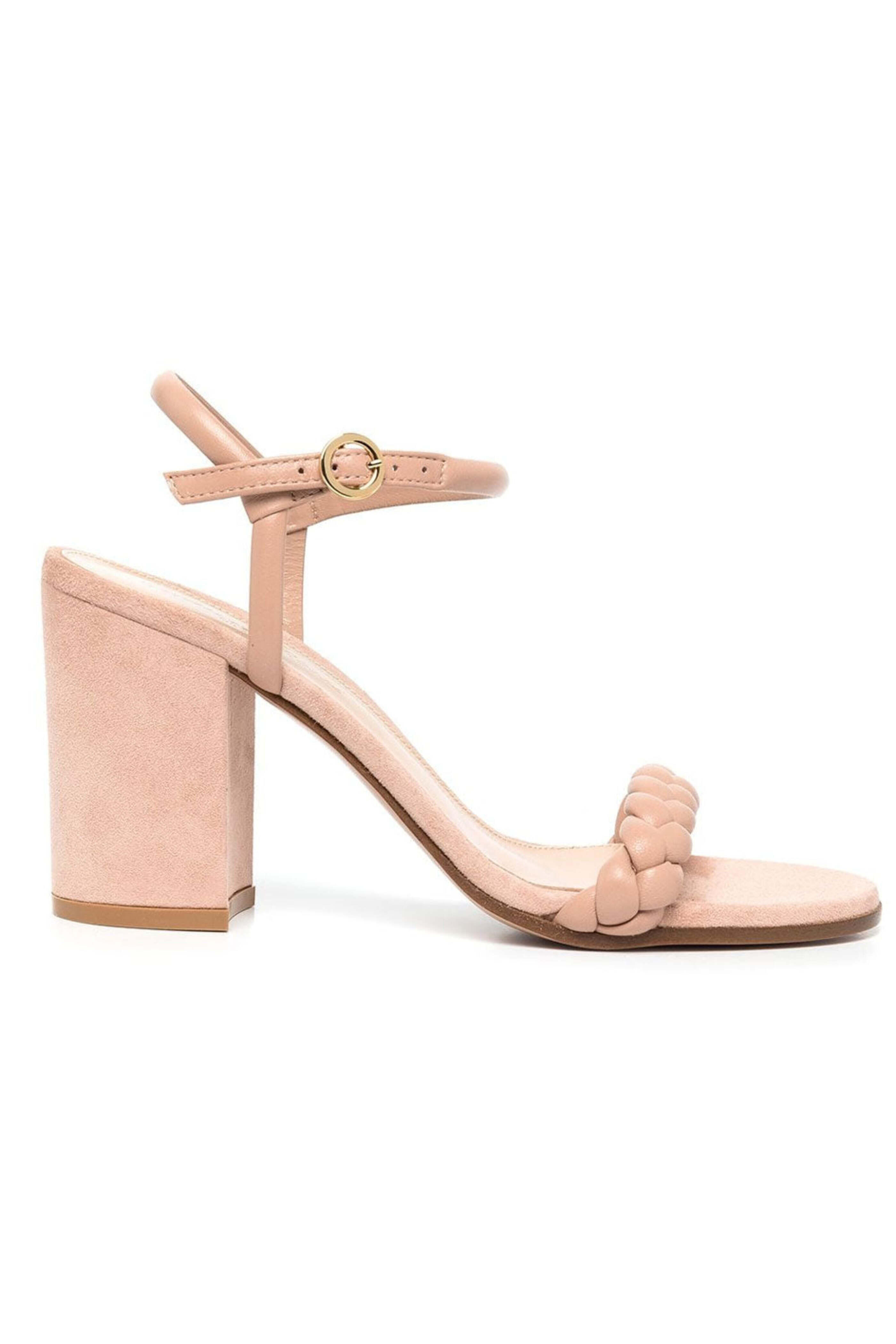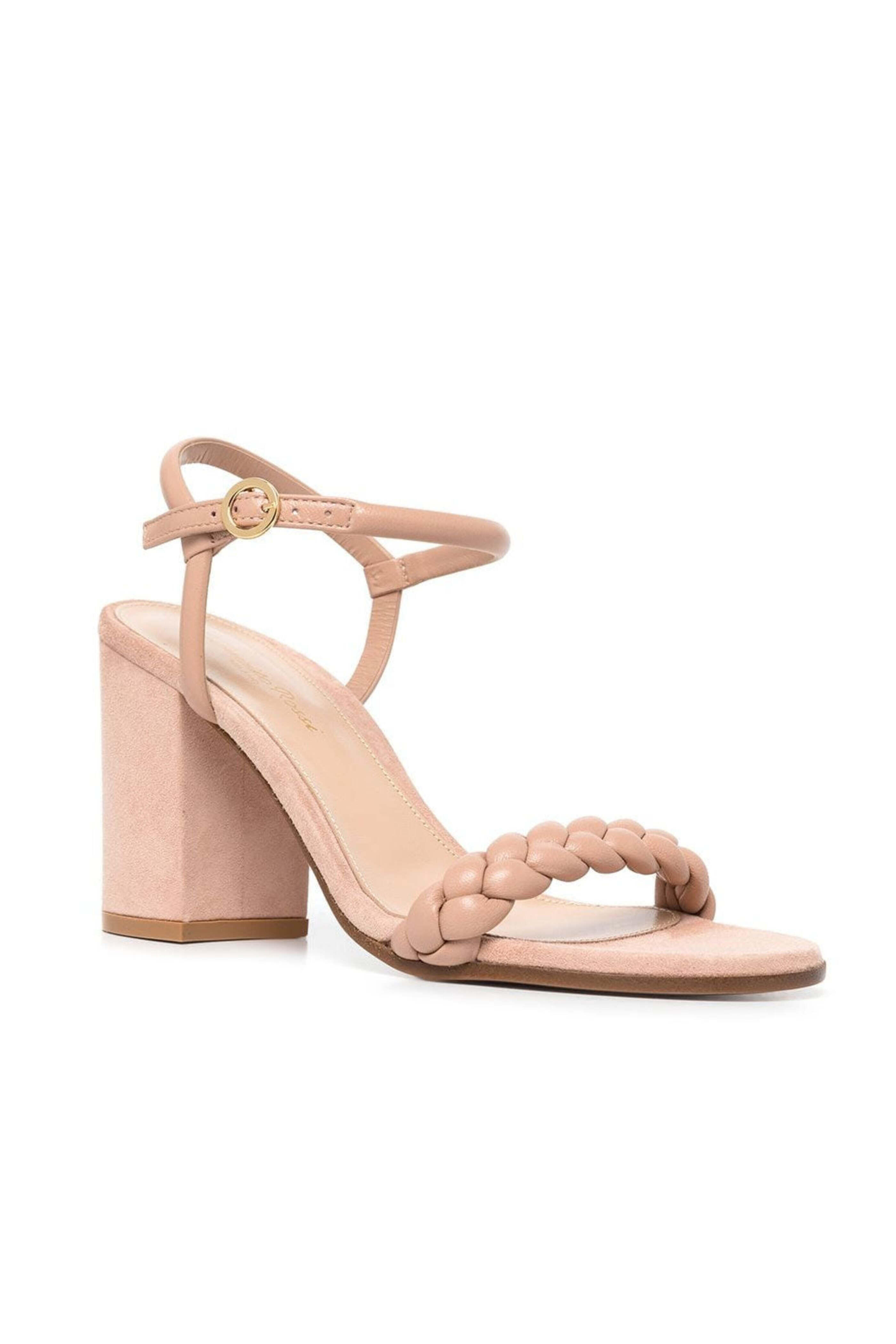 Gianvito Rossi Cruz 60 Block Heel in Peach. Round open toe. Ankle buckle strap. 2 (60 mm) block heel. Braided leather vamp. Gold hardware. Leather upper. Leather lining. Leather sole. Made in Italy.
