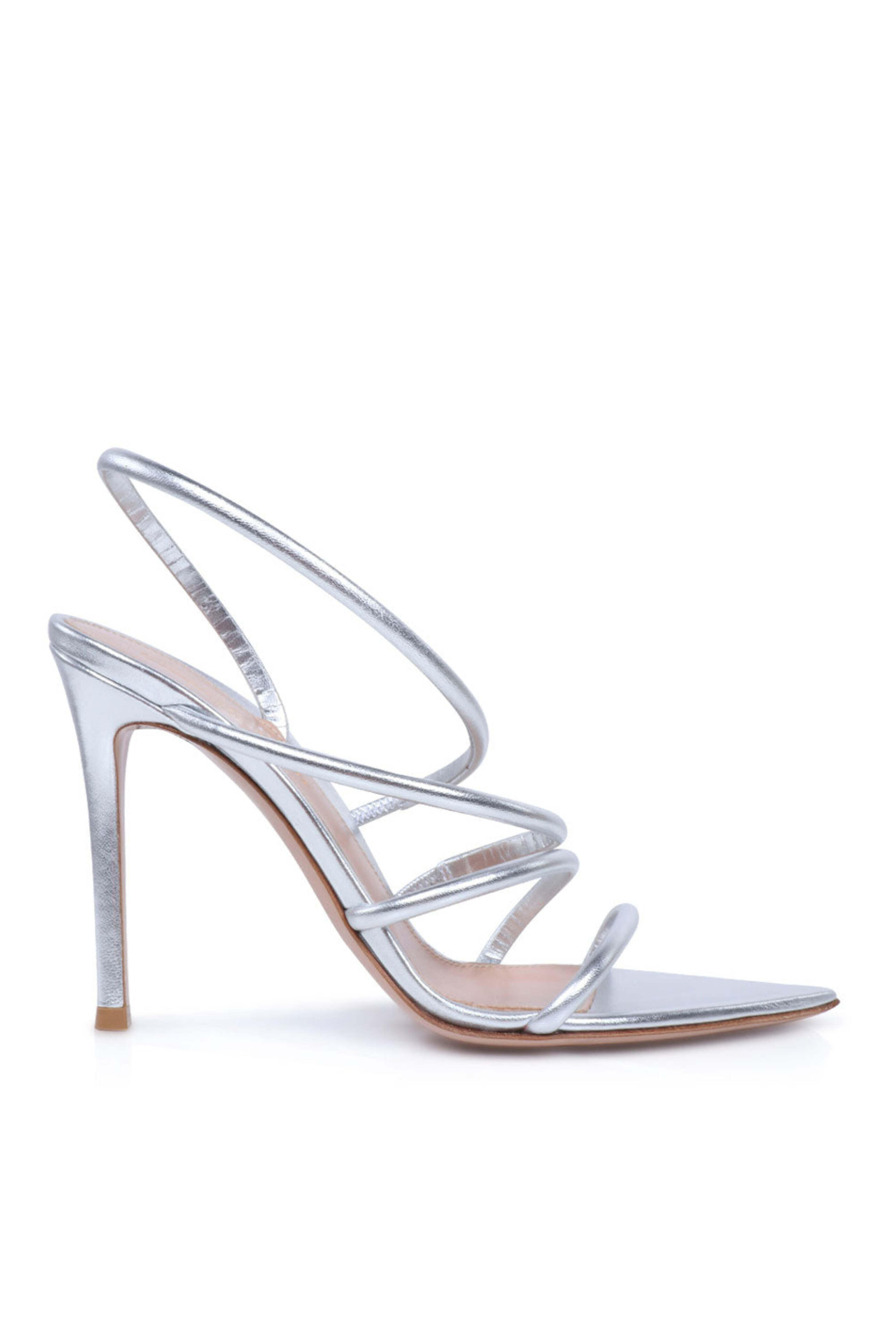 Gianvito Rossi Ettie Sandal in Silver. Pointed toe. Multistrip style. Asymmetric leather strap. Leather upper, lining, and sole. 4.1 (105mm) stiletto heel. Made in Italy.